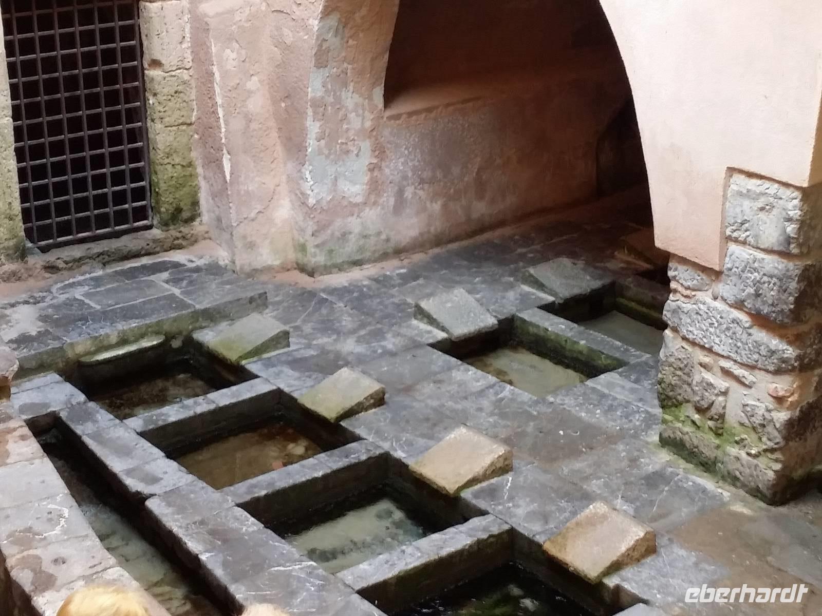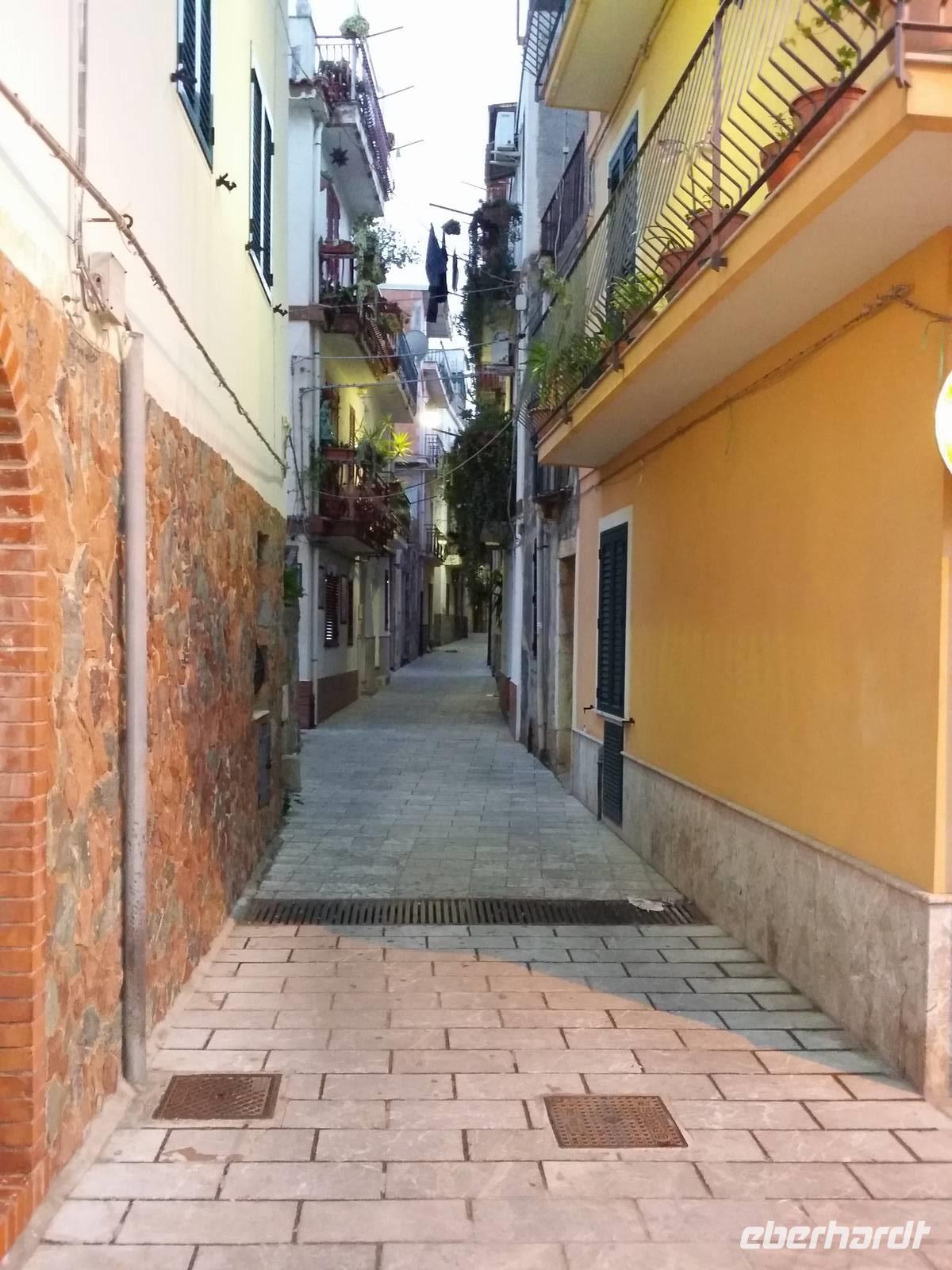 Sant'Angelo Muxaro ist eine gepflegte Ortschaft. Sie begrüßt uns mit dem Besuch einer Käserei, mit kurzer Verköstigung, mit der Beschau von Spezereien und mit der ganzjährig geöffneten Weihnachtskrippe. Pier Filippo weiß um Emigrantenzahlen und spricht etwa von achthundert Auswanderern in "Markgroning", also in Markgröningen. Ein wenig traurig ist die Auskunft, inspiriert sie sich doch am Klang der örtlichen Sterbeglocke: Auch Todesfälle in der Fremde haben ihre Zuträgerschaften bis in die Heimat. Wir unsererseits haben ein wenig Anteil am Leben von Sant'Angelo Muxaro, indem wir uns in einem eng gedrängten Vorhof zum Mittagessen niederlassen.