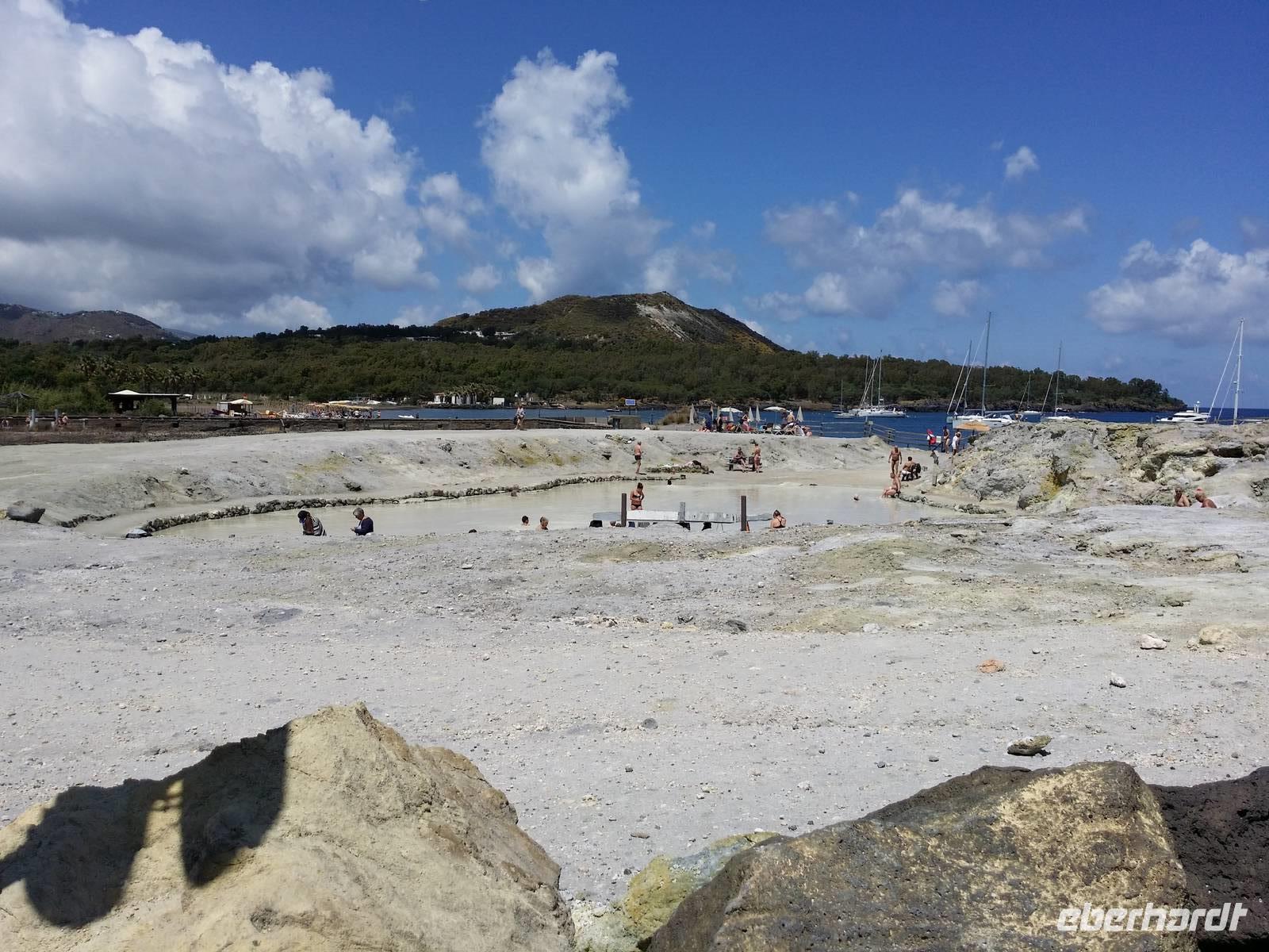 Vulcano stinkt uns entgegen. Unweit der Anlegestelle, hinter einem von gelblichem Felsen flankierten Straßendurchbruch, findet sich das Schwefelbad. Wer zur Rundfahrt in ein Taxi steigt, fühlt sich dennoch in den Duft von Eukalyptusbäumen entführt und steuert die schönsten Aussichtspunkte an. Nur in einiger Entfernung sieht man den Schwefeldampf am kahlen Vulkanauswurf, dass man darinnen eine Mythengestalt mit einer Schaufel vermuten möchte.