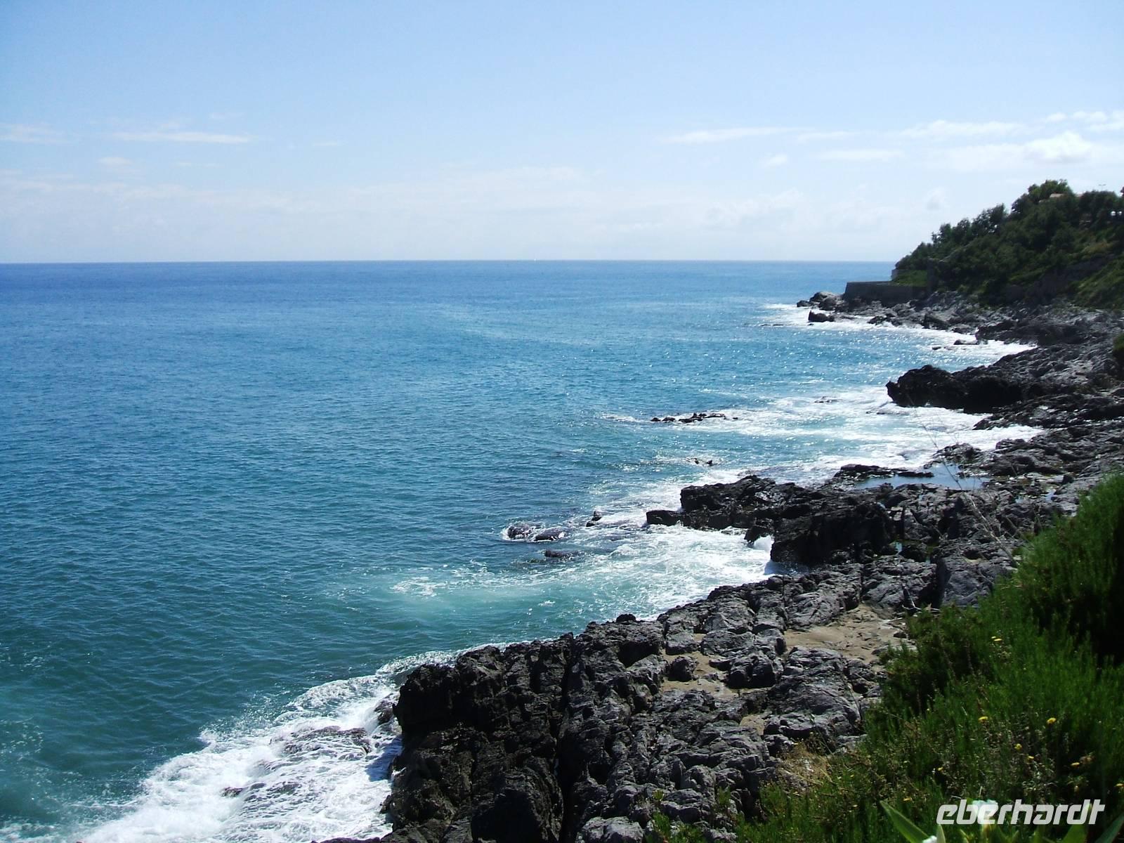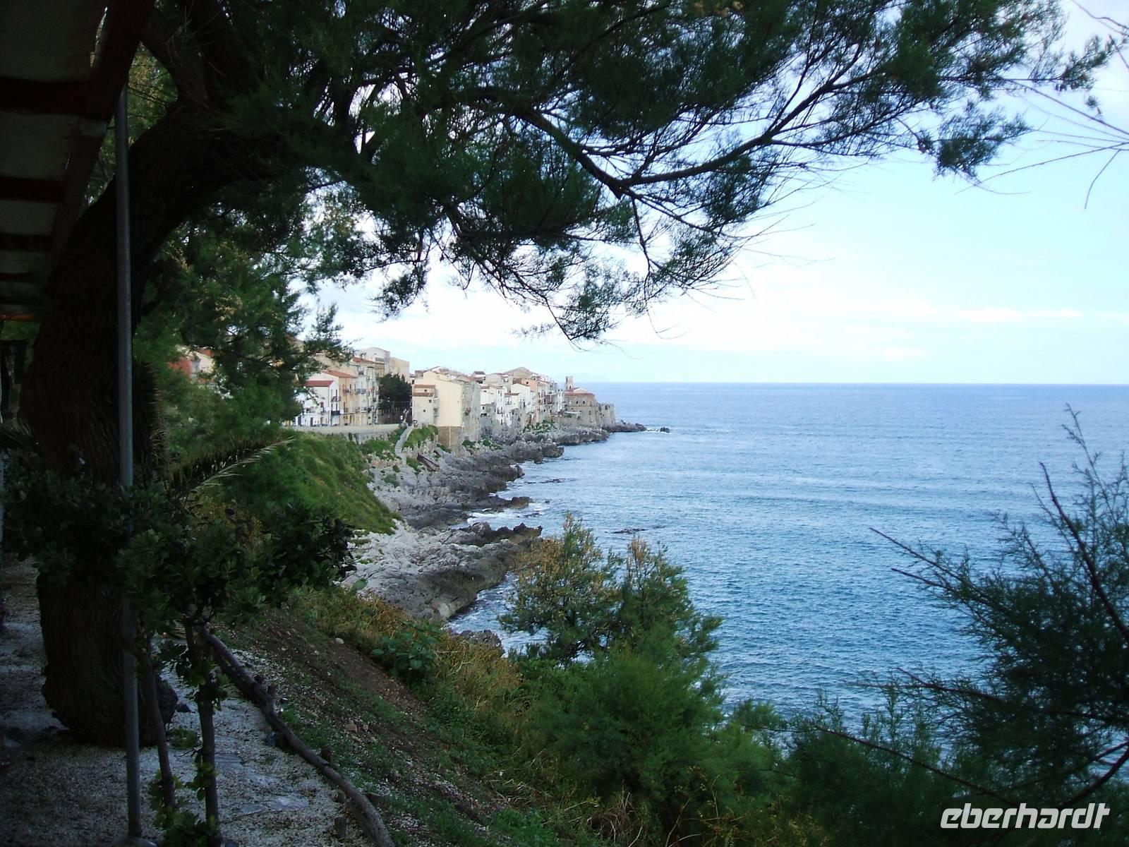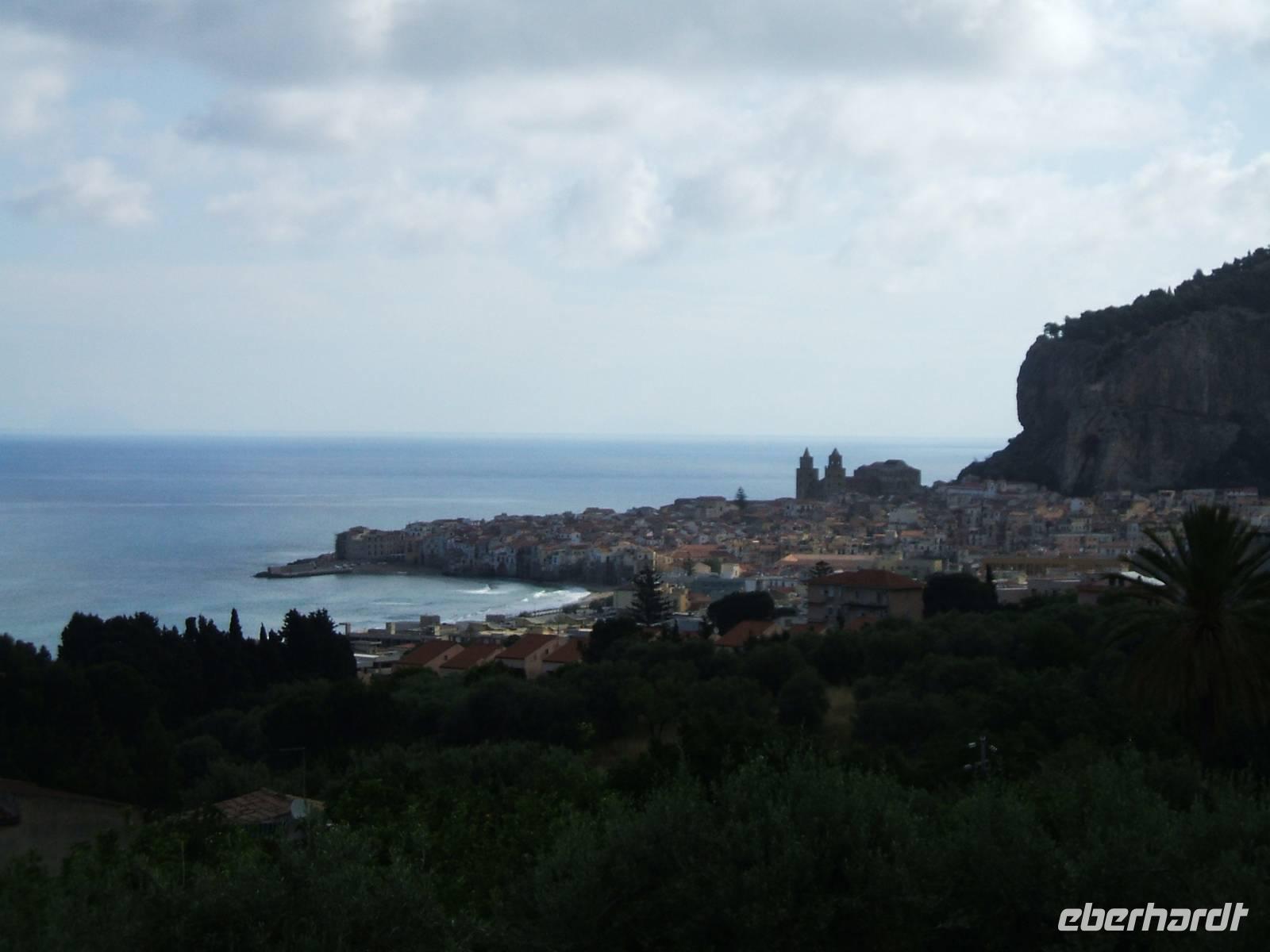 Der 27. Mai wird das klassische Beispiel für einen unvollständigen Reisebericht abgeben. Verbindlich dürfte unser Fotostopp vor Cefalù sein: Ein übermächtiger Felsen grenzt die Ortschaft landseits ab, während sie selbst sich mit ihren Häusern bis eng an das Meer drängt. Zwei prominente Kirchtürme ragen heraus, während das einfallende Sonnenlicht einige der Dächer überspielt. Später sieht man uns am Ortseingang, während unter uns das Meer gegen die schwärzlichen Felsbrocken anbrandet. Wer aus dem Binnenland stammt, mag sich bei dem naiven Gedanken ertappen, hier sei man der Schöpfung oder einem unbestimmten Akt der Urzeugung näher als sonst.
