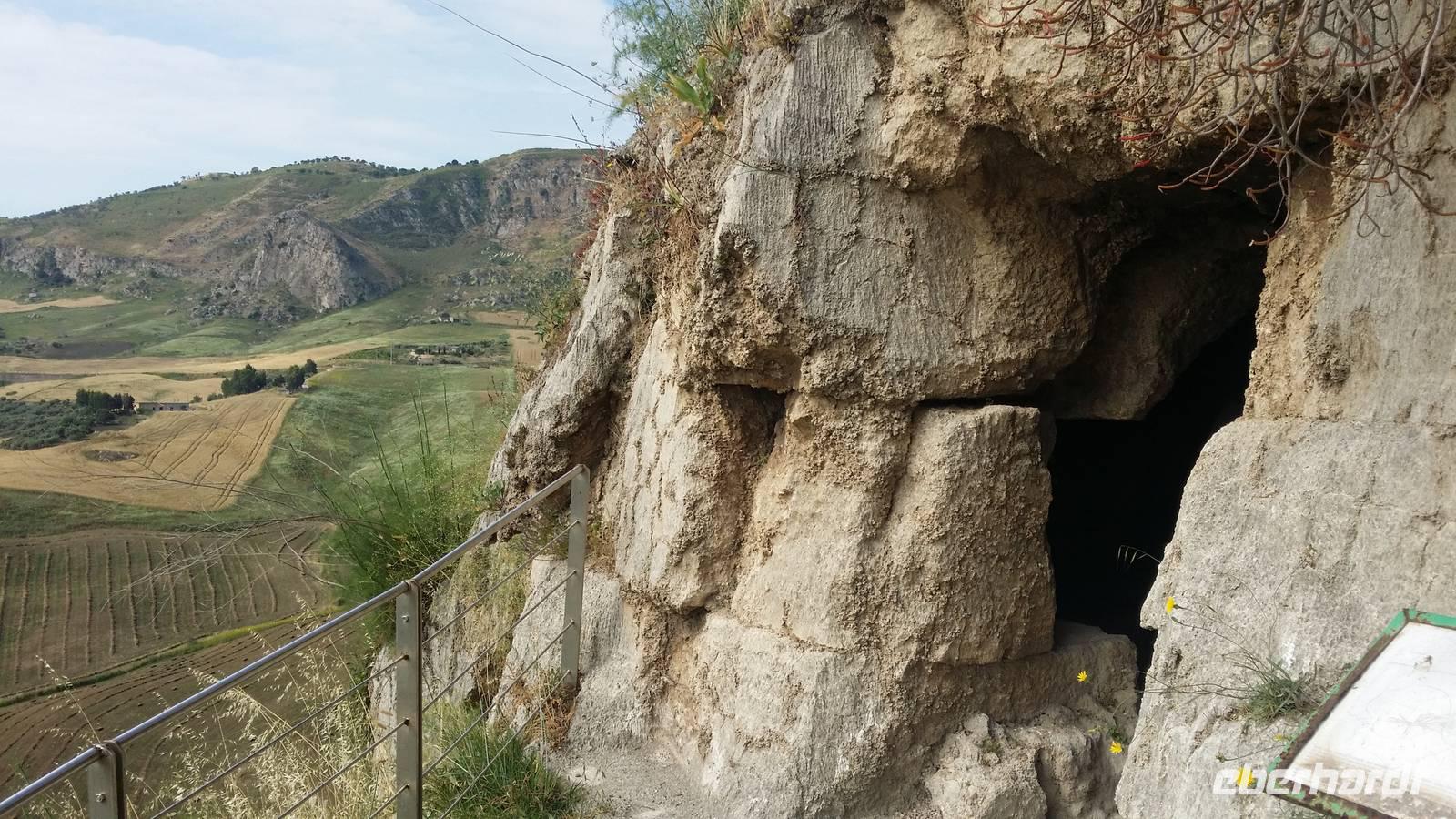 Den Weg nach Innersizilien sekundiert manche Auskunft über Arbeitslosigkeit und Emigration. Tatsächlich kargt die Hügellandschaft zwischen Olivenbäumen, Wiesen und eingestreuten Dörfern. Kaum sind wir aus dem Bus gestiegen, begrüßt unsere Reiseleiterin den Ortsführer Pier Filippo. Er führt uns oberhalb eines schroffen Hanges zu Grablegen der Siculi und in die tiefe Vorvergangenheit: Es handelt sich um eine Vor- oder Haupthöhle, dahinter sich eine zweite Kammer befindet.