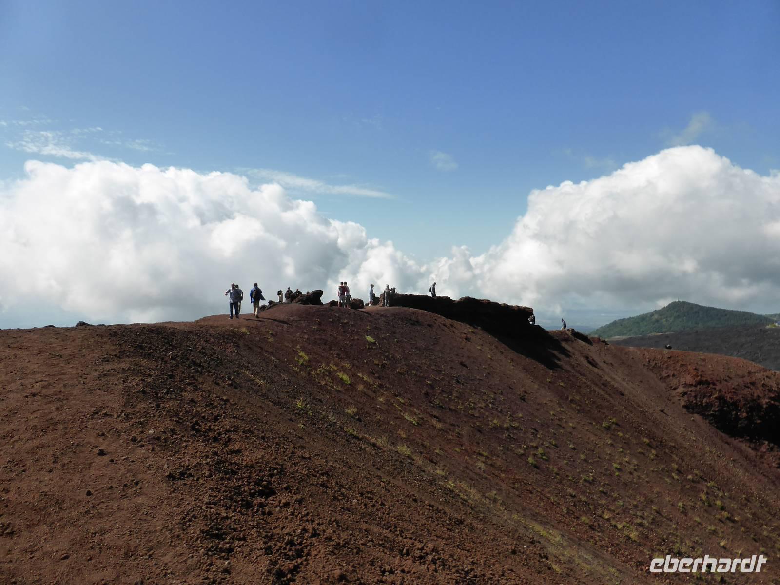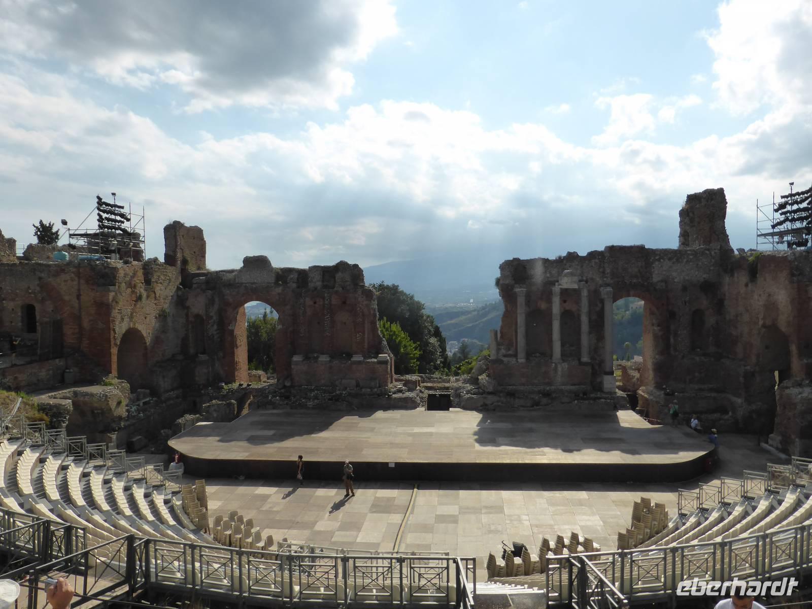 Bei blauem Himmel starteten wir zu unserem Tagesausflug auf den Ätna. Die Sizilianer nennen den Berg Mongibello (von Monte Djebel), was übersetzt aus dem Italienischen und Arabischen „Berg-Berg" bedeutet. Mit unserem Reisebus fuhren wir auf der Serpentinenstraße durch die erstarrten Lavaströme der Ausbrüche von 1971 sowie 2002 und hielten auf dem großen Parkplatz an der Talstation der Seilbahn. Von hier aus bestand die Möglichkeit, mit der Seilbahn auf eine Höhe von 2504 Metern zu fahren und von dort mit Unimog-Geländebussen bis auf 2913 Meter. Anschließend konnte man mit einem Bergführer zu den Kratern aufsteigen. Man konnte jedoch auch auf Höhe der Talstation bleiben und von dort aus zu den unteren Kratern, wie zum Beispiel dem im Jahre 2001 entstandenen Krater „La Capannina", laufen. Auf knapp 3000 Meter Höhe war über den Wolken gute Sicht und auch auf 2000 Meter Höhe war die Sicht gut. Zwischen diesen Höhen lag ein Wolkenband, welches sich rings um den Berg gelegt hatte. Nachdem alle Gäste wieder am Bus angekommen waren, fuhren wir weiter nach Taormina. Unser Bus parkte in einem großen Parkhaus und mit einem Pendelbus ging es hinauf in den Ort, um das griechisch-römische Theater zu besichtigen. Es war nach dem von Siracusa das zweitgrößte in Sizilien und wurde in atemberaubender Landschaft, hoch über der Küste und auf felsigem Untergrund angelegt. In den griechischen Tragödien spielte die Beziehung zu den Göttern die größte Rolle, wodurch auch der Standort des Theaters von Bedeutung war. Sie wollten den Göttern so nah wie möglich sein. Den Römern hingegen waren andere Dinge wichtiger und so wurde von ihnen der fantastische Blick auf den Ätna verbaut, indem sie den Bühnenhintergrund zumauerten. Heutzutage ist der Blick auf den Ätna wieder möglich. Wer wollte, konnte nach der Besichtigung des Theaters gemeinsam mit unserer Reiseleiterin Christiane hinunter zum Stadtpark und zur Villa Communale laufen oder entlang der Via Corso Umberto bis zum Plaza de Duomo spazieren. Von Taormina fuhren wir anschließend wieder zu unserem Hotel zurück.
