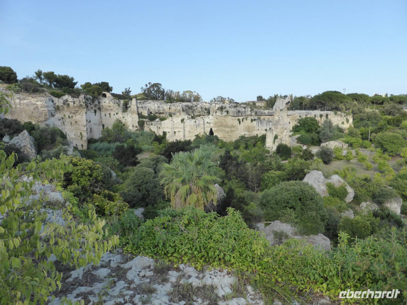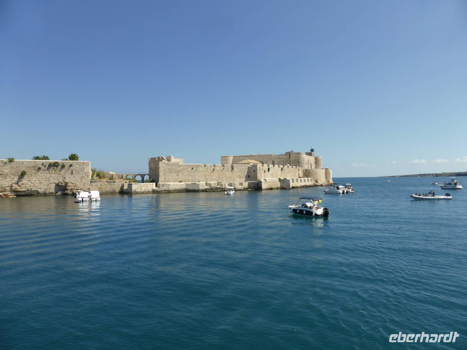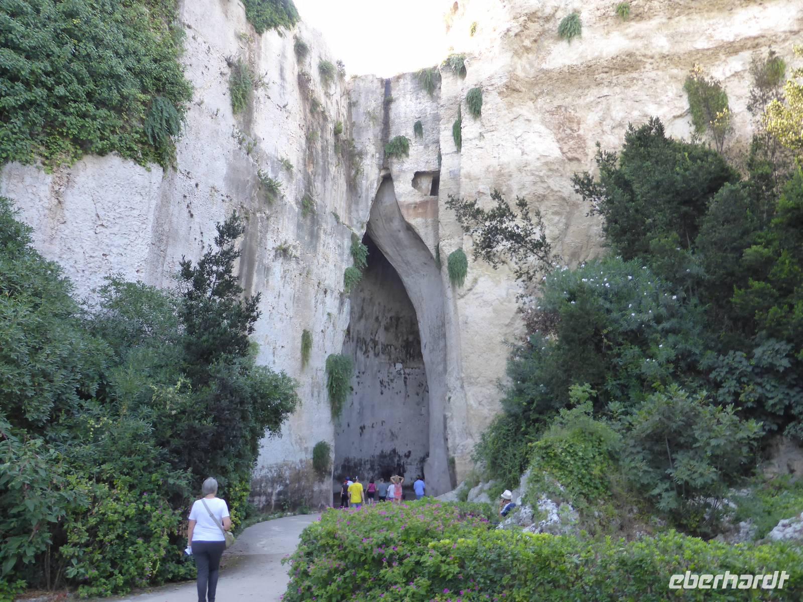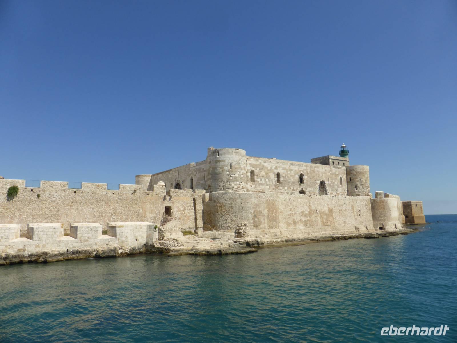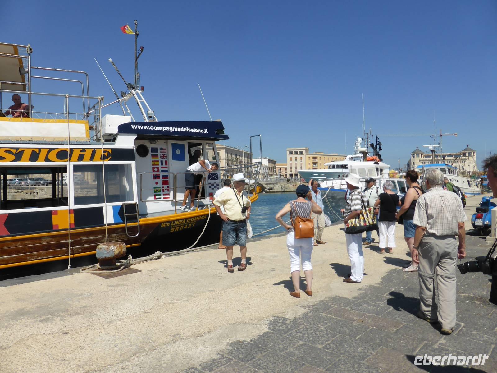 Nach dem Frühstück fuhren wir nach Catania, der zweitgrößten Stadt Siziliens. Die heilige Agatha ist die Schutzpatronin der Stadt und deren Feuerwehrleute sowie die Hüterin vor Feuerbrünsten. Dass sie in Catania so verehrt wird ist nicht verwunderlich, da die glühende Lava des nahen Ätnas die Stadt schon des Öfteren überrollte. In Catania angekommen, gingen wir zum Piazza del Duomo (Domplatz), in dessen Mitte der Elefantenbrunnen steht. Der Lava-Elefant ist seit Mitte des 13.Jahrhunderts Wahrzeichen der Stadt und soll angeblich die Lavaströme des Ätna aufhalten. Eine andere Legende erzählt, Elefanten, die es in Ponygröße noch bis zur Altsteinzeit auf Sizilien gab, hätten den ersten Siedlern geholfen, wilde Tiere zu vertreiben. Wir besuchten den Dom, in dessen Inneren der Komponist Vicenzo Bellini beigesetzt ist und der heiligen Agatha gedacht wird. Vom Dom gingen wir anschließend gemeinsam zum Fischmarkt, einem der ursprünglichsten und authentischsten Italiens. Nur schwer konnten wir uns von der Faszination des Marktgeschreis und des reichhaltigen Angebots der Händler losreißen. Nach dem Besuch war noch etwas Freizeit, bevor wir uns wieder am Elefantenbrunnen trafen und zum Bus zurück gingen. Von Catania aus fuhren wir nach Siracusa und kamen zur Mittagszeit an. Wir hatten beschlossen an einer Bootsfahrt im Naturhafen teilzunehmen und uns dafür auf dem Markt in Catania mit Lebensmitteln eingedeckt. Die Fahrt war ein Erlebnis und der Blick auf das Castello sowie die Insel Ortigia einmalig! Wieder zurück am Hafen, spazierten wir zur Arethusa-Quelle und von dieser zur Kathedrale Santa Maria delle Colonne. Sie wurde an der Stelle eines antiken Tempels errichtet, wobei der dorische Athene-Tempel aus dem 5.Jahrhundert v.Chr. in den Kirchenbau einbezogen wurde. Anschließend gingen wir zum Apollon-Tempel und von dort zum Bus. Mit ihm fuhren wir zum Archäologischen Areal von Siracusa. In dieser antiken Anlage besuchten wir zuerst den Altar des Hieron II. mit seinem gewaltigen Opfertisch und anschließend die Latomien, die ehemaligen Steinbrüche der Stadt. Sklaven bauten hier den begehrten Kalkstein für die vielen Bauwerke des antiken Siracusa ab. Besonders erwähnenswert ist eine Grotte, die das „Ohr des Dionysios" genannt wird und auch tatsächlich diese Form aufweist. Das Innere der Grotte erinnert an ein Schneckenhaus und besitzt eine einzigartige Akustik. Nach dem Besuch der Steinbrüche gingen wir zum griechischen Theater. Es war im 3. Jh. v. Chr. eines der größten seiner Zeit und wurde in mühevoller Arbeit aus dem Sandsteinfels herausgeschlagen. Das Theater bot bis zu 15.000 Zuschauern Platz und die Bühne stand wieder einmal vor einer prächtigen Naturkulisse mit Blick auf das runde Hafenbecken von Siracusa. Nach der Besichtigung des Archäologischen Parks fuhren wir zu unserem Hotel nach Letojanni zurück.