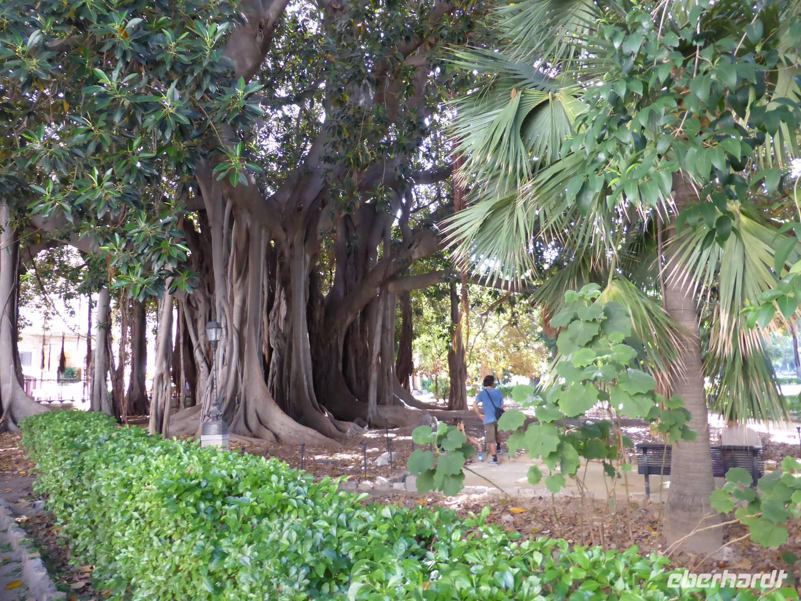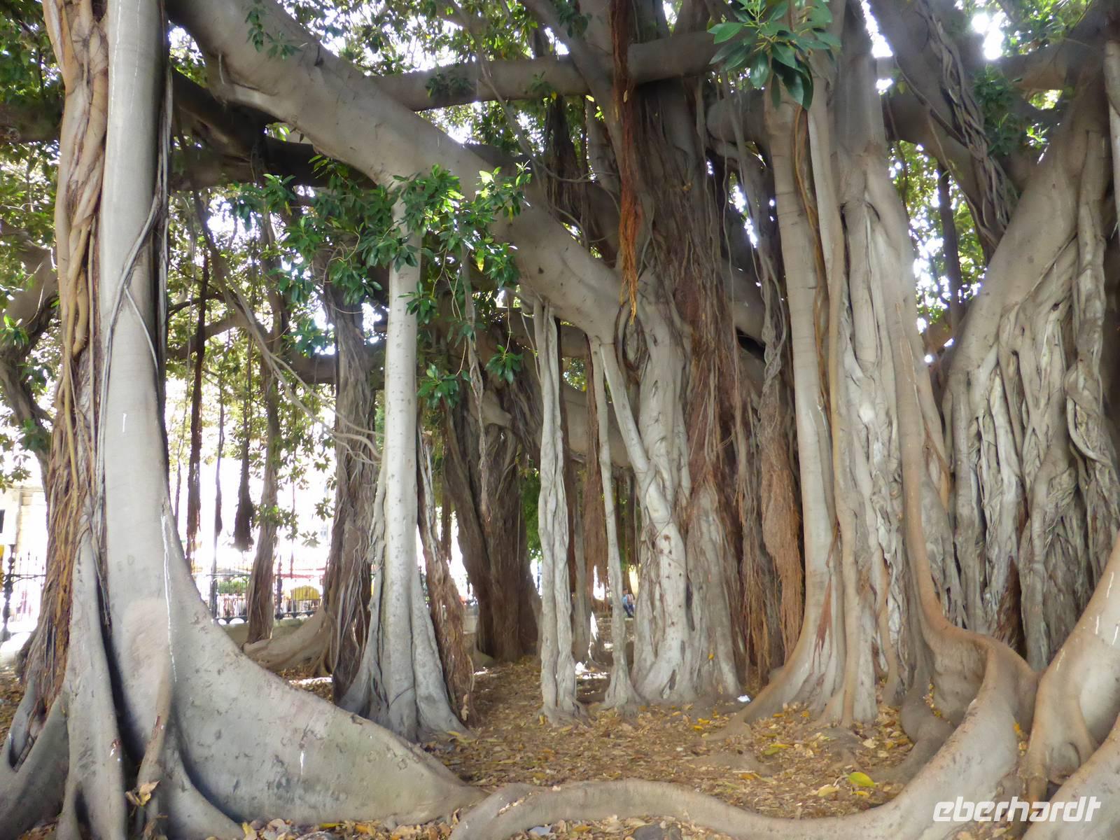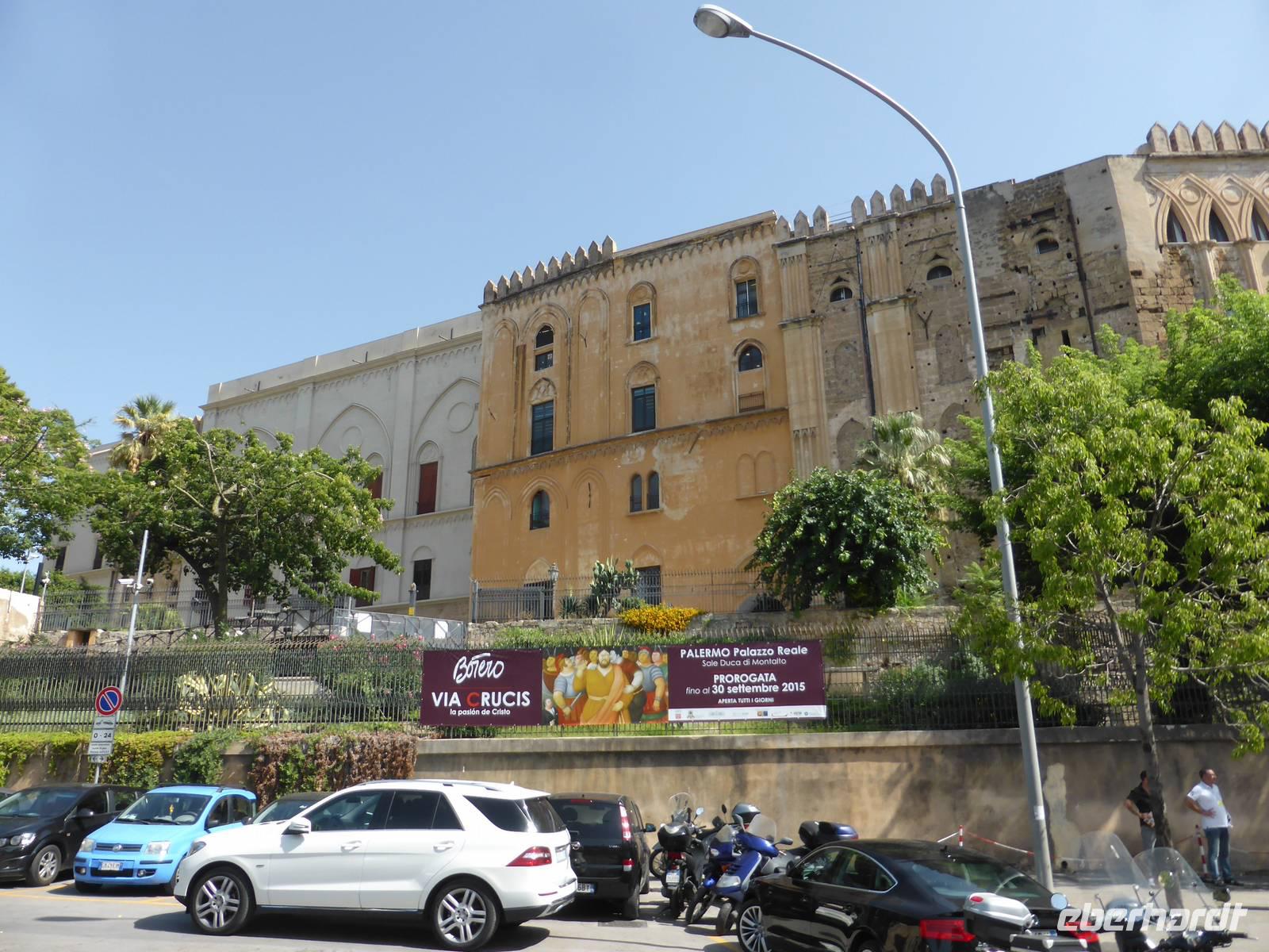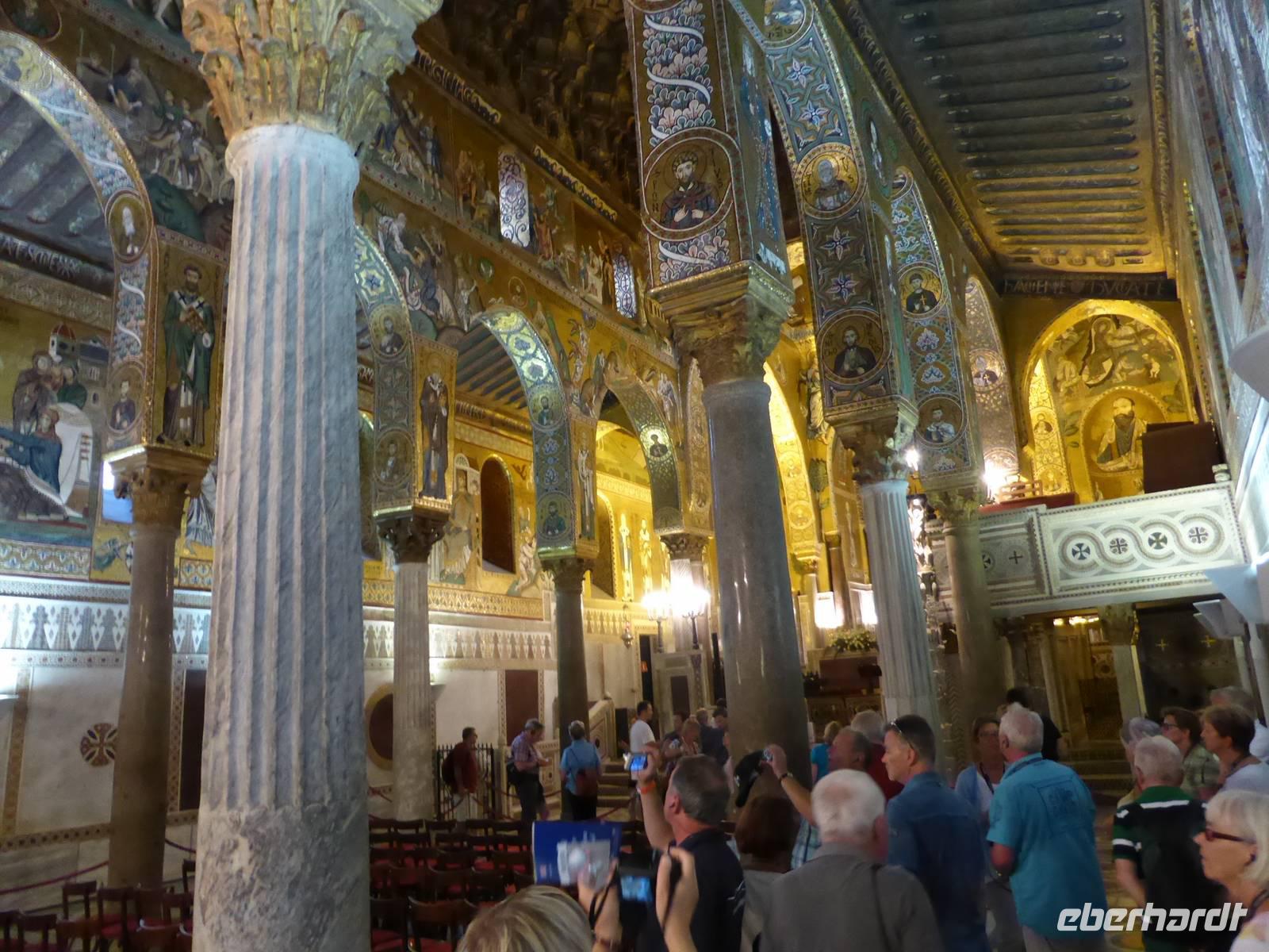 Nach der Besichtigung fuhren wir zur Capella Palatina zurück, da diese ja nach der Hochzeit geöffnet sein sollte. Leider verschob sich die Öffnungszeit noch einmal um eine halbe Stunde, so dass wir beschlossen, die Zeit für eine Mittagspause zu nutzen. Gerade noch rechtzeitig konnten wir unseren Busfahrer abfangen, der im Begriff war, mit dem Bus fort zu fahren. So stiegen wir nach kurzer Fahrt am Teatro Massimo aus und hatten Zeit für die Mittagspause. Anschließend fuhren wieder zur Capella Palatina zurück und konnten diese ohne großen Besucheransturm in Ruhe besichtigen. „Capella Palatina" bedeutet „Palast-Kapelle", womit der wichtigste Teil des einstigen Normannenpalastes und heutigen Regierungsgebäudes gemeint ist. Die Kapelle Rogers II. ist als Vorgängerbau des Doms in Monreale zu betrachten. Ihre Ausmaße sind bedeutend kleiner und sie wurde mit großer Wahrscheinlichkeit auch als Empfangs- und Audienzsaal benutzt. Auch hier sind die Kapitelle mit prächtigen Mosaiken verziert. Anders als im Dom von Monreale schaut Christus als Pantokrator sehr düster von der Kuppel über dem Chor herab. Vom Normannenpalast gingen wir anschließend zurück zum Bus und bevor wir Palermo verließen, hielten wir noch einmal an der Piazza Marina und schauten uns einen gewaltigen Ficus-Baum an, dessen den Boden berührende Luftwurzeln ebenfalls schon Baumstärke erreicht hatten und nun halfen, das Gewicht des ausladenden Baumes aufzufangen. Anschließend fuhren wir zu unserem Hotel zurück.