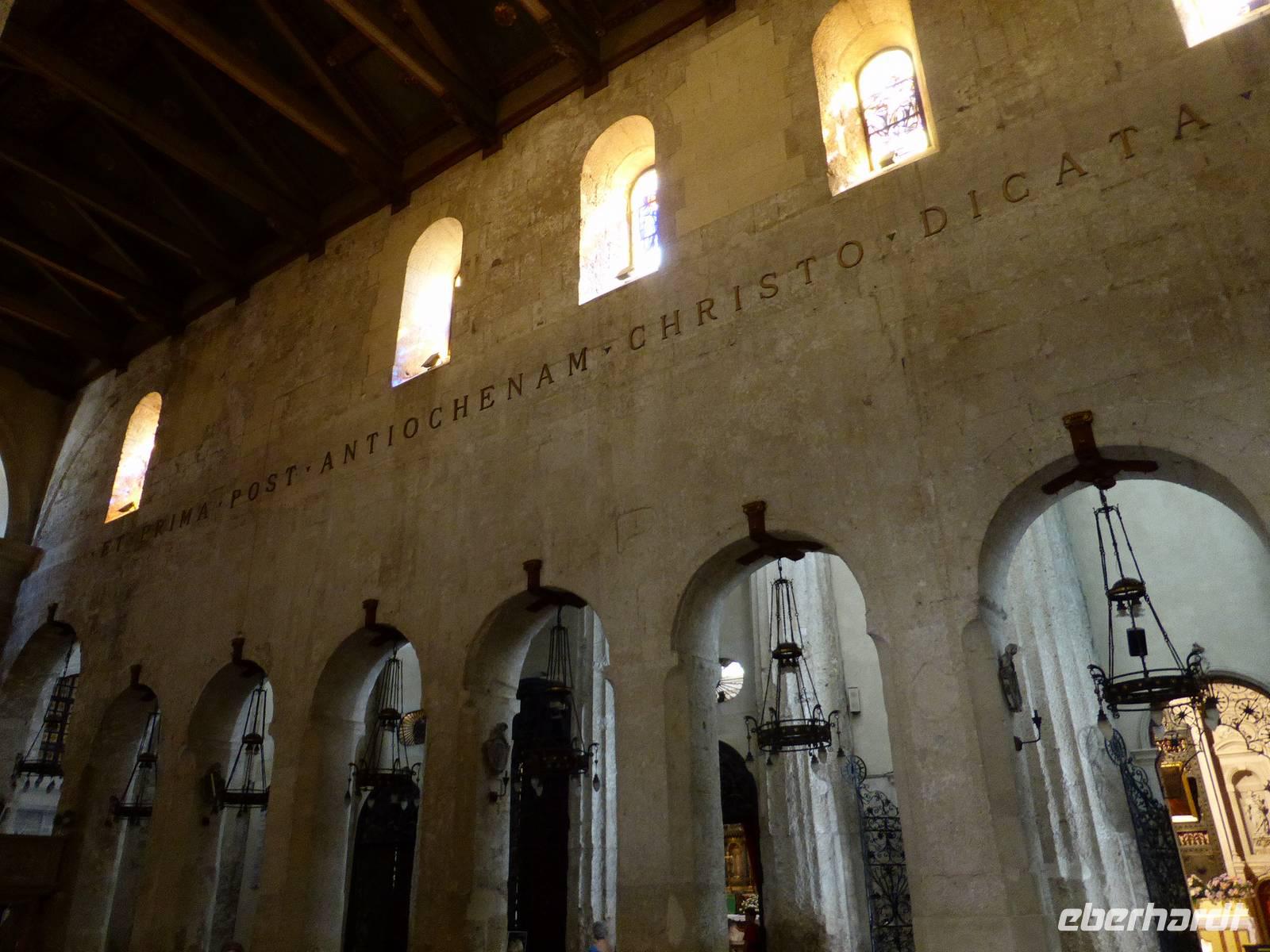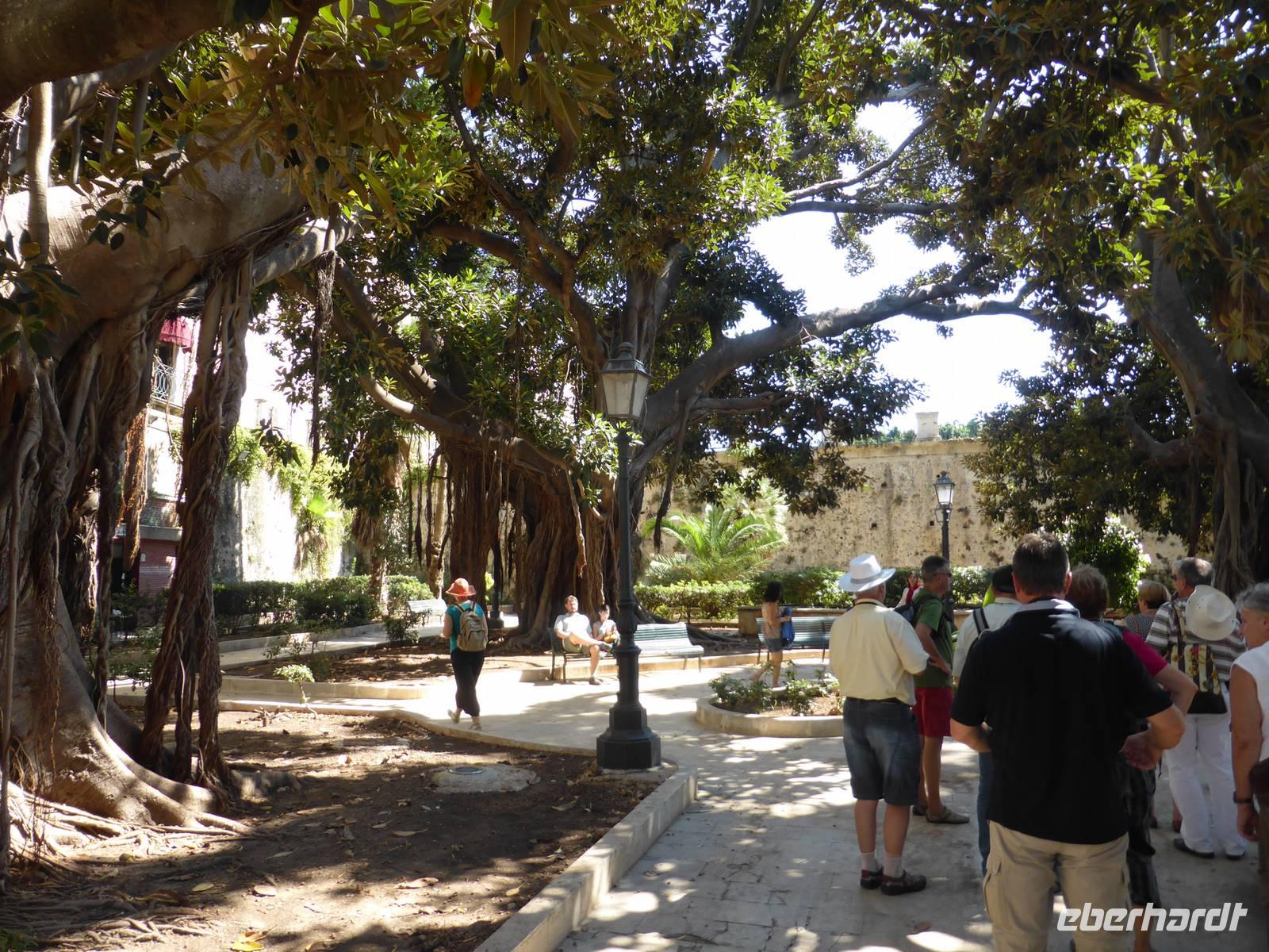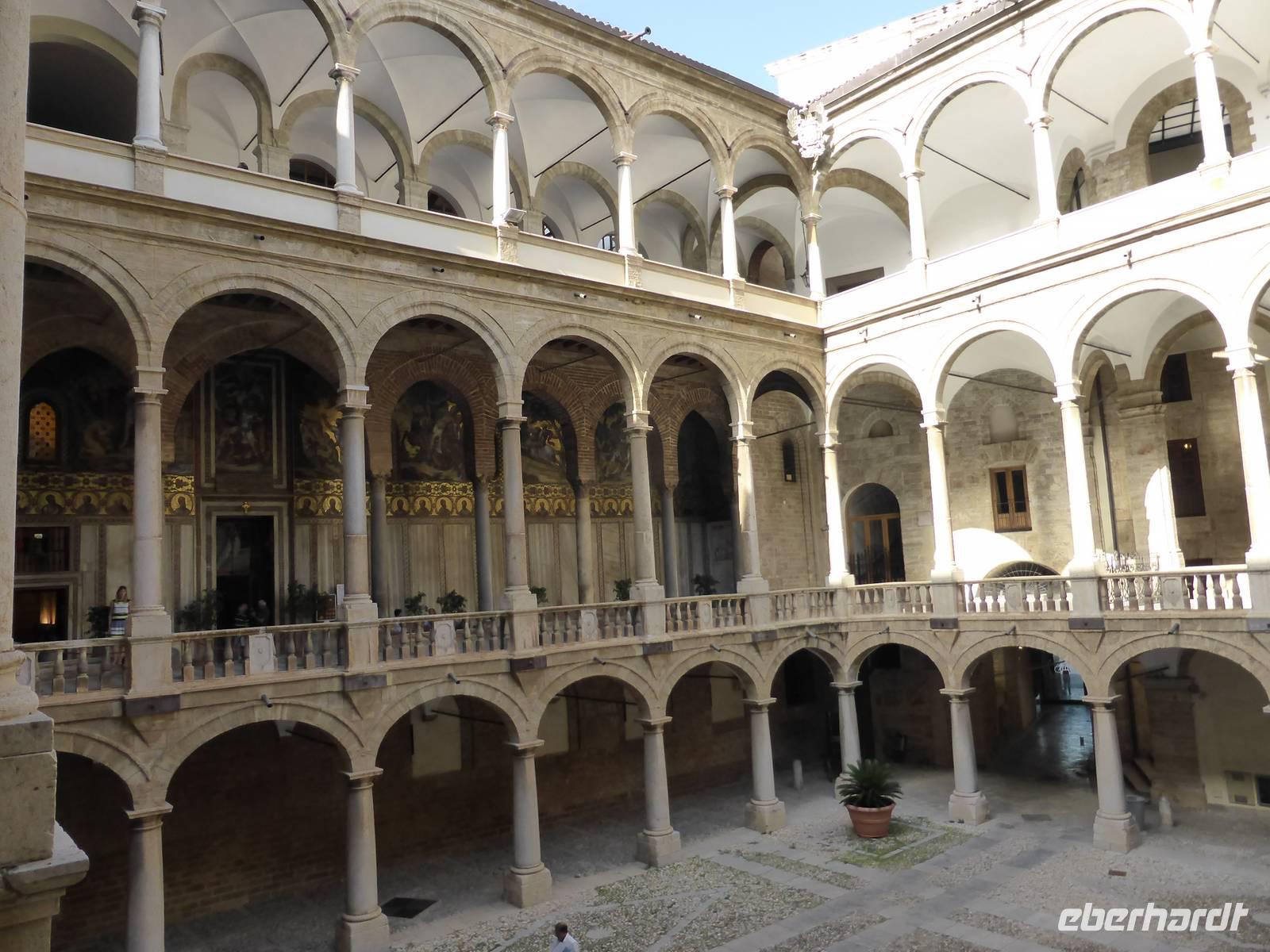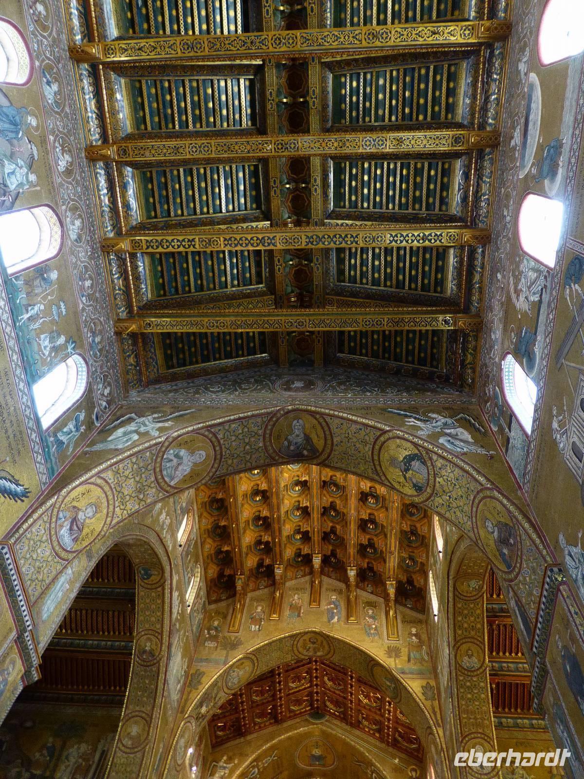 Nach der Besichtigung fuhren wir zur Capella Palatina zurück, da diese ja nach der Hochzeit geöffnet sein sollte. Leider verschob sich die Öffnungszeit noch einmal um eine halbe Stunde, so dass wir beschlossen, die Zeit für eine Mittagspause zu nutzen. Gerade noch rechtzeitig konnten wir unseren Busfahrer abfangen, der im Begriff war, mit dem Bus fort zu fahren. So stiegen wir nach kurzer Fahrt am Teatro Massimo aus und hatten Zeit für die Mittagspause. Anschließend fuhren wieder zur Capella Palatina zurück und konnten diese ohne großen Besucheransturm in Ruhe besichtigen. „Capella Palatina" bedeutet „Palast-Kapelle", womit der wichtigste Teil des einstigen Normannenpalastes und heutigen Regierungsgebäudes gemeint ist. Die Kapelle Rogers II. ist als Vorgängerbau des Doms in Monreale zu betrachten. Ihre Ausmaße sind bedeutend kleiner und sie wurde mit großer Wahrscheinlichkeit auch als Empfangs- und Audienzsaal benutzt. Auch hier sind die Kapitelle mit prächtigen Mosaiken verziert. Anders als im Dom von Monreale schaut Christus als Pantokrator sehr düster von der Kuppel über dem Chor herab. Vom Normannenpalast gingen wir anschließend zurück zum Bus und bevor wir Palermo verließen, hielten wir noch einmal an der Piazza Marina und schauten uns einen gewaltigen Ficus-Baum an, dessen den Boden berührende Luftwurzeln ebenfalls schon Baumstärke erreicht hatten und nun halfen, das Gewicht des ausladenden Baumes aufzufangen. Anschließend fuhren wir zu unserem Hotel zurück.