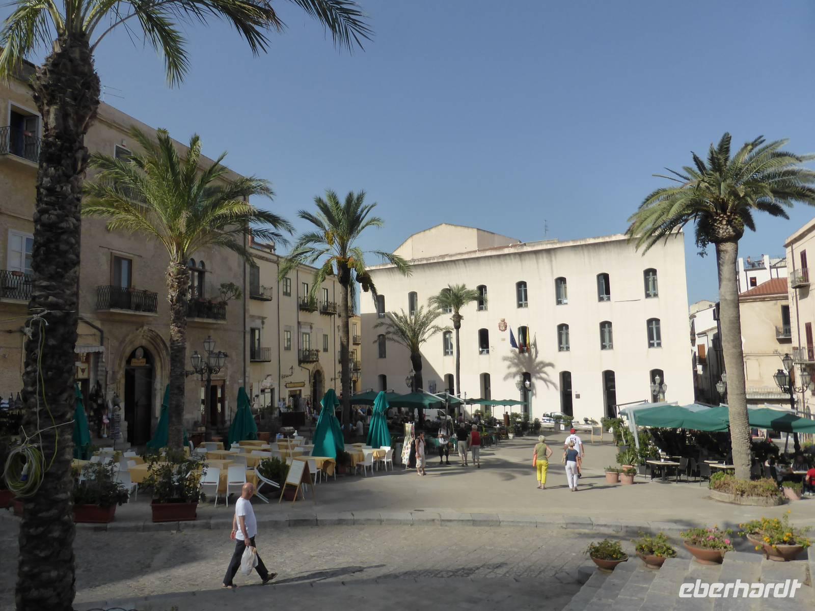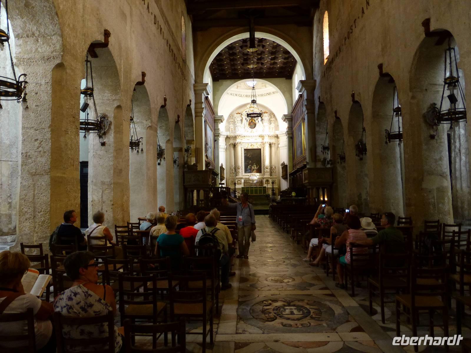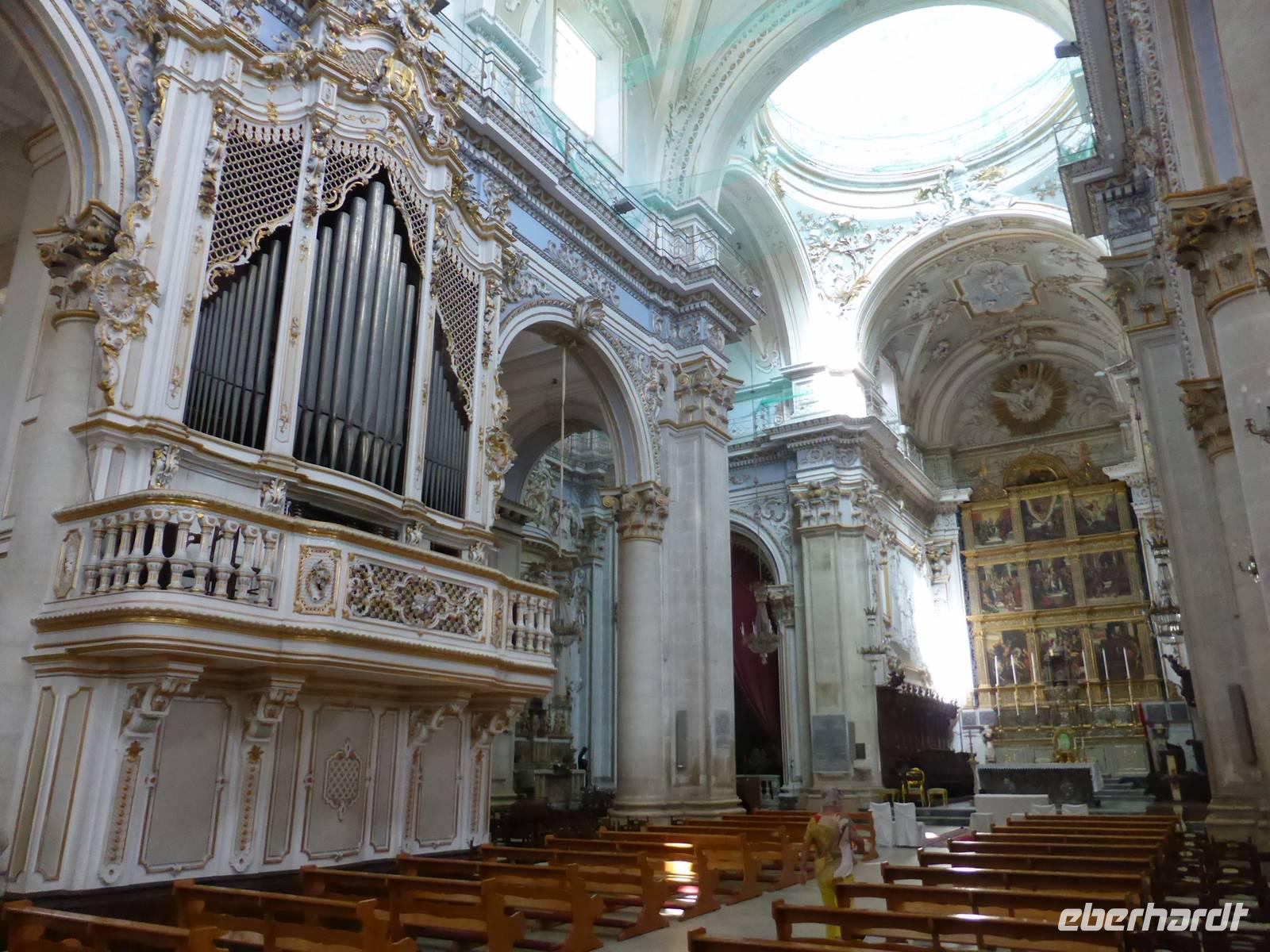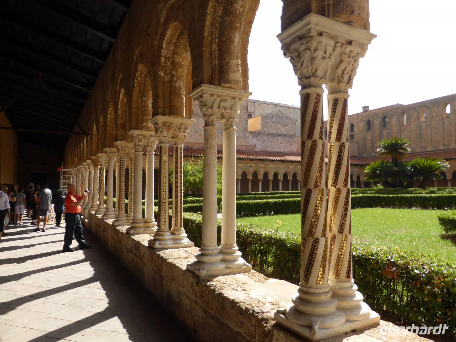 Am heutigen fakultativen Ausflug nach Monreale und Palermo nahmen fast alle Gäste unserer Reisegruppe teil. Zuerst ging es nach Monreale, einer Kleinstadt westlich von Palermo. Vom Busparkplatz führten uns 100 Stufen hinauf zum Domplatz, aber es bestand auch die Möglichkeit, sich mit einem Taxi hinauffahren zu lassen. Der Dom von Monreale wurde zusammen mit dem Königspalast und dem Kloster im 12. Jh. unter der Herrschaft Wilhelms I. errichtet, um ein Gegengewicht zur Diozöse von Palermo zu schaffen. Sein Inneres beeindruckt durch die unglaubliche Fülle an farbigen und golden strahlenden byzantinischen Mosaiken. Auf den Kapitellen über den Säulen, welche die Last des Hauptschiffes und der beiden Seitenschiffe tragen, ist die vollständige Geschichte des alten und neuen Testaments bildlich auf Mosaiken dargestellt. Im Halbrund an der Decke, hoch über dem Chor, befindet sich das riesige Abbild von Jesus als Weltenherrscher (Pantokrator). Auch das Querhaus ist seinem Leben und seiner Passion gewidmet. Insgesamt bedecken die farbigen Mosaike des Doms eine Fläche von 6340 qm, was fast der Fläche eines Fußballfeldes entspricht (7140 qm)! Nach dem Besuch des Domes begaben wir uns in den Kreuzgang des ehemaligen Klosters der einstigen Benediktinerabtei. Eindrucksvoll waren hier die Dippelsäulen, welche ebenfalls mit farbigen Mosaiken bedeckt sind oder besonders reich verzierte Ornamente aufweisen. Von Monreale fuhren wir dann zur Capella Palatina in Palermo. Aufgrund einer Hochzeit war diese allerdings bis 13.30 Uhr für Besuchergruppen geschlossen, so dass wir zunächst nur die Eintrittskarten kaufen konnten und unseren Besuch verschieben mussten. Stattdessen spazierten wir zur Kathedrale von Palermo. Christiane, unsere sympathische Reiseleiterin, erklärte uns vor der Kathedrale deren Geschichte. Anschließend besichtigten wir sie von innen. Besonders interessant waren die riesige meterlange Sonnenuhr und die Sarkophage der Stauferkaiser.