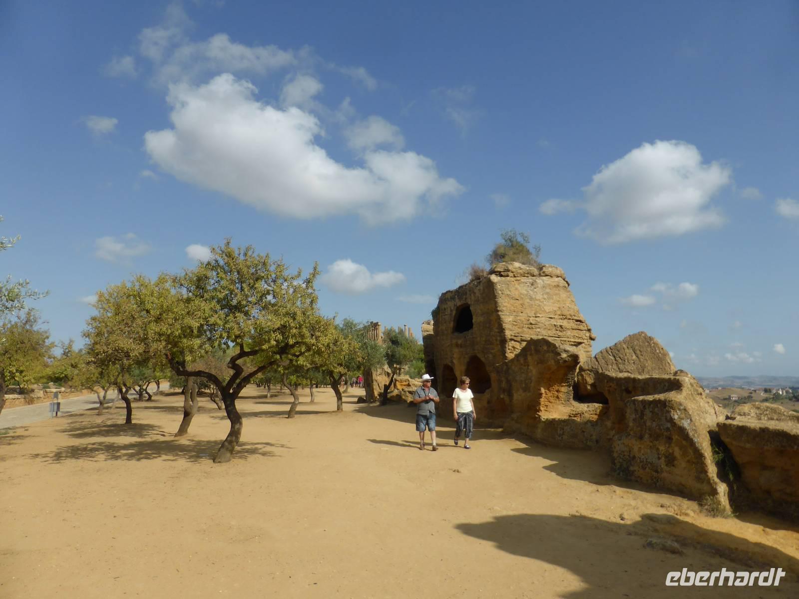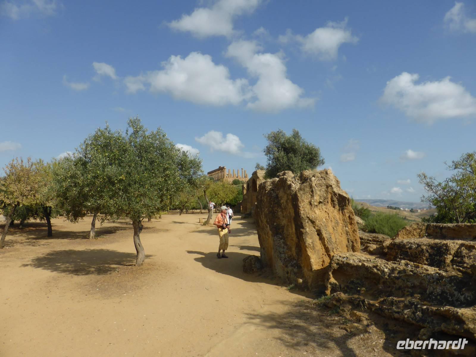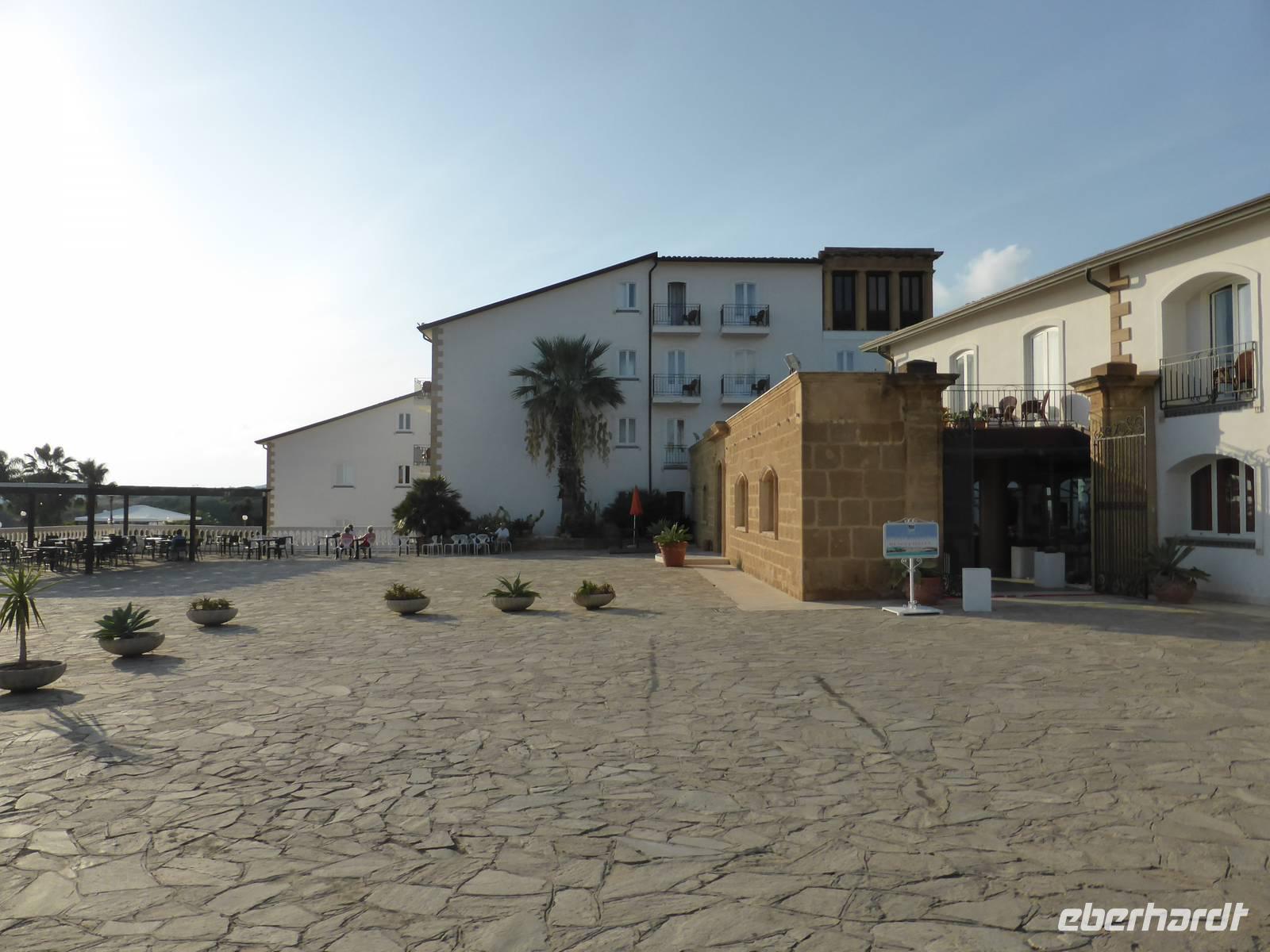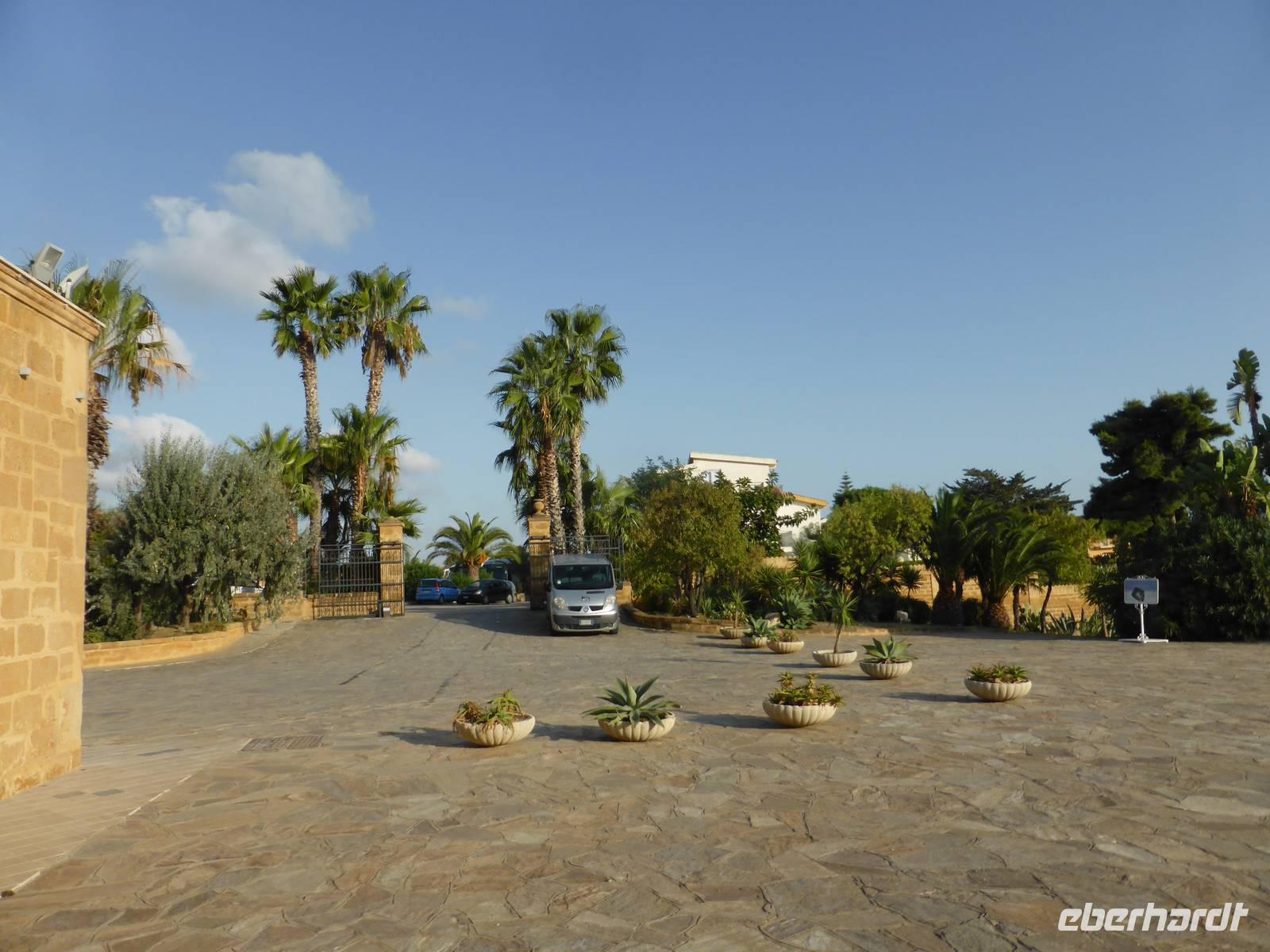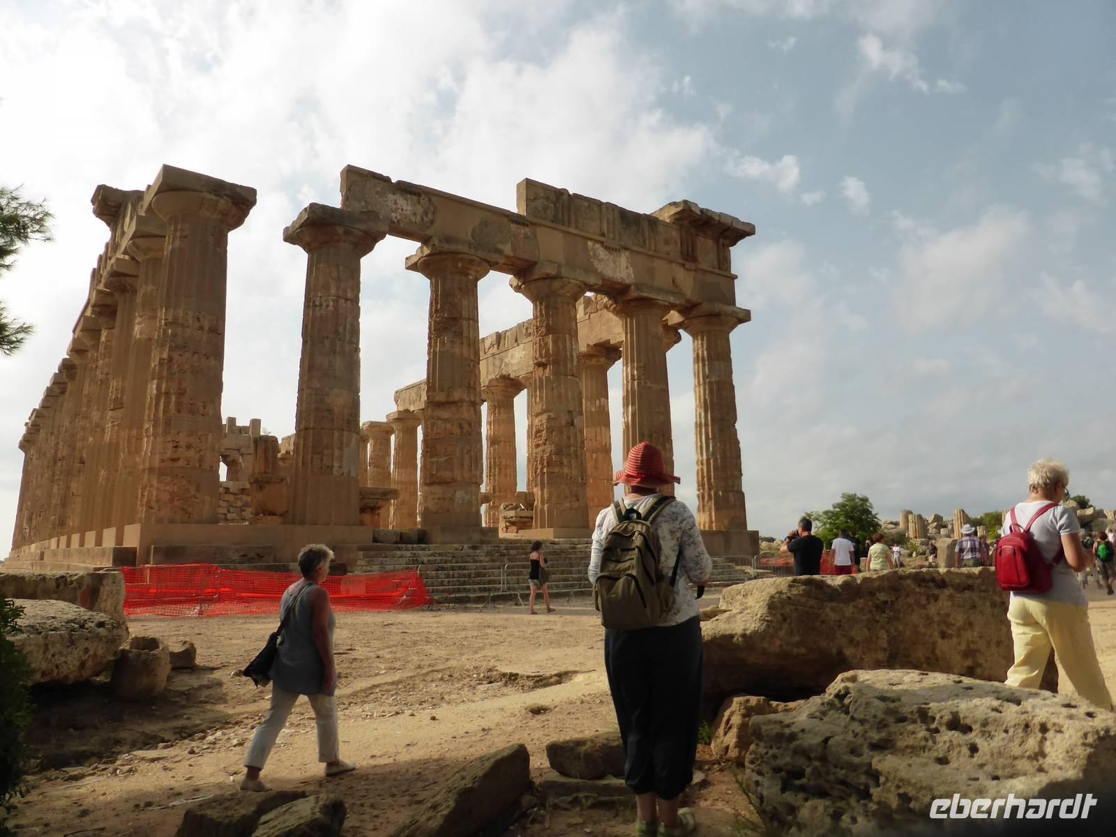 backfrisches und noch warmes Baguette mit Olivenöl und Tomaten-Pesto. Auf dem Weg zum Dom schauten wir uns auch noch die Weihnachtsgrippen-Ausstellung von Senore Lillo an. Für den Ort ist sie sicherlich ein weiterer Baustein, um Gäste anzulocken. Zum Mittagessen waren wir bei Maria und Angelo verabredet. Zwischen ihrem und dem Nachbarhaus hatten sie eine große Tafel aufgestellt, die in Folge mit allerlei Gängen sowie Wasser und Wein bestückt wurde. Das Essen war fantastisch und reichlich, das Sitzen im Schatten der beiden Häuser angenehm bei der sonst herschenden Hitze. Selbst der Opa half mit aus und führte uns nach dem Essen seine Mandel-Entkernungsmaschine vor. Von Sant Angelo Muxaro fuhren wir anschließend nach Selinunte. Die dortigen Ausgrabungsstätten sind die weitläufigsten Siziliens. Die Blütezeit der Stadt war von 628 v.Chr. bis 209. V. Chr. als sie die Karthager unter Hannibal wieder zerstörten. Erdbeben im Mittelalter taten ihr übriges. Wir besichtigten zuerst den recht vollständig erhaltenen Tempel E, welcher der Göttin Hera gewidmet und in den fünfziger Jahren des 20. Jh. weitgehend rekonstruiert worden war. Säulengang und Cella waren wieder deutlich zu erkennen. Vom Hera-Tempel ging es dann zum Tempel F, vermutlich einst für die Verehrung der Göttin Athena gebaut. Der gigantischste Tempel des nach dem nahe liegenden Ort Marinella benannten „Marinella-Plateaus" war allerdings der Tempel G, welcher wahrscheinlich dem Gott Apollon gewidmet war. Die Ausmaße der am Boden liegenden Säulen und Kapitelle sind atemberaubend! Der Tempel muss eine Höhe von sagenhaften 30 Metern gehabt haben. Da in die Säulen noch keine Kanneluren (streifenförmige, halbrunde Vertiefungen) ausgearbeitet waren, gehen die Archäologen davon aus, dass der Tempel bei der Zerstörung Selinuntes durch die Karthager noch nicht fertiggestellt war. Auf dem Rückweg zum Parkplatz sahen wir aus der Ferne auch noch die auf einer Anhöhe zwischen zwei Flüssen liegende Akropolis des antiken Selinunte. Mit dem Bus fuhren wir über Palermo zu unserem Hotel „Athenèe Palace" bei Campofèlice di Roccella.