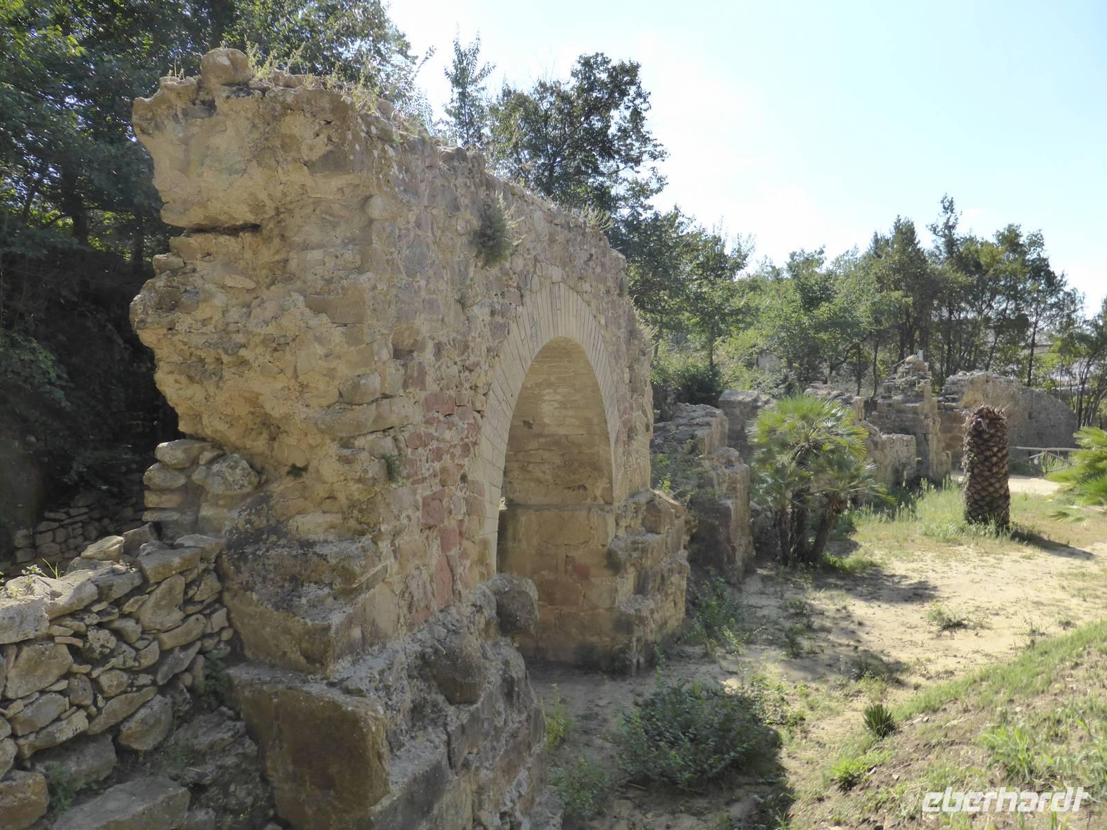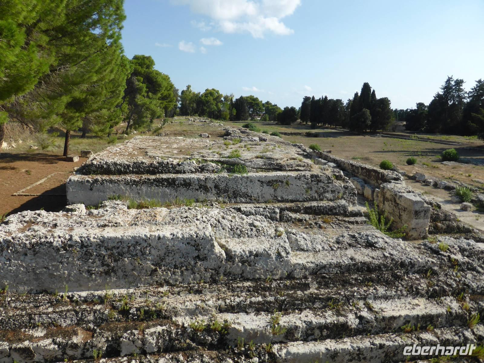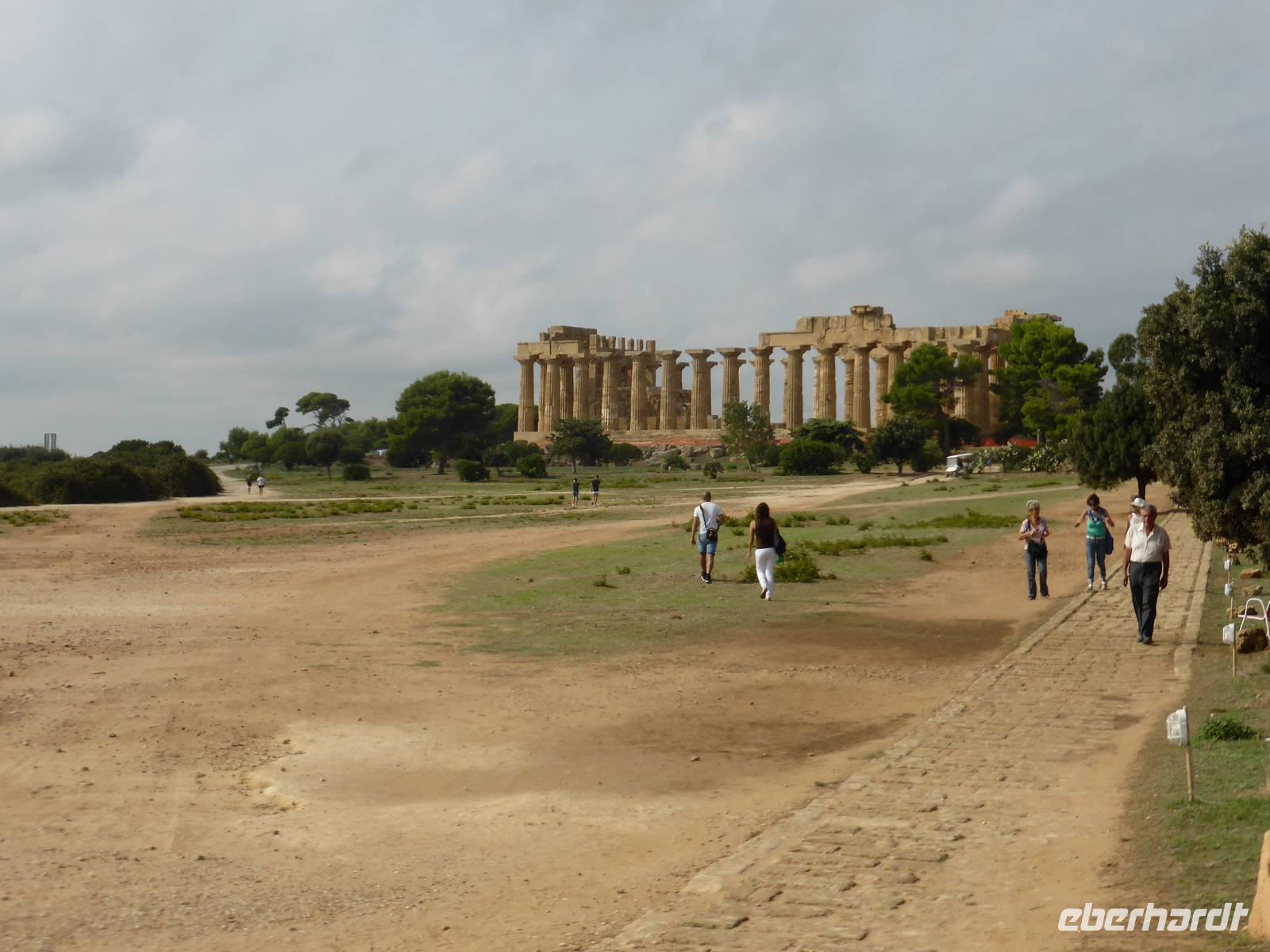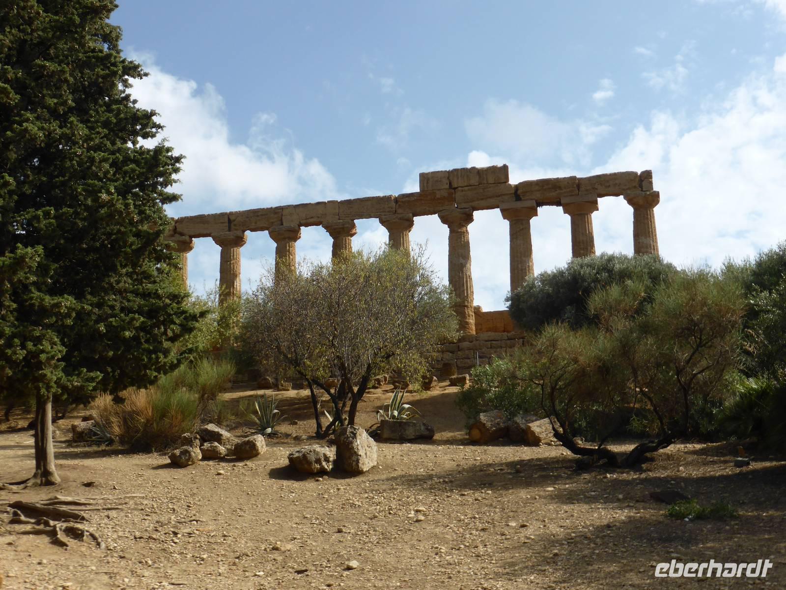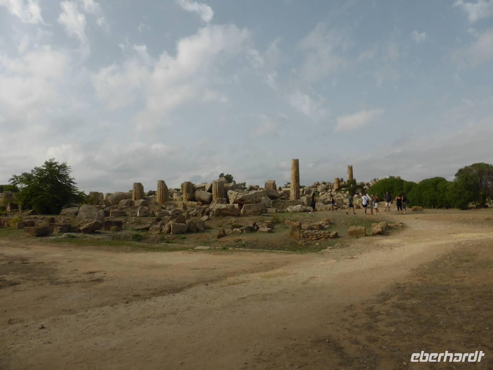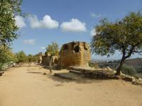 backfrisches und noch warmes Baguette mit Olivenöl und Tomaten-Pesto. Auf dem Weg zum Dom schauten wir uns auch noch die Weihnachtsgrippen-Ausstellung von Senore Lillo an. Für den Ort ist sie sicherlich ein weiterer Baustein, um Gäste anzulocken. Zum Mittagessen waren wir bei Maria und Angelo verabredet. Zwischen ihrem und dem Nachbarhaus hatten sie eine große Tafel aufgestellt, die in Folge mit allerlei Gängen sowie Wasser und Wein bestückt wurde. Das Essen war fantastisch und reichlich, das Sitzen im Schatten der beiden Häuser angenehm bei der sonst herschenden Hitze. Selbst der Opa half mit aus und führte uns nach dem Essen seine Mandel-Entkernungsmaschine vor. Von Sant Angelo Muxaro fuhren wir anschließend nach Selinunte. Die dortigen Ausgrabungsstätten sind die weitläufigsten Siziliens. Die Blütezeit der Stadt war von 628 v.Chr. bis 209. V. Chr. als sie die Karthager unter Hannibal wieder zerstörten. Erdbeben im Mittelalter taten ihr übriges. Wir besichtigten zuerst den recht vollständig erhaltenen Tempel E, welcher der Göttin Hera gewidmet und in den fünfziger Jahren des 20. Jh. weitgehend rekonstruiert worden war. Säulengang und Cella waren wieder deutlich zu erkennen. Vom Hera-Tempel ging es dann zum Tempel F, vermutlich einst für die Verehrung der Göttin Athena gebaut. Der gigantischste Tempel des nach dem nahe liegenden Ort Marinella benannten „Marinella-Plateaus" war allerdings der Tempel G, welcher wahrscheinlich dem Gott Apollon gewidmet war. Die Ausmaße der am Boden liegenden Säulen und Kapitelle sind atemberaubend! Der Tempel muss eine Höhe von sagenhaften 30 Metern gehabt haben. Da in die Säulen noch keine Kanneluren (streifenförmige, halbrunde Vertiefungen) ausgearbeitet waren, gehen die Archäologen davon aus, dass der Tempel bei der Zerstörung Selinuntes durch die Karthager noch nicht fertiggestellt war. Auf dem Rückweg zum Parkplatz sahen wir aus der Ferne auch noch die auf einer Anhöhe zwischen zwei Flüssen liegende Akropolis des antiken Selinunte. Mit dem Bus fuhren wir über Palermo zu unserem Hotel „Athenèe Palace" bei Campofèlice di Roccella.