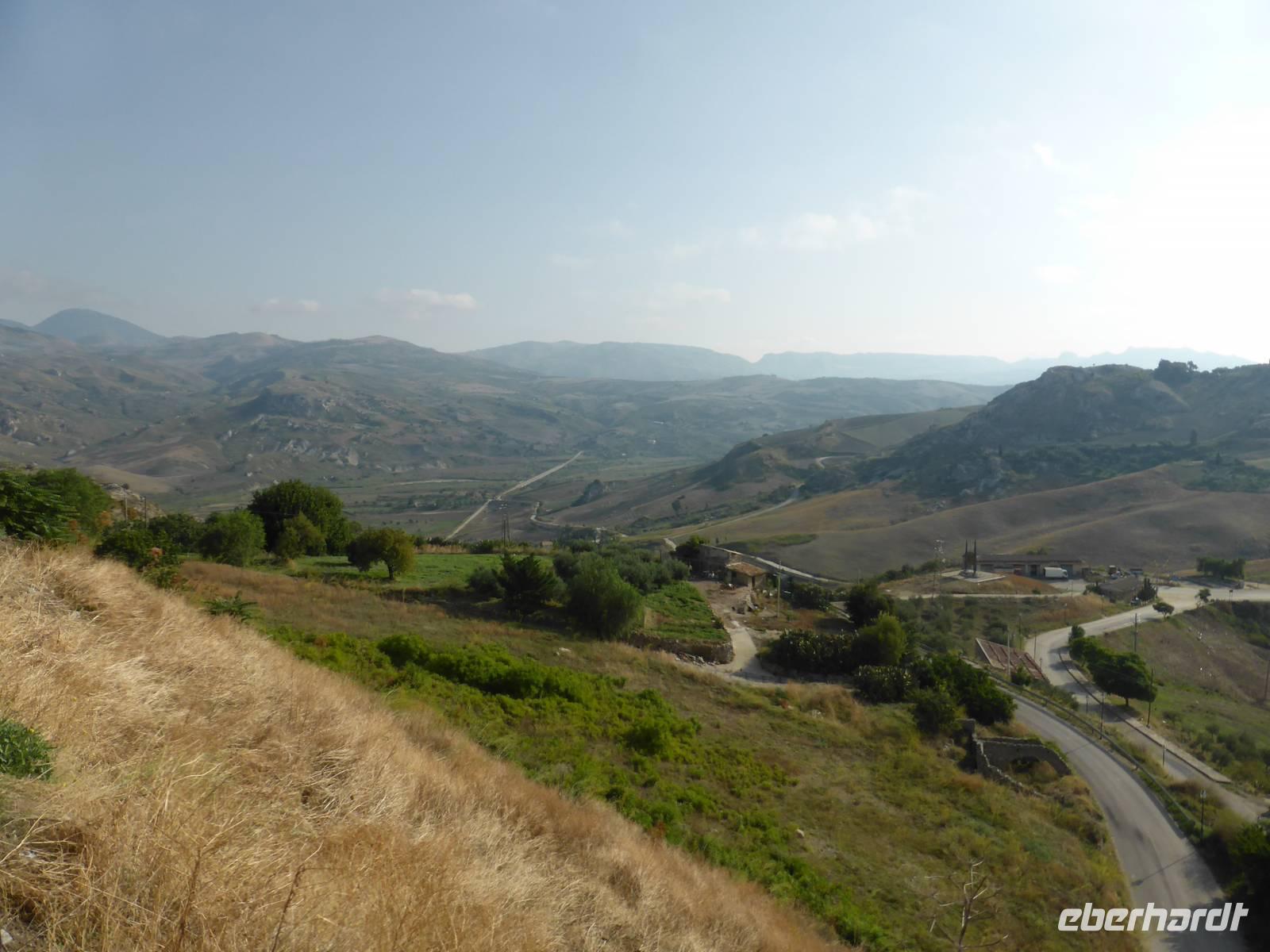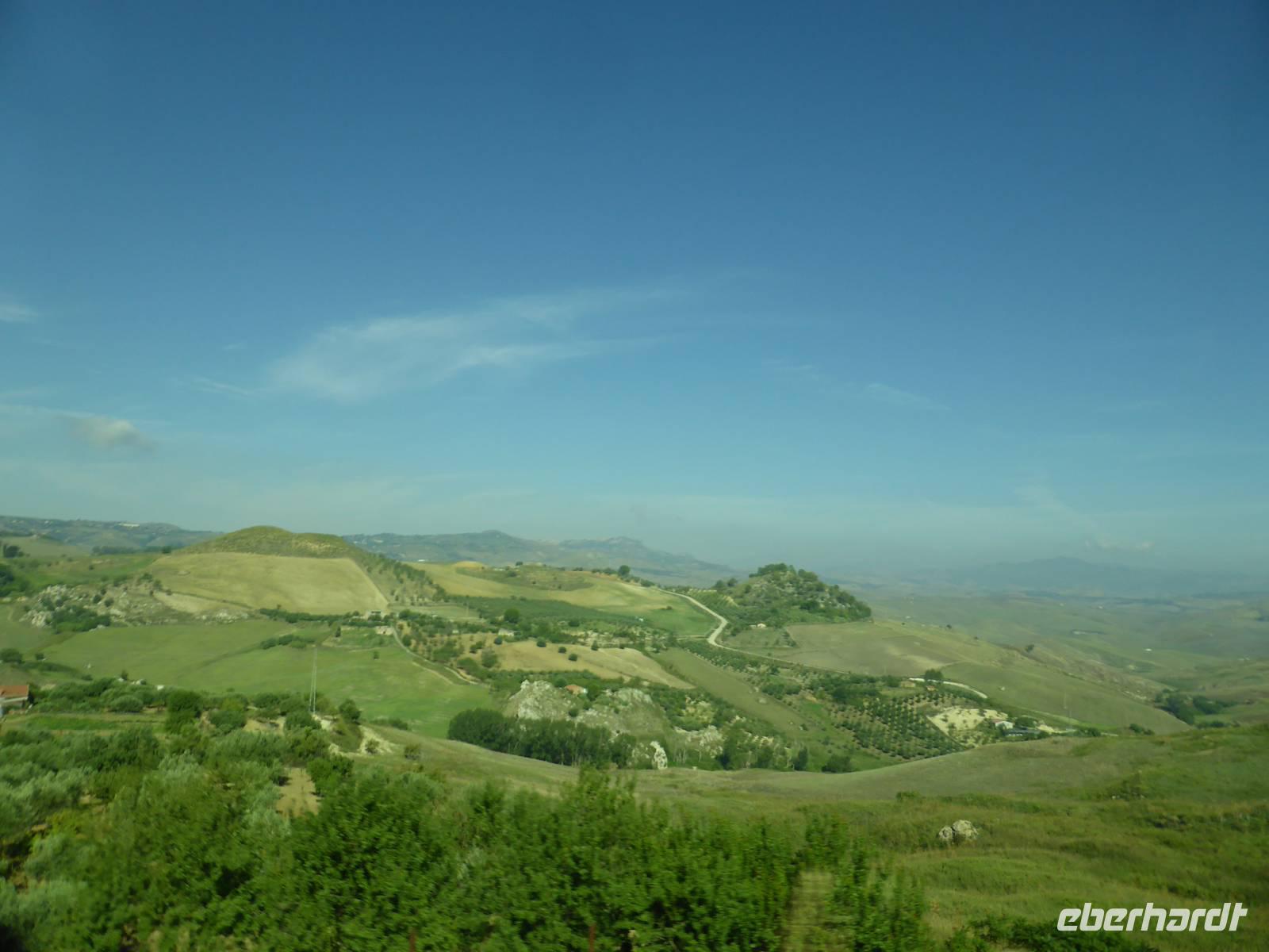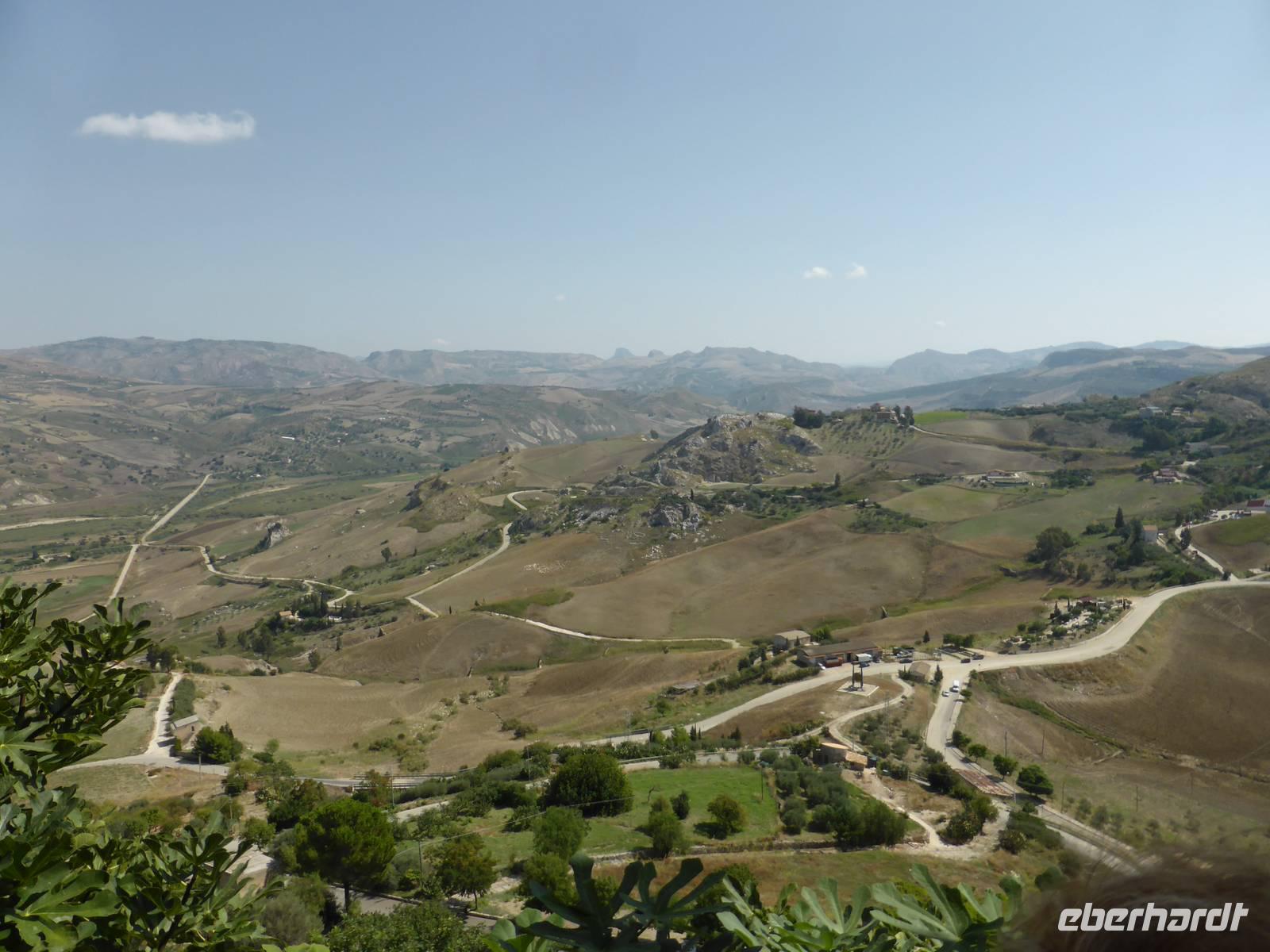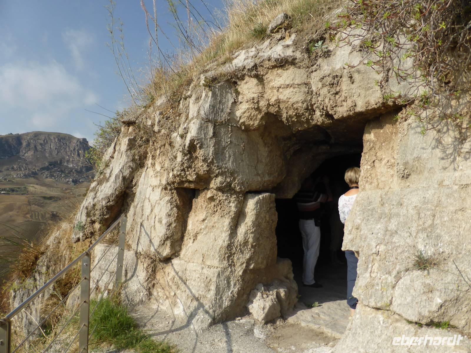 Am Morgen fiel uns der Abschied vom Hotel „Kaos" schwer, da wir uns in der Anlage sehr wohl gefühlt hatten! Doch schon nach wenigen Kilometern war der Kummer wieder vergessen, denn es erwarteten uns bei strahlend blauem Himmel spannende Landschaften im Landesinneren. Unsere Reise führte uns nach Sant Angelo Muxaro. Hier besuchten wir unterhalb des Ortes mit unserem örtlichen Führer Filipo die Höhle des Prinzen (Tomba del Principe). Ungefähr 1000 Grabhöhlen wurden hier von den Sikanern zwischen dem 11. und 5.Jh. v. Chr. aus dem relativ weichen Felsgestein herausgearbeitet. Die bisher größte ist die des Prinzen, weshalb man auch von einer höher gestellten Persönlichkeit ausgehen muss. Sie besteht aus einem ca. 9 Meter großem Vorraum für die religiösen Totenfeierlichkeiten und der Hauptkammer, in der der Tote auf einer Bank bestattet wurde. In den Höhlen wurden auch Grabbeigaben gefunden, welche so bedeutend sind, dass sie heute im British Museum in London und im Archäologischen Museum in Agrigento ausgestellt werden. Vom Höhlengrab fuhren wir dann nach Sant Angelo Muxaro hinauf. Die kleine Stadt liegt auf einem Felsplateau hoch über dem Tal des Platani-Flusses. Im Ort, welcher sehr sauber und gepflegt ist, scheint die Zeit stehengeblieben zu sein. Wir besuchten die Schaf-Käserei von Enzo und Olga inklusive einer Kostprobe ihres Ricotta-Käses und hielten anschließend vor der Bäckerei von Maria und Angelo. Hier probierten wir leckeres Mandel- und Pistazien-Gebäck sowie