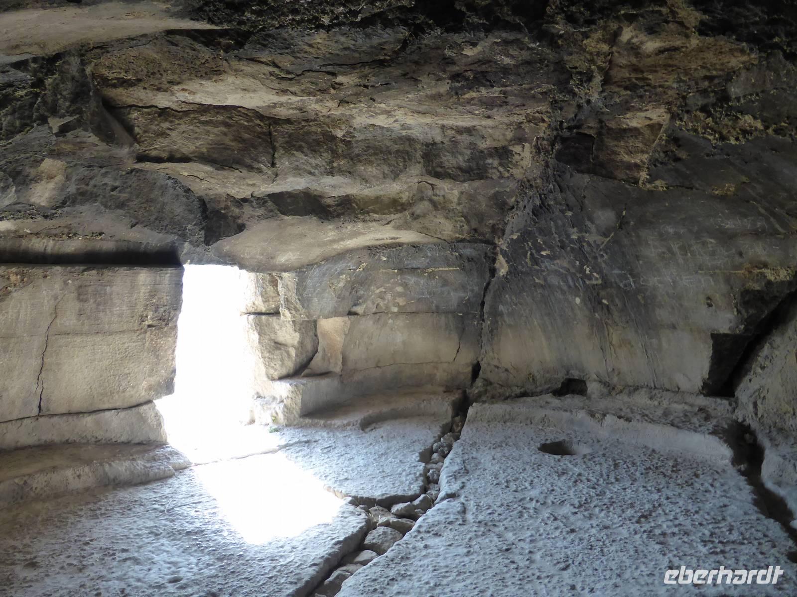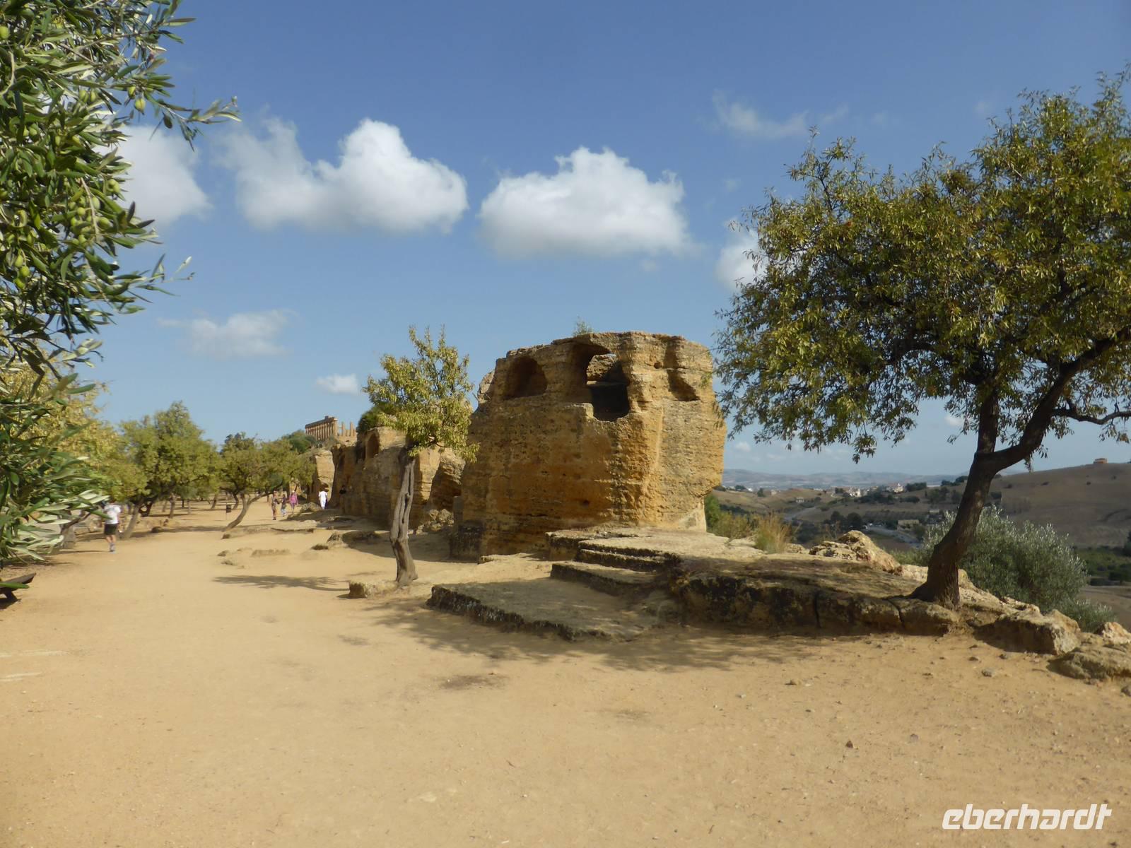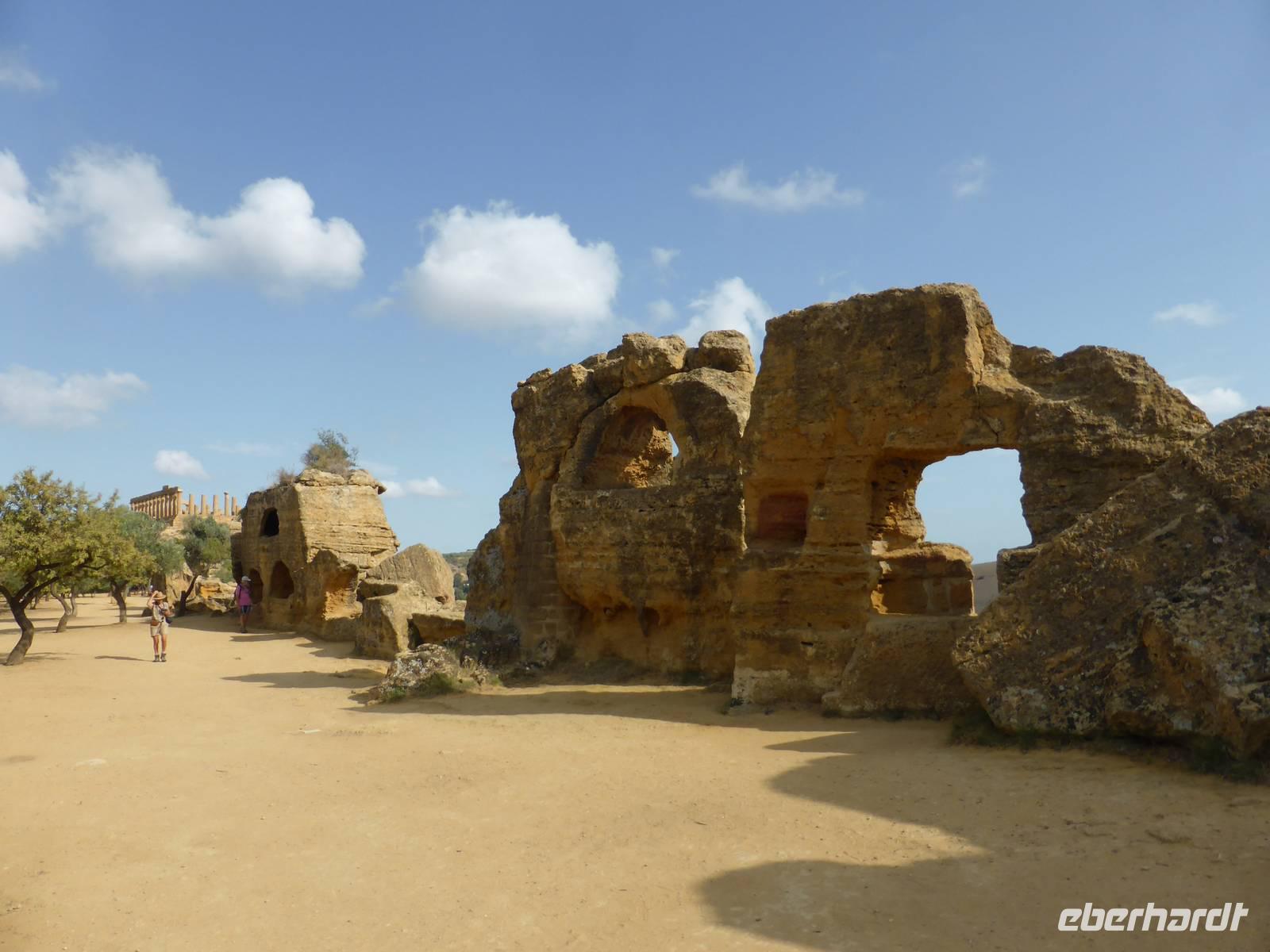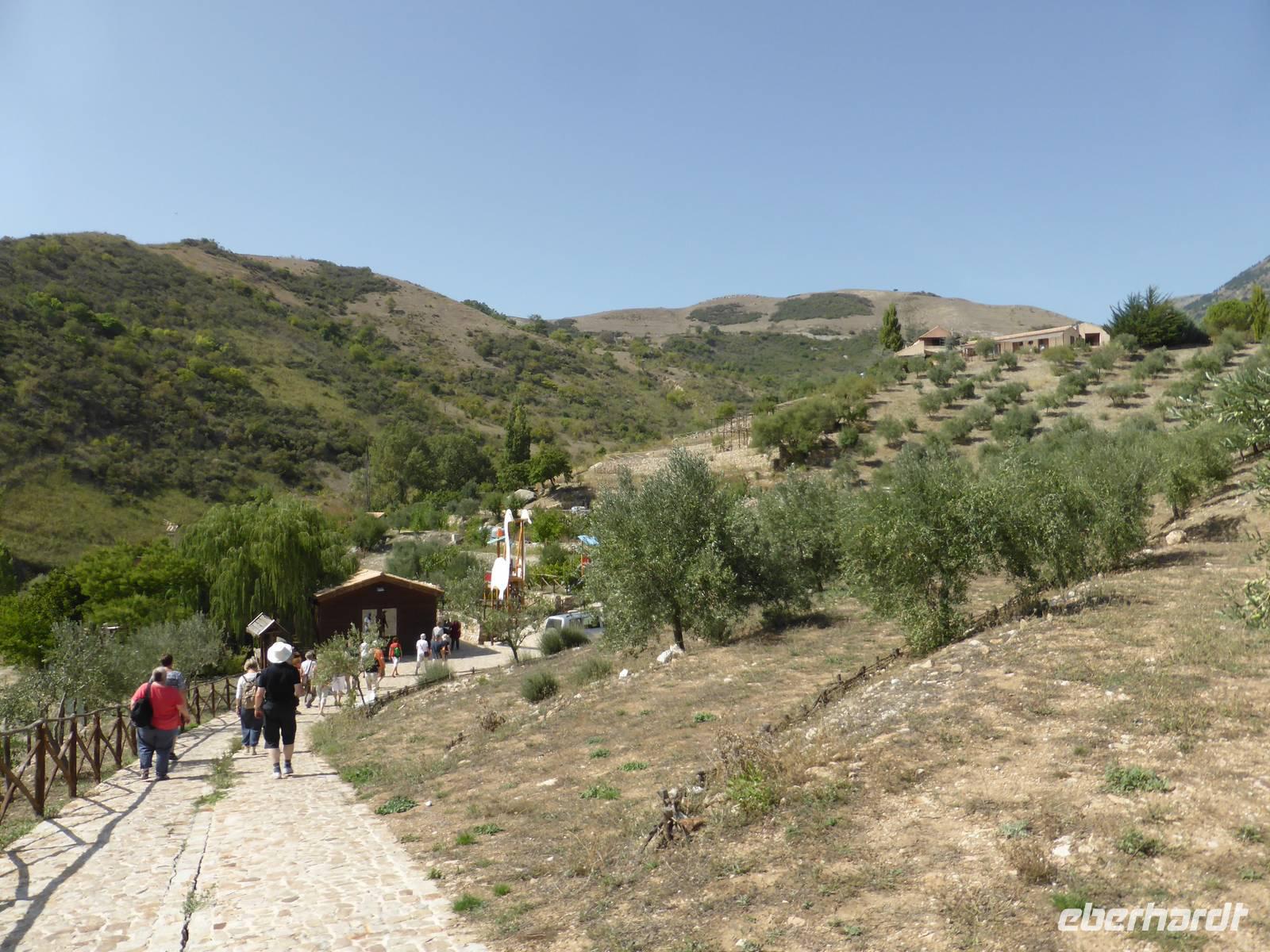 Am Morgen fiel uns der Abschied vom Hotel „Kaos" schwer, da wir uns in der Anlage sehr wohl gefühlt hatten! Doch schon nach wenigen Kilometern war der Kummer wieder vergessen, denn es erwarteten uns bei strahlend blauem Himmel spannende Landschaften im Landesinneren. Unsere Reise führte uns nach Sant Angelo Muxaro. Hier besuchten wir unterhalb des Ortes mit unserem örtlichen Führer Filipo die Höhle des Prinzen (Tomba del Principe). Ungefähr 1000 Grabhöhlen wurden hier von den Sikanern zwischen dem 11. und 5.Jh. v. Chr. aus dem relativ weichen Felsgestein herausgearbeitet. Die bisher größte ist die des Prinzen, weshalb man auch von einer höher gestellten Persönlichkeit ausgehen muss. Sie besteht aus einem ca. 9 Meter großem Vorraum für die religiösen Totenfeierlichkeiten und der Hauptkammer, in der der Tote auf einer Bank bestattet wurde. In den Höhlen wurden auch Grabbeigaben gefunden, welche so bedeutend sind, dass sie heute im British Museum in London und im Archäologischen Museum in Agrigento ausgestellt werden. Vom Höhlengrab fuhren wir dann nach Sant Angelo Muxaro hinauf. Die kleine Stadt liegt auf einem Felsplateau hoch über dem Tal des Platani-Flusses. Im Ort, welcher sehr sauber und gepflegt ist, scheint die Zeit stehengeblieben zu sein. Wir besuchten die Schaf-Käserei von Enzo und Olga inklusive einer Kostprobe ihres Ricotta-Käses und hielten anschließend vor der Bäckerei von Maria und Angelo. Hier probierten wir leckeres Mandel- und Pistazien-Gebäck sowie