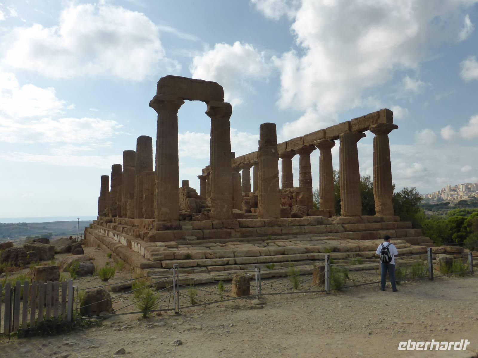 Am Morgen hieß es Abschied nehmen vom Hotel Olimpo und Letojanni. Nach dem Verladen der Koffer fuhren wir über Catania in Richtung Enna und somit ins Landesinnere. Gegen 10.45 Uhr erreichten wir in der Nähe von Piazza Armeria die Villa Romana del Casale, erbaut um das Jahr 300 n.Chr.. Sie liegt in einem Tal am Berg „Monte Mangone" und geriet nach ihrer teilweisen Zerstörung im 12.Jh. bis Mitte des 20.Jahrhunderts in Vergessenheit. Seitdem wurde das 3500 qm große Anwesen wieder Stück für Stück freigelegt. Berühmt ist die Villa für ihre einzigartigen Mosaiken mit Darstellungen der kleinen und großen Jagd, der vier Jahreszeiten oder der leicht bekleideten Mädchen im Gymnastikraum. Die Mosaike sind unglaublich gut erhalten und liefern dadurch wertvolle Informationen über den römischen Alltag, die Jagd und den Vorstellungen der Römer von ihrer Götterwelt. Nach dem Besuch der Villa fuhren wir weiter nach Agrigento, dem antiken Akagras. Zu dieser Zeit war die Stadt nach Siracusa die zweitgrößte auf Siziliens. Vor Ort, im östlichen Ausgrabungsareal angekommen, besichtigten wir den Hera-Tempel mit seinem noch gut zu erkennenden Opferaltar und liefen entlang der ehemaligen Stadtmauer, welche in späterer Zeit auch als Grabgelege diente, zum Concordia-Tempel. Errichtet im 5. Jh. v. Chr. vermittelt er einen lehrreichen Eindruck dorischer Tempelarchitektur mit Säulengang und Cella, einem Raum in welchem sich die Götterstatue befand. Danach gingen wir dann zum Herkulestempel und von dort zum fast vollständig zerstörten Zeus-Tempe, welcher ein Zeugnis des Sieges der Griechen über die Karthager darstellen sollte. Sieben Meter hohe Telamonen (Atlanten) standen über den Säulen an der Außenfassade und trugen auf ihren Schultern das steinerne Dachgebälk. Zwei der riesigen Figuren liegen auf der Grundfläche des Zeus-Tempels und können bestaunt werden. Das besondere an diesem Tempel war, dass es keine freie Säulengalerie wie in anderen Tempelanlagen gab, sondern die Zwischenräume der Säulen zugemauert wurden. Die Telamonen sollten Karthager darstellen, welche man in der Antike wohl auch erkennen konnte, und so war es unabwendbar, dass die Karthager nach der Eroberung Akagras den Zeus-Tempel noch vor dessen Fertigstellung zerstörten. Nach der Besichtigung der Ausgrabungsareale fuhren wir mit dem Bus zu unserem nahegelegenen Hotel „Kaos". Anders als der Hotelname vielleicht vermuten lässt, handelte es sich um eine sehr elegante großzügige Anlage mit einem außerordentlich einladenden Schwimmbecken-Bereich, der bis zum gemeinsamen Abendessen auch von einigen Gästen genutzt wurde. Zum Abendessen waren die Platten voll sizilianischer Spezialitäten und im Anschluss konnten die Kalorien gleich wieder beim Tanzabend unter sizilianischem Sternenhimmel abgebaut werden.