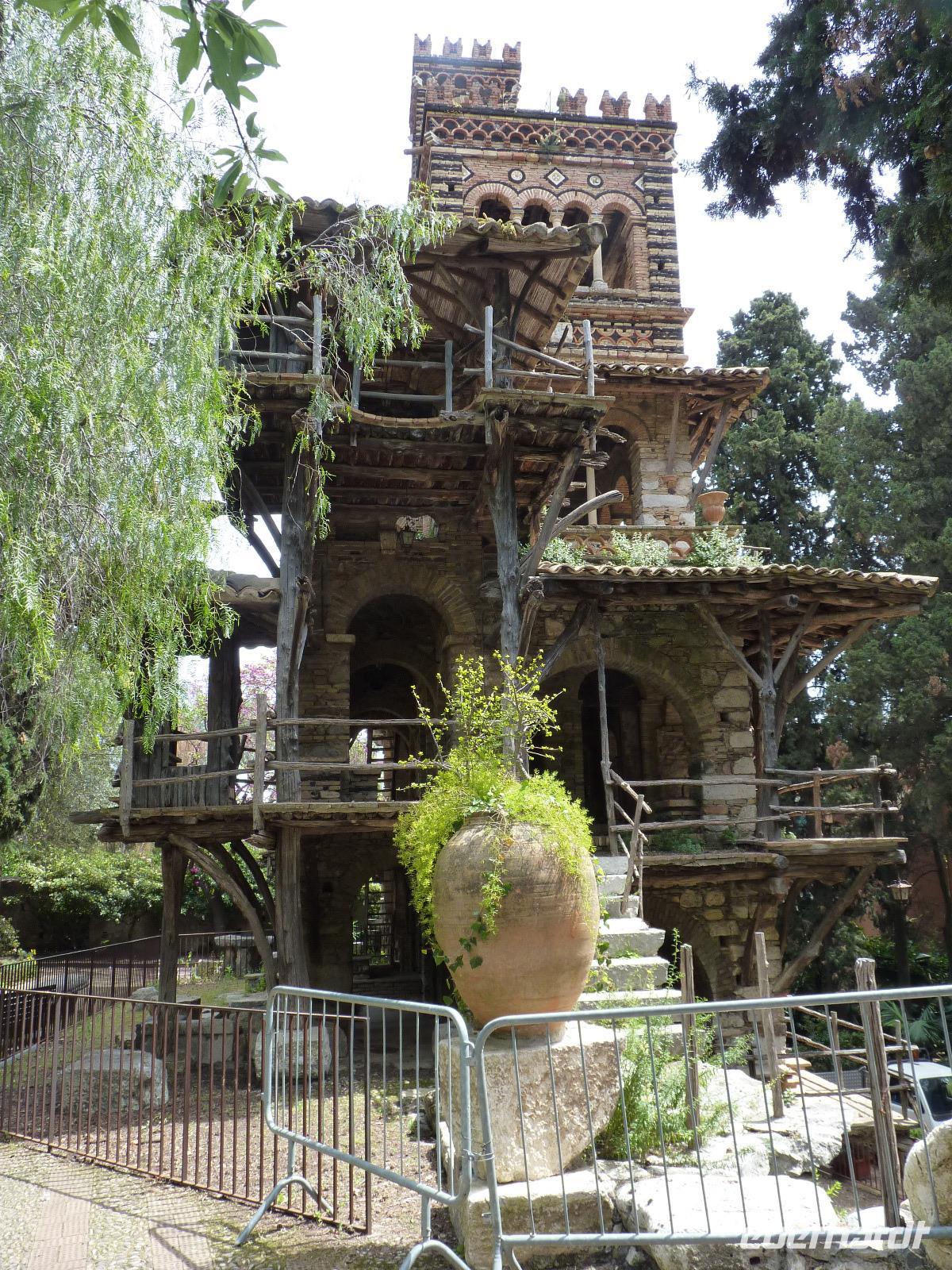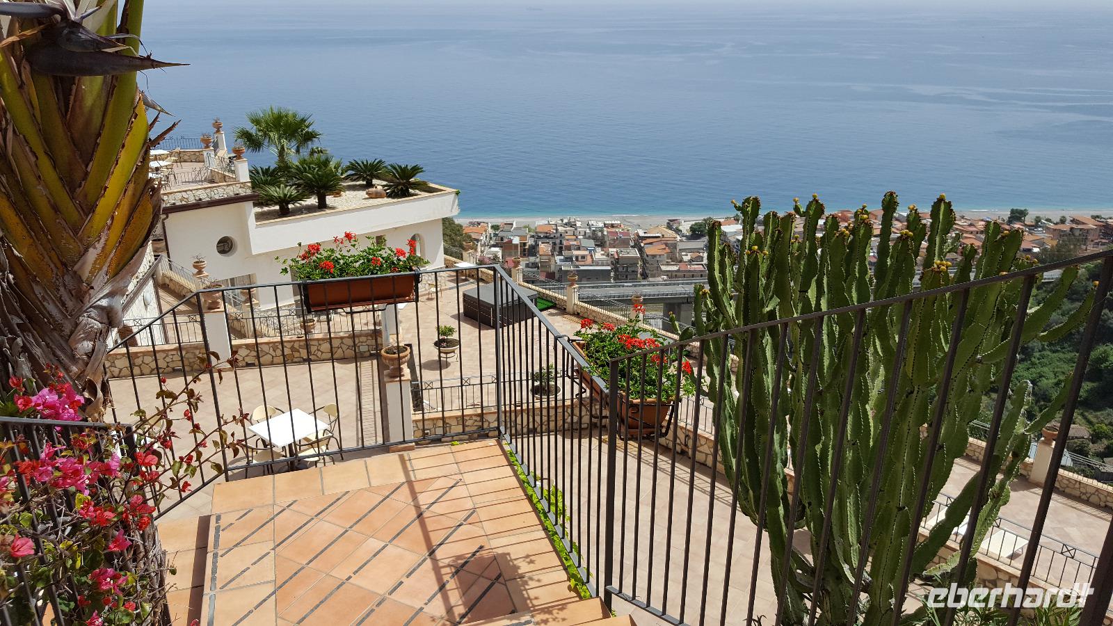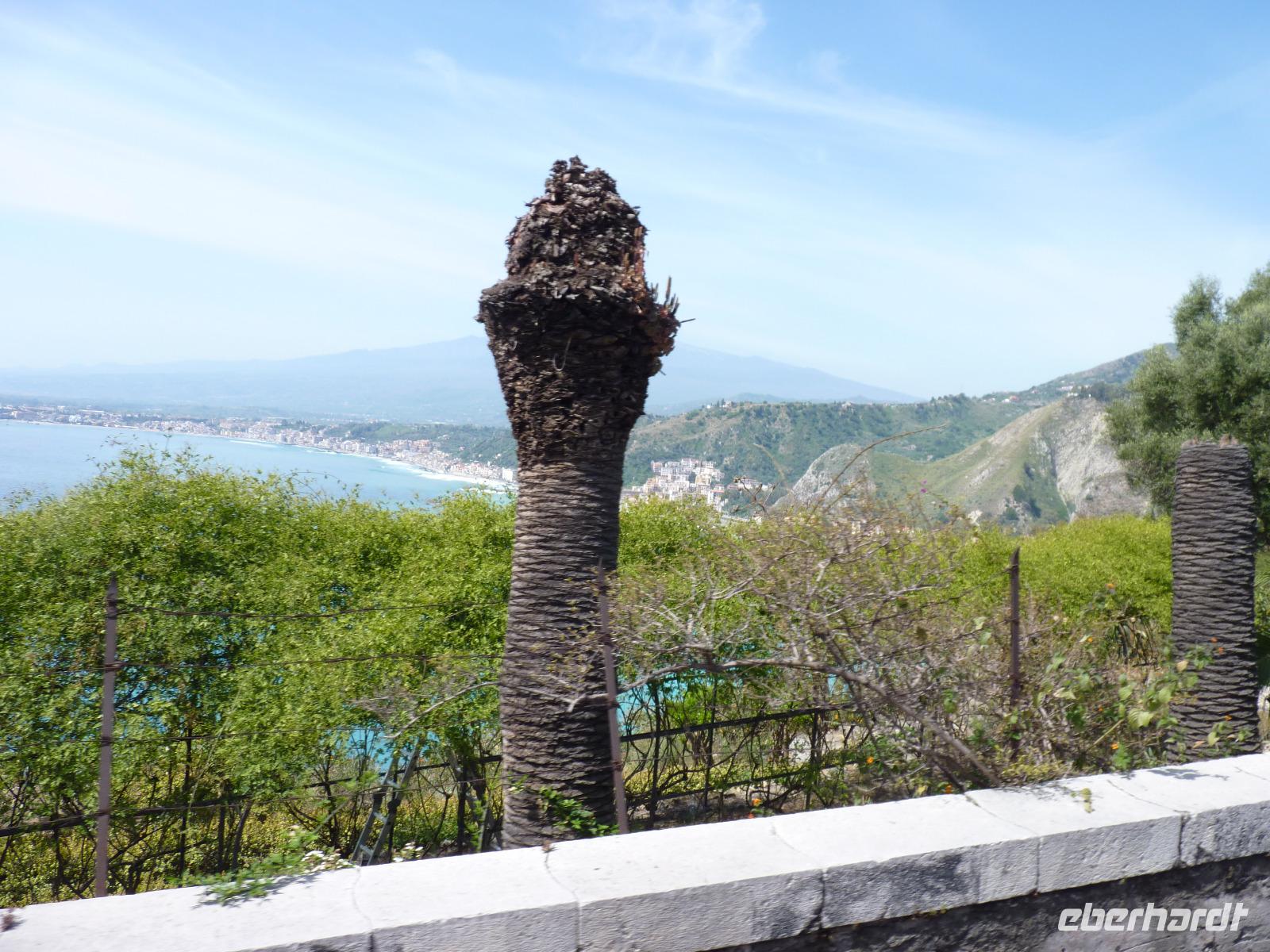 Alte Olivenbäume, Palmen und eine exotische Pflanzenvielfalt bilden diesen wunderschönen Garten, der eine unendliche Ruhe ausstrahlt. Durch den Park schlängeln sich mit Kieselstein gepflasterte Gehwege. Eine Promenade bietet einen atemberaubenden Panoramablick auf die Küste mit dem Ätna im Hintergrund.