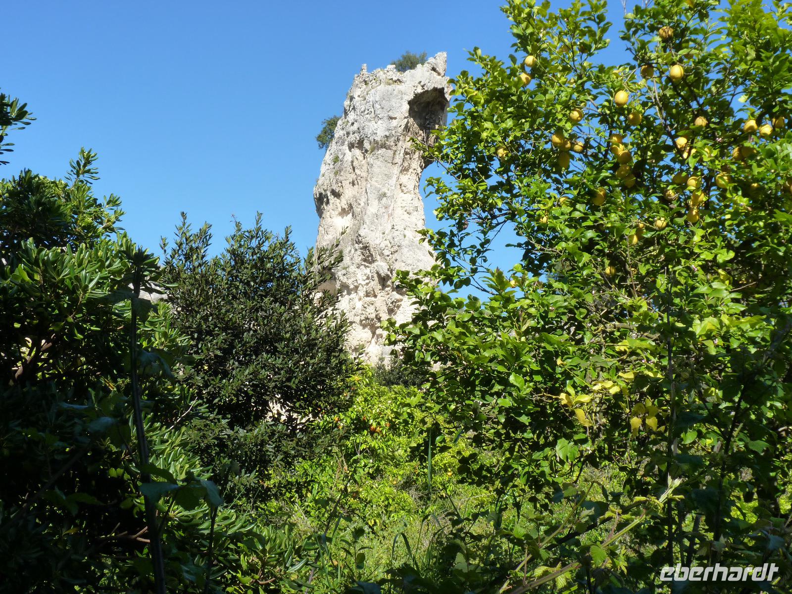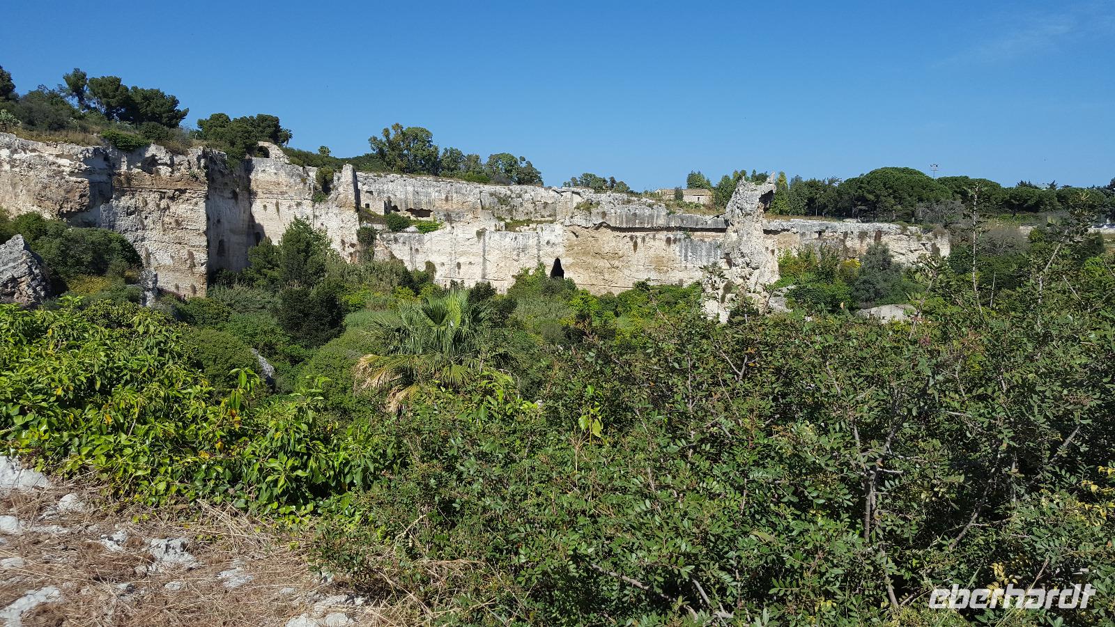 Der ehemalige Steinbruch ist gleich nebenan, heute ein Naturparadies mit Orangenbäumen und vielen anderen Pflanzenarten und wird deshalb auf Italienisch die „Latomie del paradiso" genannt.