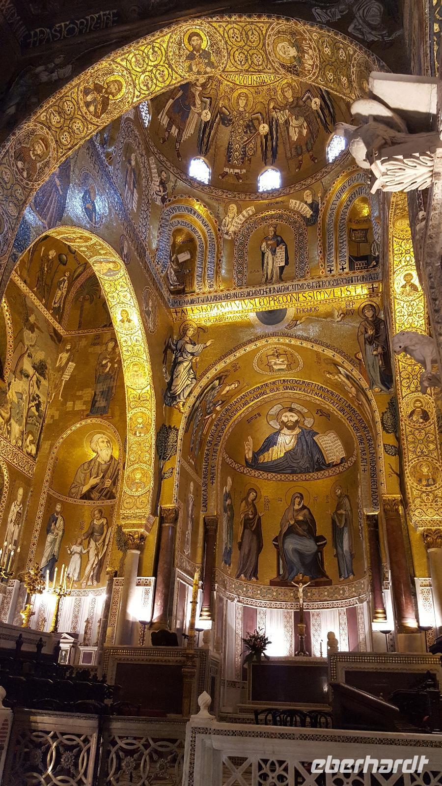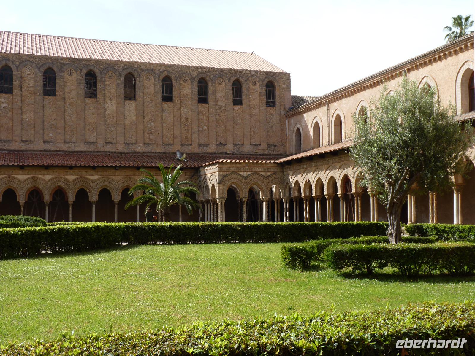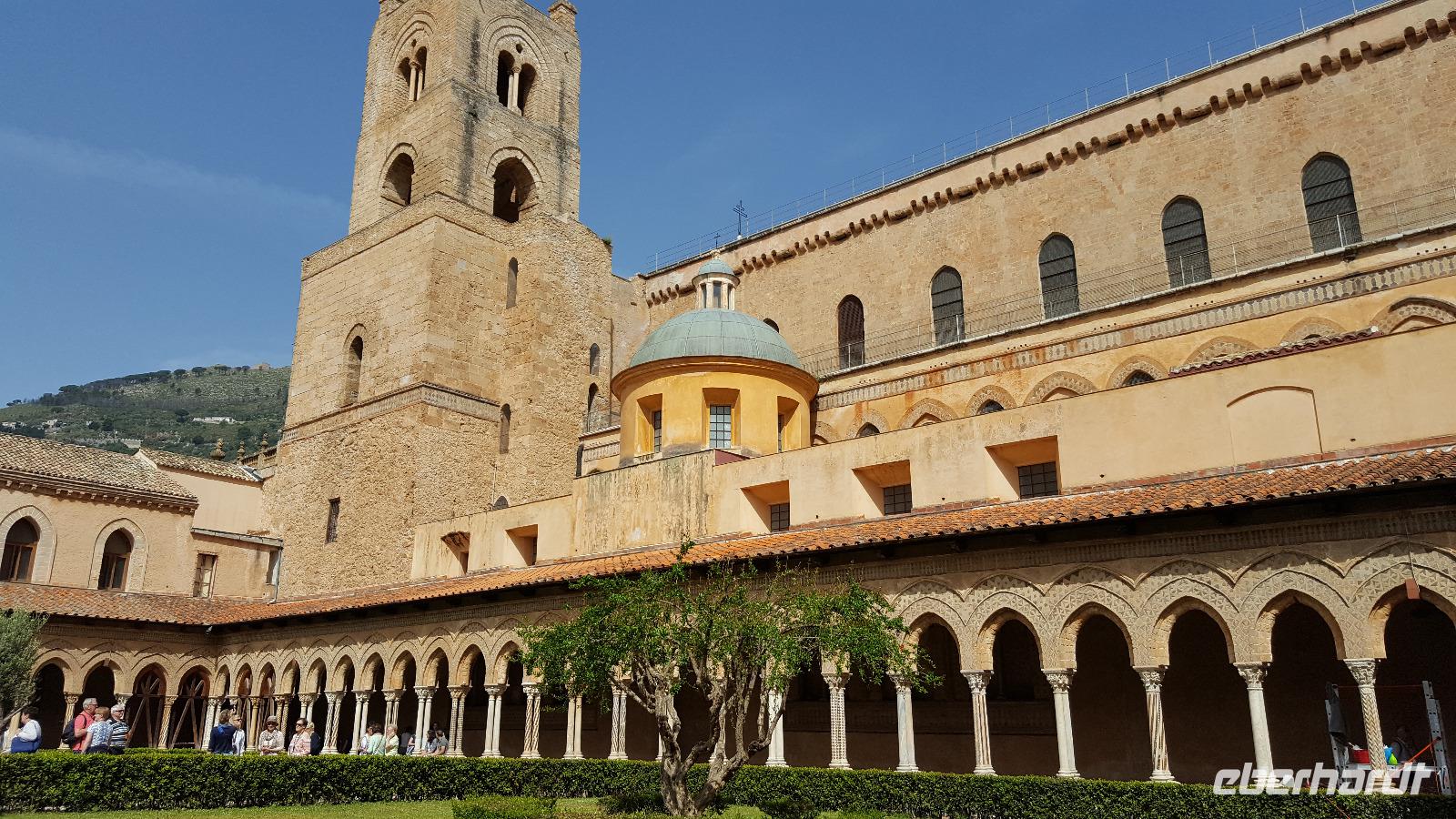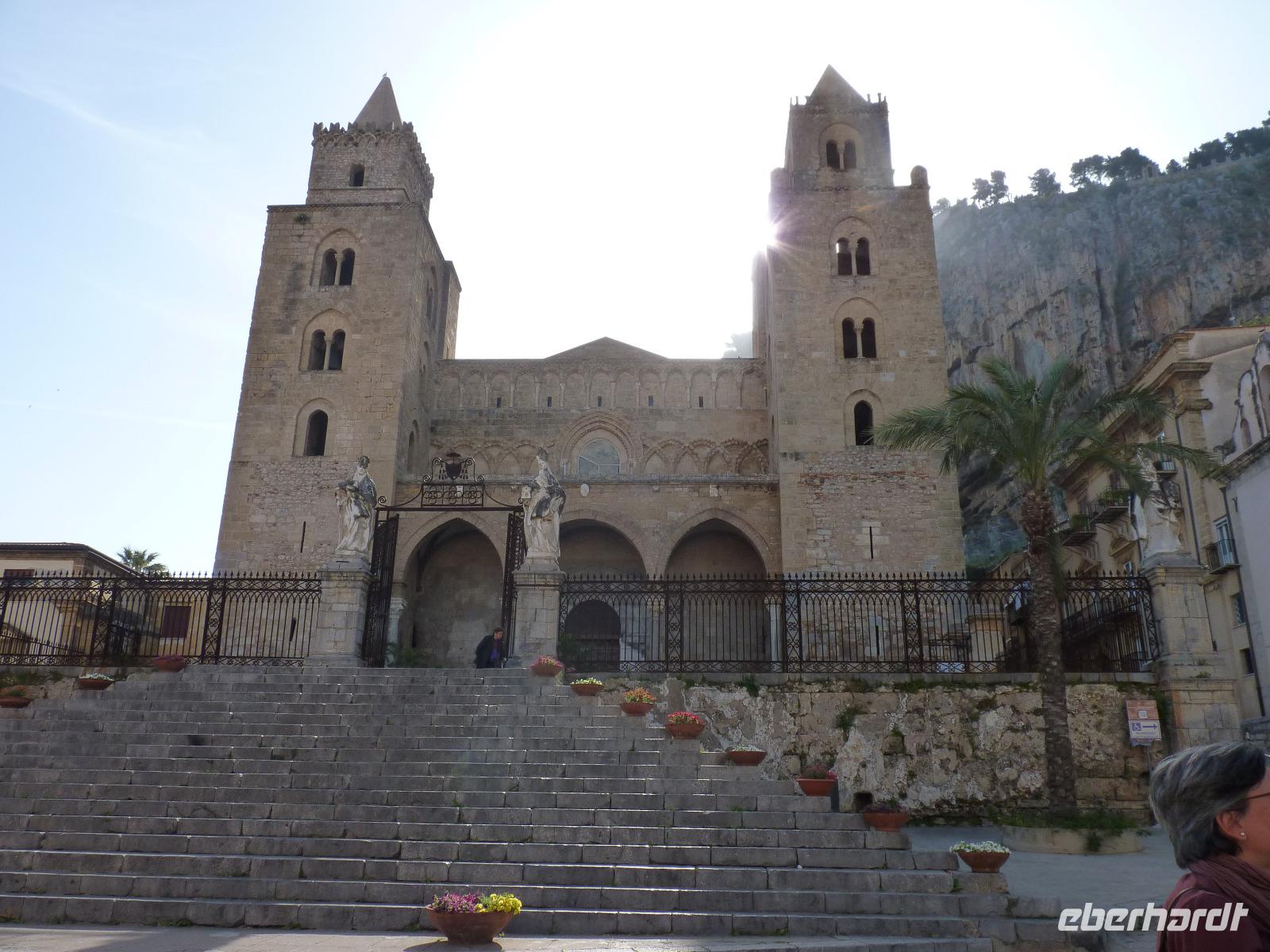 Erster Stopp war Monreale. Zu Fuß ging es 90 Stufen auf den heiligen Berg bis zum Dom. Die Kathedrale ist 102 Meter lang, 40 Meter breit und 35 Meter hoch. Ihre Fassade ist seitlich von zwei Wehrtürmen flankiert, wobei der linke Turm unvollendet blieb und die Kuppel des rechten Turms im 16. Jahrhundert von einem Blitz zerstört wurde.