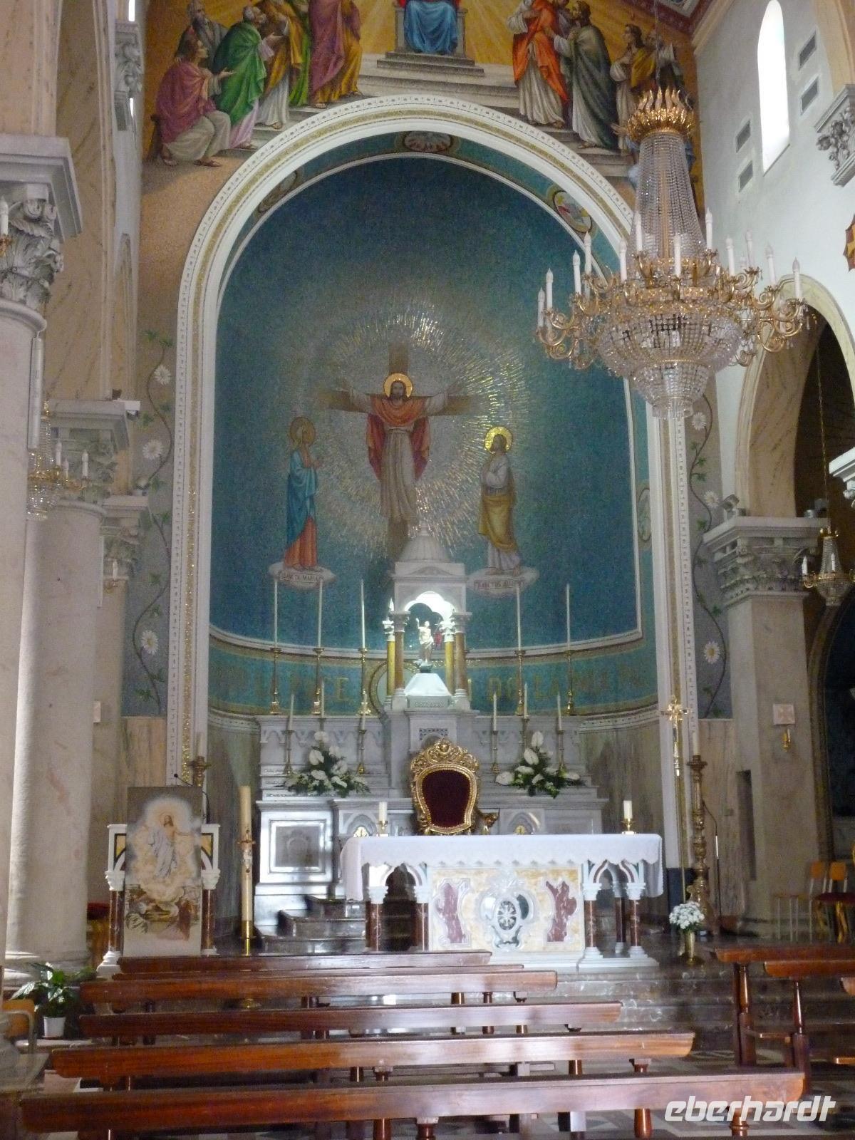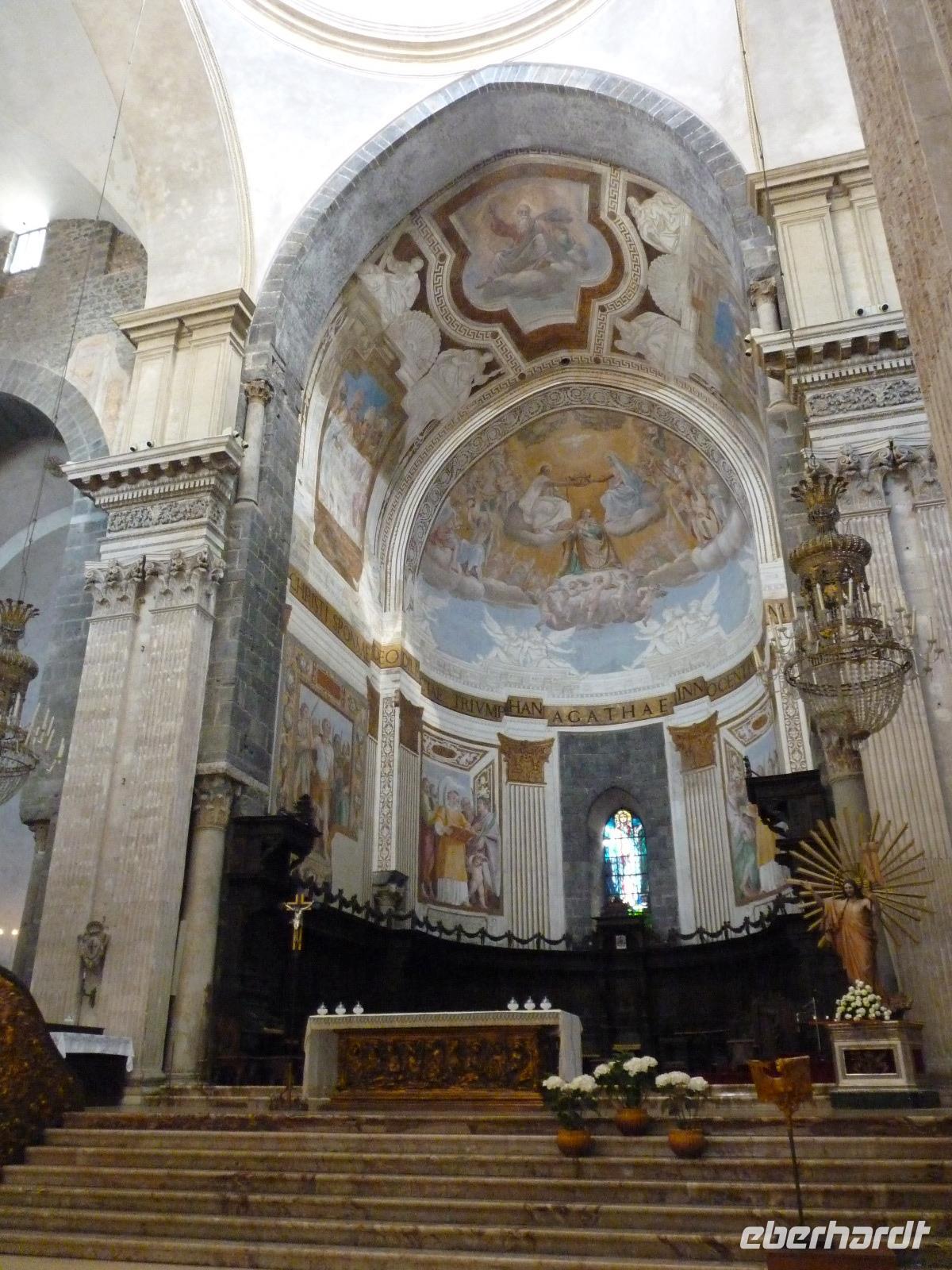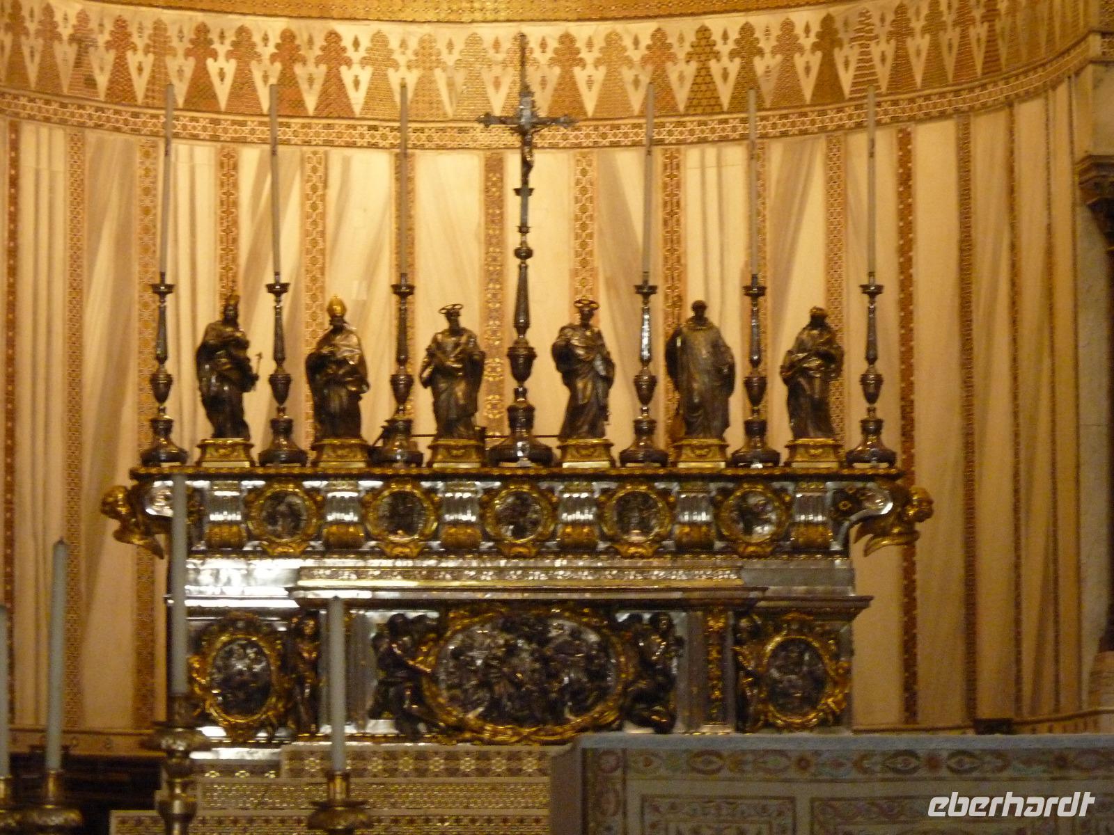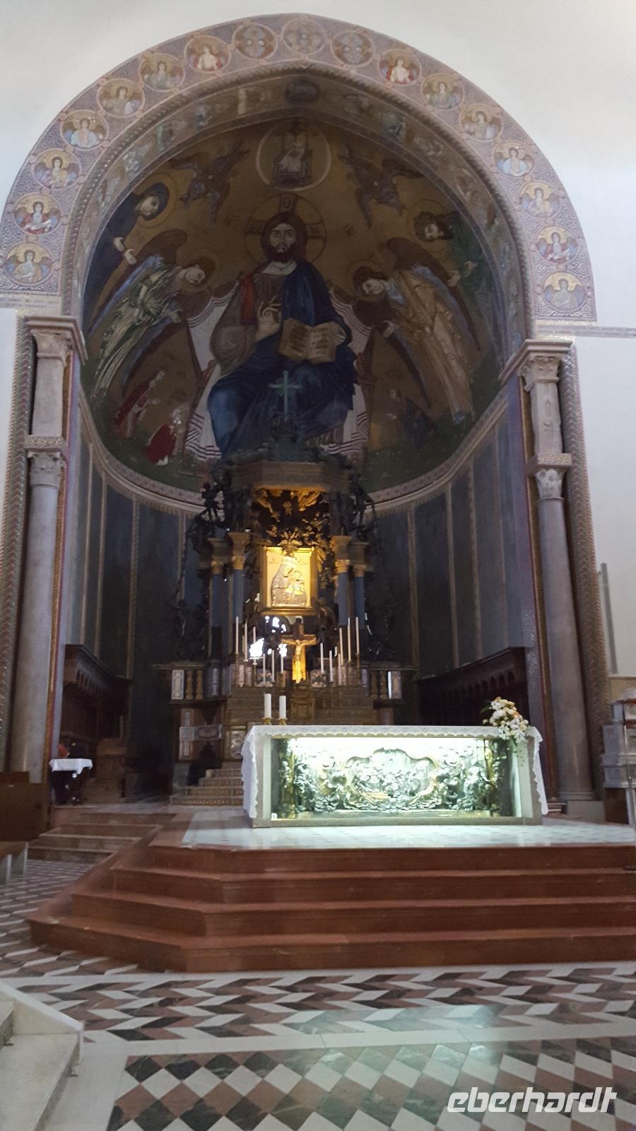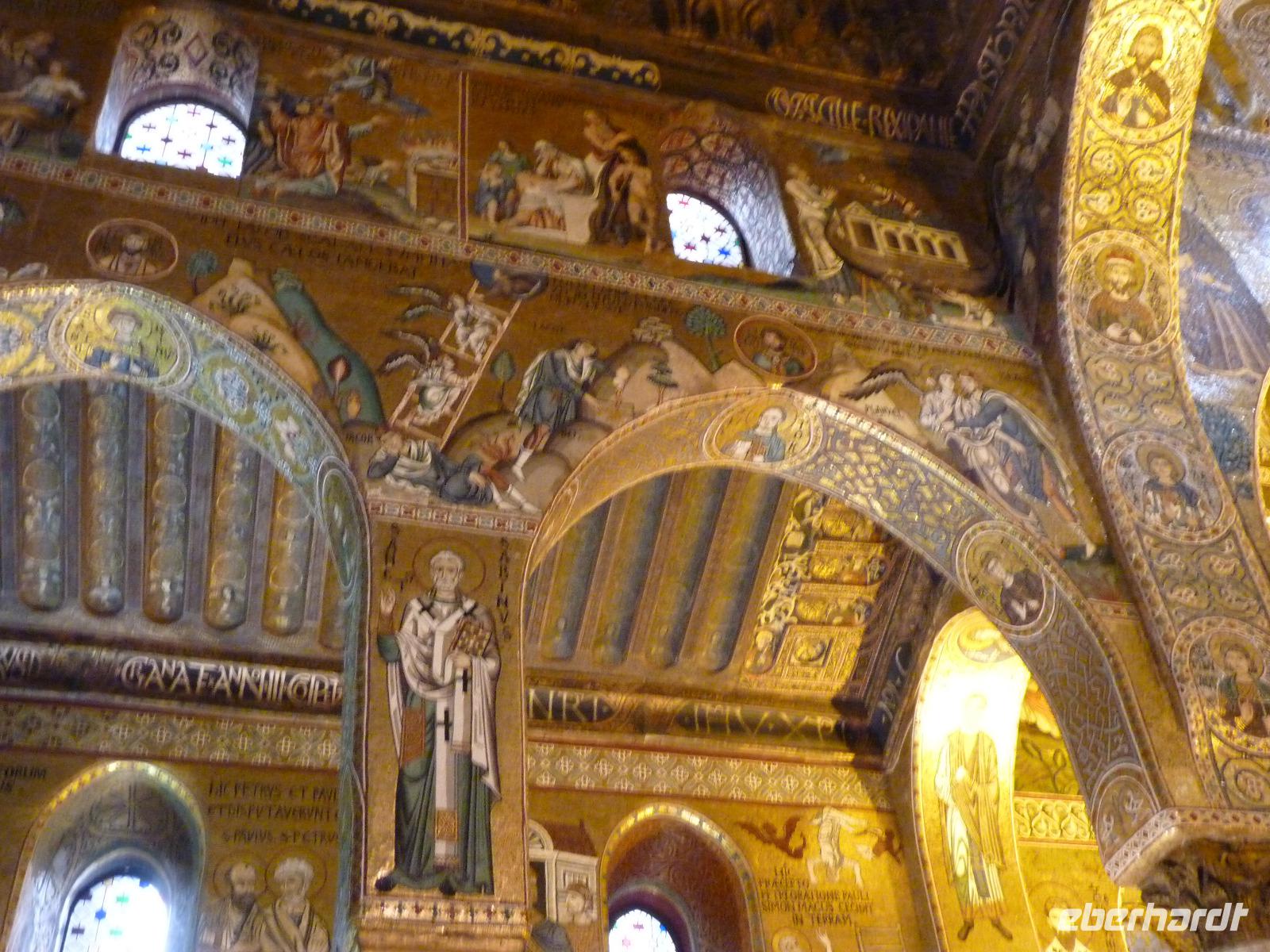 Erster Stopp war Monreale. Zu Fuß ging es 90 Stufen auf den heiligen Berg bis zum Dom. Die Kathedrale ist 102 Meter lang, 40 Meter breit und 35 Meter hoch. Ihre Fassade ist seitlich von zwei Wehrtürmen flankiert, wobei der linke Turm unvollendet blieb und die Kuppel des rechten Turms im 16. Jahrhundert von einem Blitz zerstört wurde.