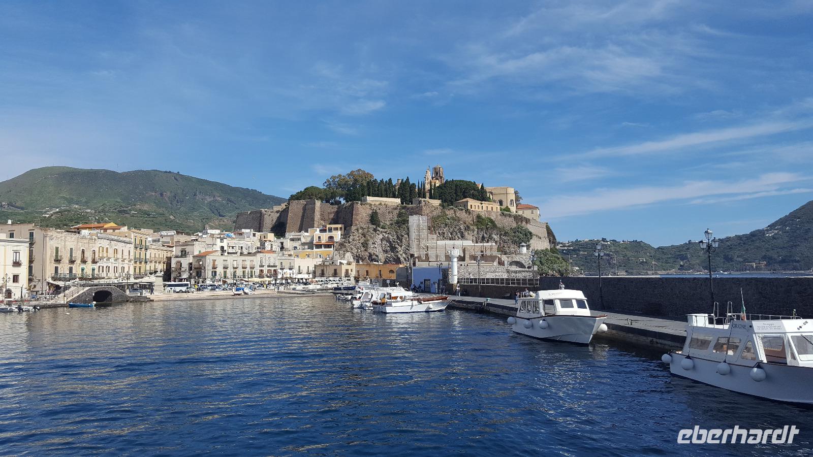 Mit 15 Gästen, unserer örtlichen Reiseleiterin Laura fuhren wir bereits um 7.00 Uhr ab. Ein kurzer Fotostopp bei Messina und gegen 7.45 Uhr erreichten wir den Hafen von Milazzo an der Nordküste Siziliens. Die Stadt und der Hafen liegen am Beginn einer etwa 6 km langen und schmalen Halbinsel und sind Ausgangspunkt für die Fahrten zu den Inseln. Der Archipel der Liparischen Inseln ist die Heimat des griechischen Gottes Äol. Der Legende nach wurde der antike Beherrscher der Winde wurde auf Vulcano geboren und lebte auf Stromboli, der mythischen Insel Aiolia.