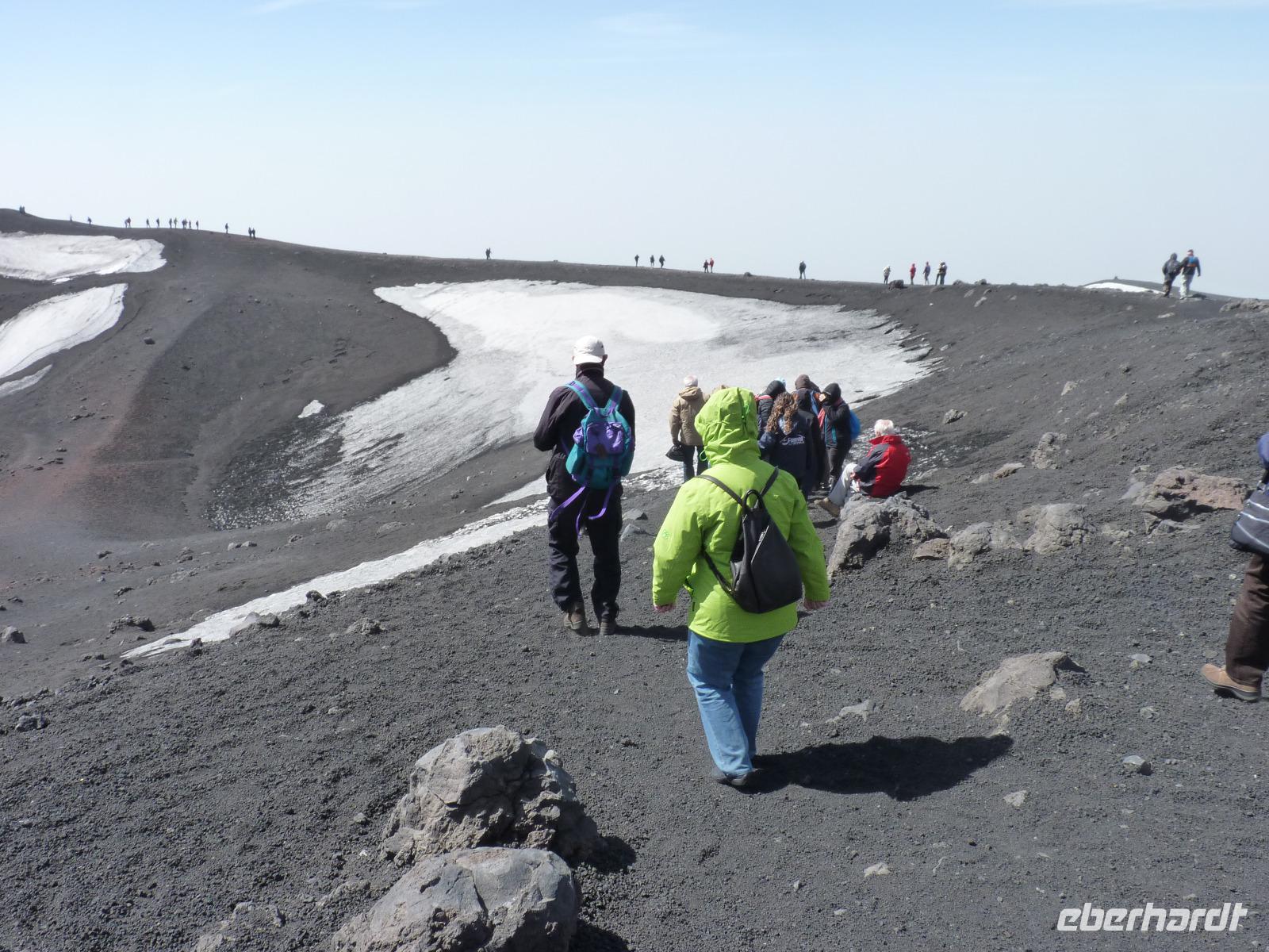 Bei einem Spaziergang ging die Gruppe am Krater entlang. Zwischendurch gab es Erklärungen und Fotostopps. Das Wetter meinte es mit 7°C und Sonnenschein sehr gut mit uns. Trotz alledem brachte der Wind unsere Haare durcheinander.