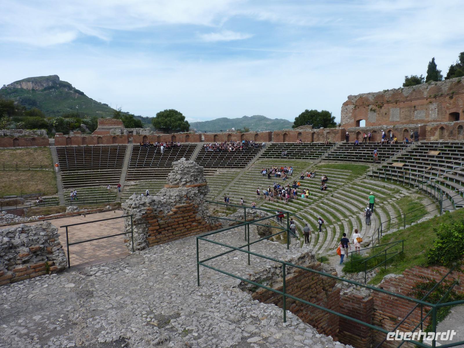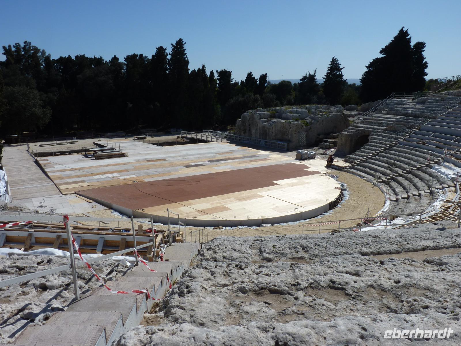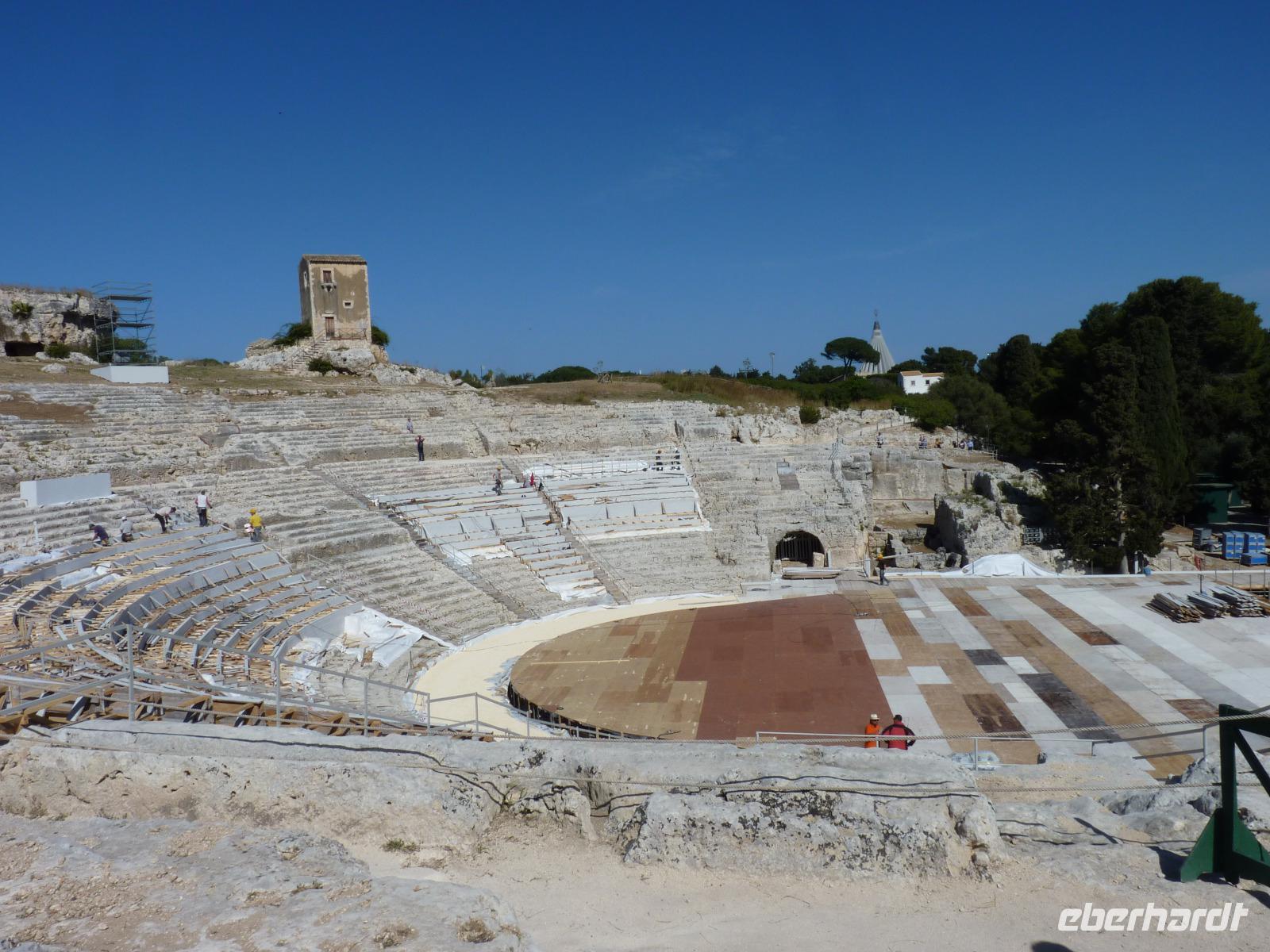 Mit seinen 138 m an Durchmesser ist das Theater in Sizilien und allgemein in der griechischen Welt das größte antike Theater, das uns überliefert ist. Errichtet im 5. Jahrhundert v.Chr. aus dem lokalen Kalkstein in der typischen Hanglage, im 3. noch erweitert und später unter den Römern leicht verändert.