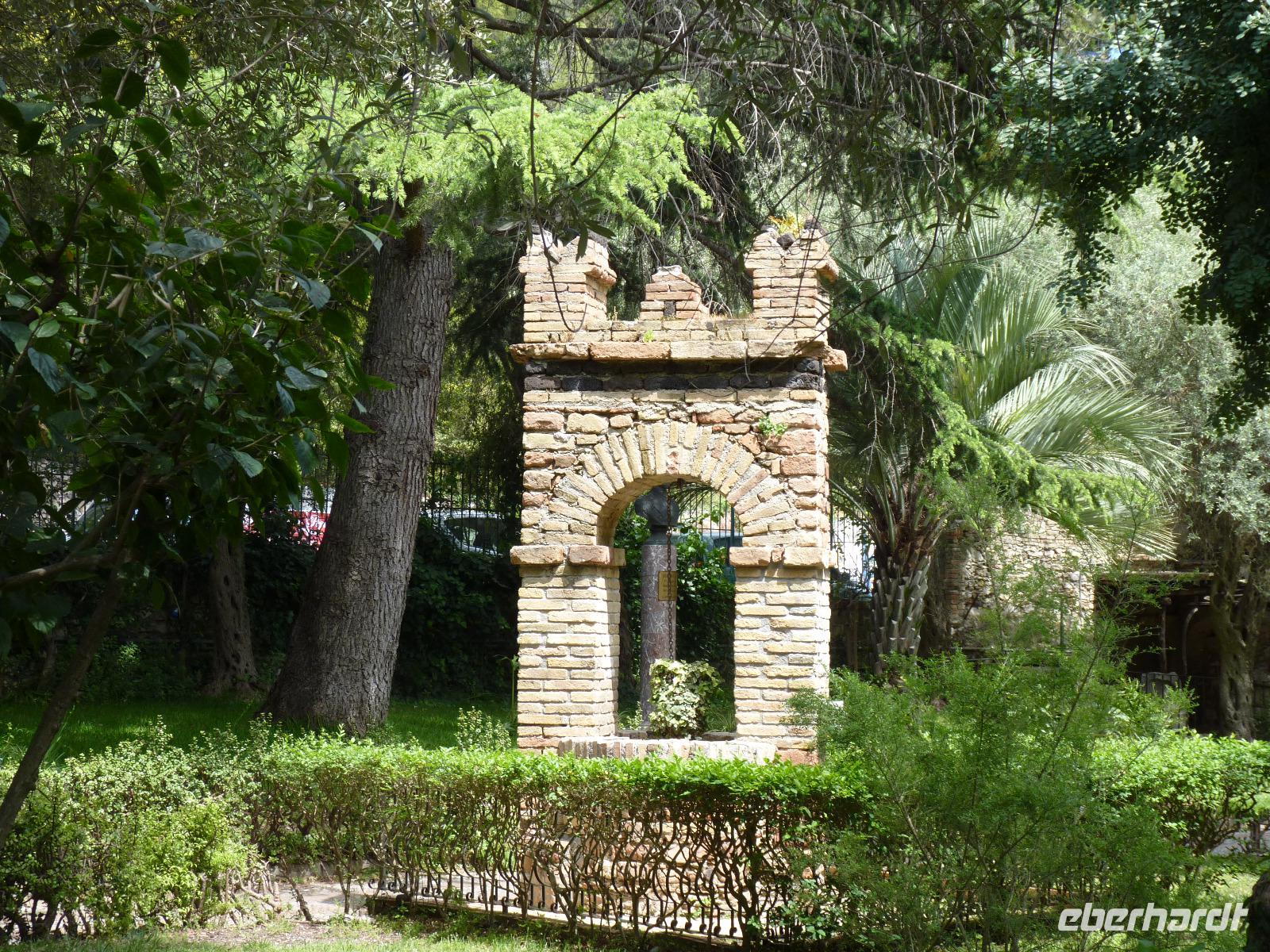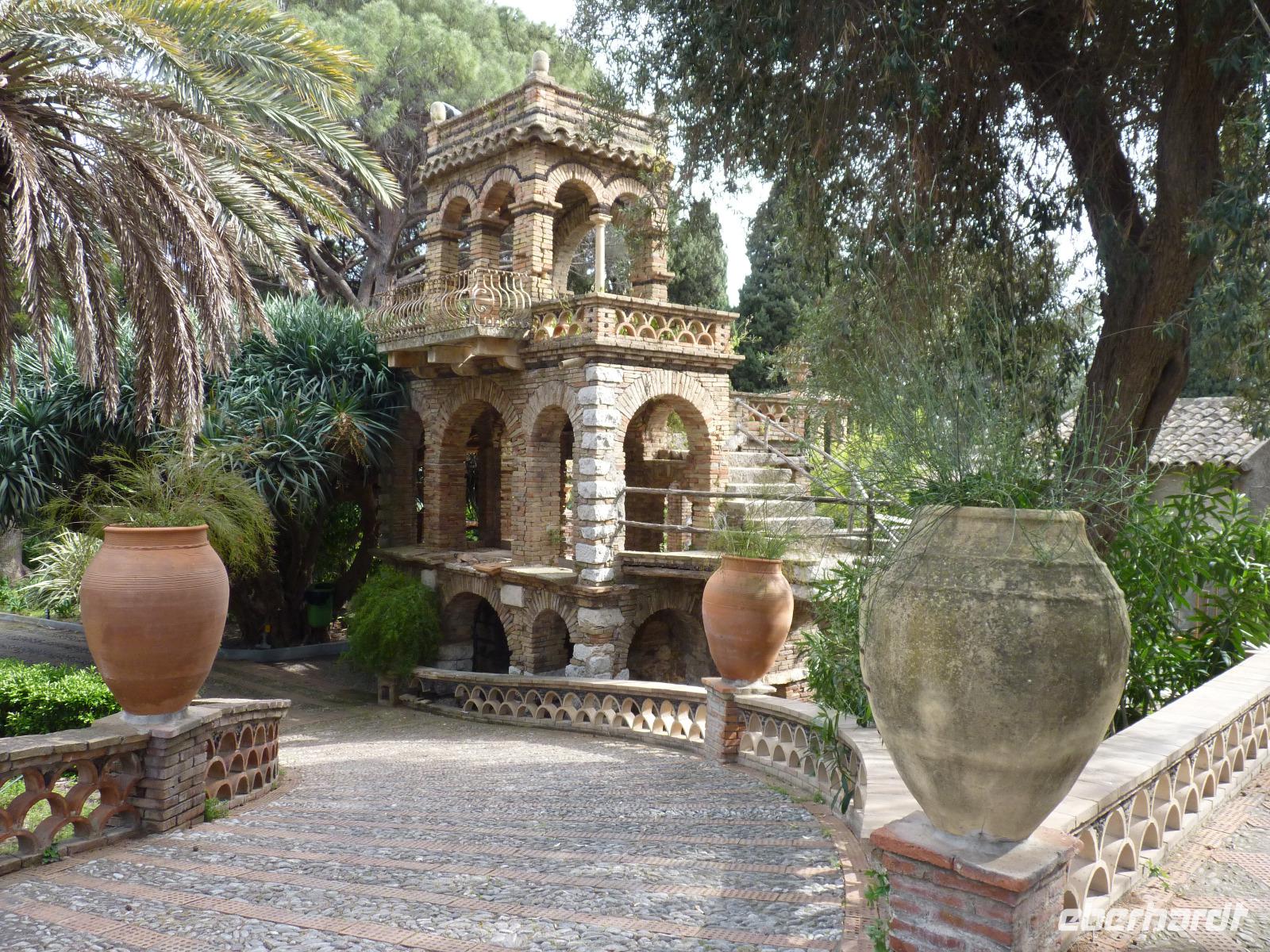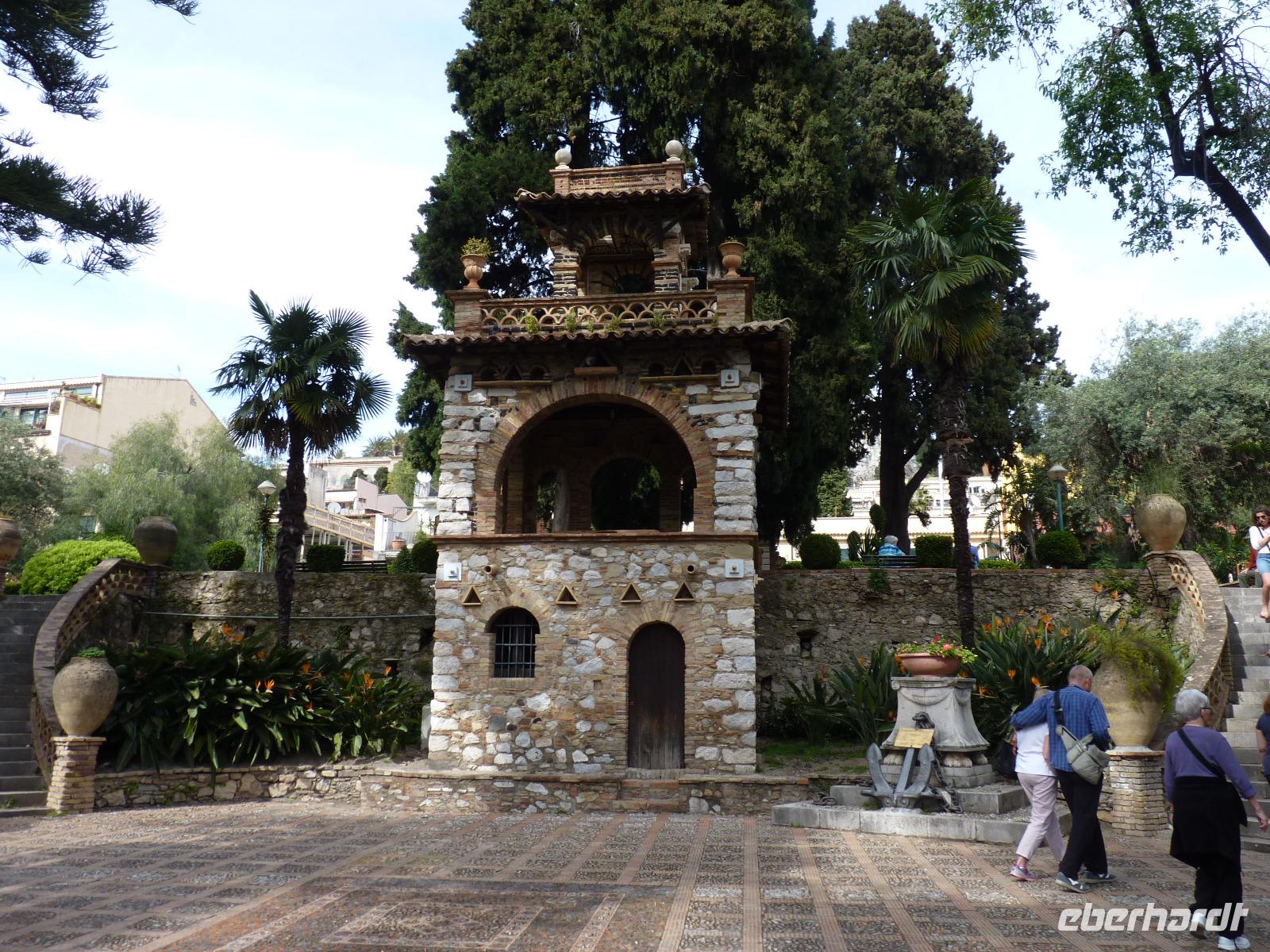 Zwischen dem Corso Umberto und dem antiken Theater liegt etwas tiefer am Hang der Stadtpark von Taormina. Wege, mit Mustern aus Kieselsteinen führen zwischen den Beeten durch, die von niedrigen Hecken aus Bougainvillea und Rosmarin begrenzt sind.