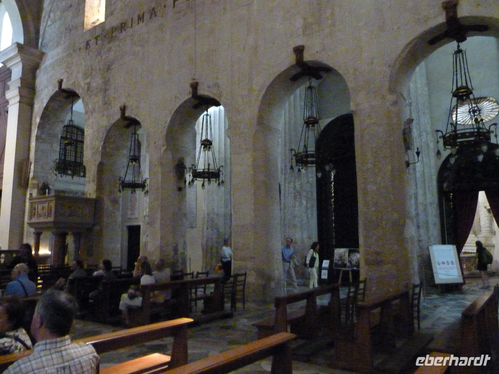 Das Innere der Kathedrale ist durch Säulen mit korinthischen Kapitellen in drei Schiffe unterteilt. Die Wände der Kathedrale sind in ihrem unteren Teil mit Marmor verkleidet, der ebenso wie der Fußboden auf islamische Vorbilder zurückgeht. Die oberen Teile der Wände sind vollständig mit byzantinischen Goldgrund-Mosaiken bedeckt.