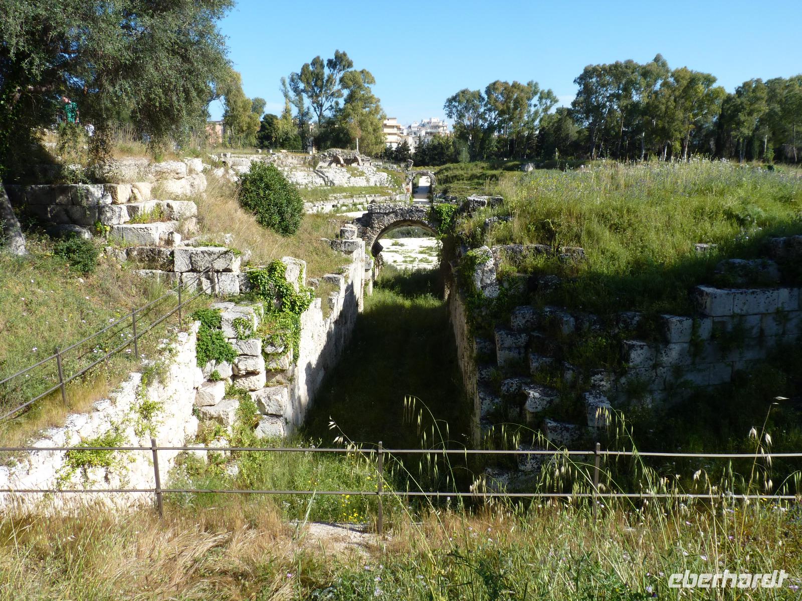 Auf dem Weg dorthin findet man links des Weges den riesigen Opferaltar Hieron II.: Er geht auf das 3. Jahrhundert v.Chr. zurück. Er soll nach griechischen Maßen die Größe eines Stadions haben und war wahrscheinlich Zeus Eleutherios (der Befreier) geweiht.