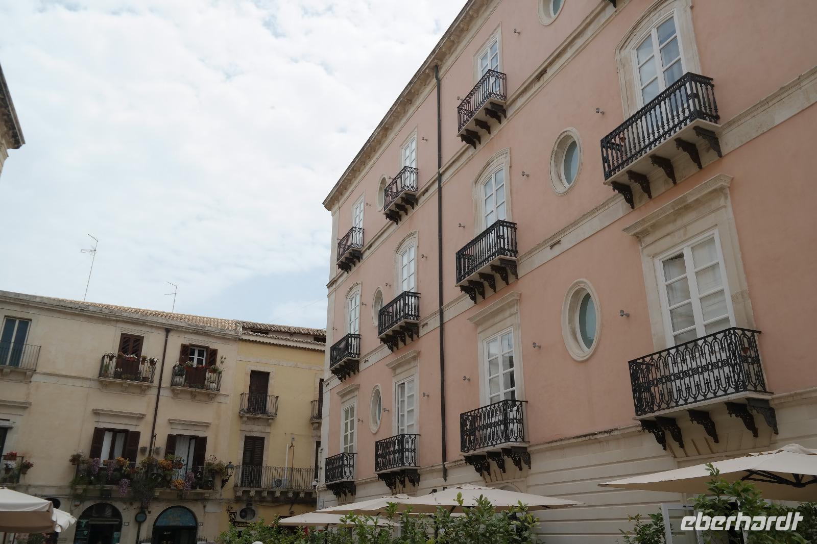 Auch der heutige Ausflug war fakultativ. Es nahmen 12 Gäste daran teil. Um 08.30 Uhr wurden wir von unserer Reiseleiterin Linda und unserem Fahrer vom Hotel abgeholt. Die Fahrt führte uns über Catania in die Provinz Ragusa, welche zu den wohlhabendsten Provinzen Siziliens zählt. Wir besichtigten das besonders eindrucksvolle Landgut der Familie Arezzo, das Castello de Donnafugata. Die Außenfassade des Castello ist sehr eindrucksvoll. Im Inneren standen der Familie Arezzo 122 Zimmer zur Verfügung, von denen viele als Gästezimmer dienten. Bis ins Jahr 1982 wurde das Anwesen auch von der Familie bewohnt, anschließend von der Provinz Ragusa gekauft und der Öffentlichkeit zugänglich gemacht. Nach der Besichtigung fanden wir uns im Restaurant zum gemeinsamen Mittagessen ein. Es wurde viel zu reichlich aufgedeckt, so dass die meisten von uns den Hauptgang gar nicht aufessen konnten. Im Anschluss fuhren wir nach Ragusa. Dort erwartete uns ein traumhafter Spaziergang durch die Stadt. Linda zeigte uns die üppig gestaltete Barockhäuser und verwies uns auf deren extravagante Balkone. Nach einer kleinen Kaffee- und Eispause ging es für uns wieder zurück nach Letojanni Noch immer sind die landwirtschaftlichen Nutzflächen durch steinerne Mauern begrenzt. Am Hotel angekommen, verabschiedeten wir uns herzlich von Linda und bedankten uns für diesen schönen Ausflugstag.