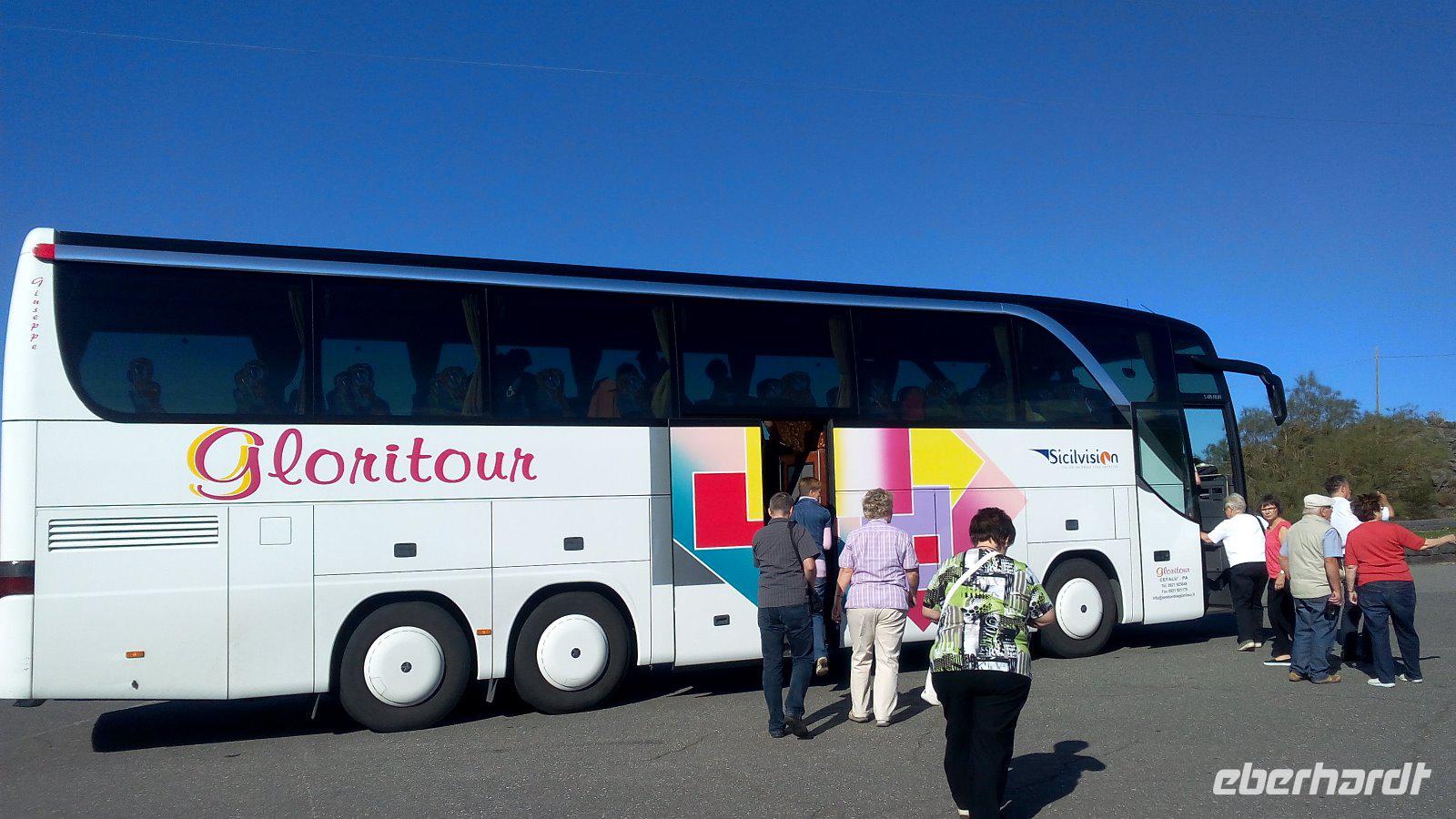 Heute müssen wir die Koffer in den Bus verstauen. Wir verlassen unser erstes Hotel und fahren in das Landesinnere. Unsere Fahrt führt uns vorbei an Catania entlang der A19 mit Blick auf Enna weiter an Valguamera vorbei. Hier müssen wir einen Unfall erleben, der uns aus unserer Urlaubsstimmung reist.