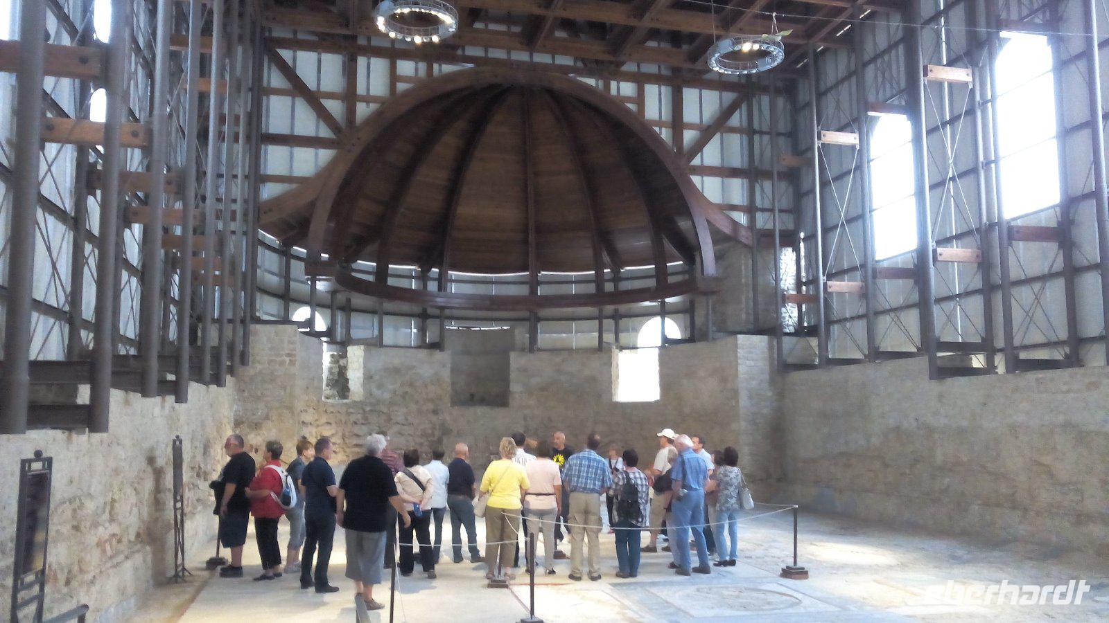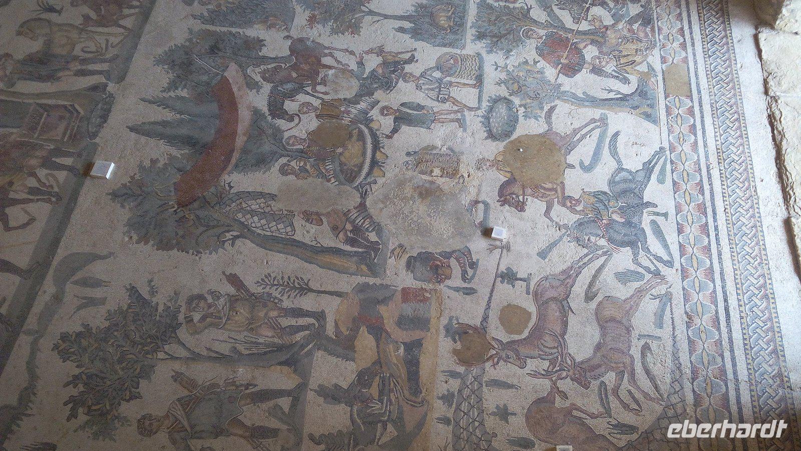 Der Zusammenstoß des Busses mit einem Pkw hinterlässt eine gedrückte Stimmung und leichte Verletzungen bei unseren Gästen. Nach ca. drei Stunden können und wollen wir auch unsere Fahrt fortsetzen. Wir fahren nach Piazza Armerina zur Villa Romana del Casale. Für uns ist es ein Erlebnis, das wir die Villa, die erst seit 2012 vollständig zugänglich ist, besuchen dürfen. Wir sehen eine römische Villa (Weltkulturerbe der UNESCO), die im 12. Jh. durch einen Erdrutsch verschüttet wurde. Es war ein Luxusdomizil. Bisher ist das Herrenhaus, mit seinen annähernd 50 Räumen freigelegt wurden. Hervorzuheben sind die Mosaikarbeiten. Für uns ist es beeindruckend, welche Leistung und Arbeiten vollbracht wurden. Bewunderung finden auch von uns, die weltweit bekannten Bikini-Mädchen. Nach diesem Besuch fahren wir in unser Hotel KAOS im Stadtteil Kaos . Beeindruckend die Hotelanlage. Leider verweilen wir hier nur eine Nacht. Morgen setzen wir unsere Rundreise fort.