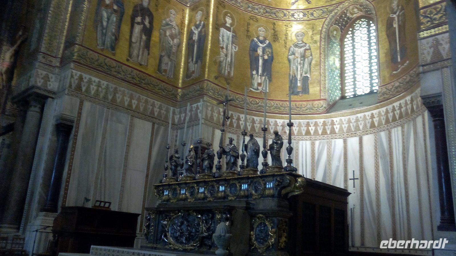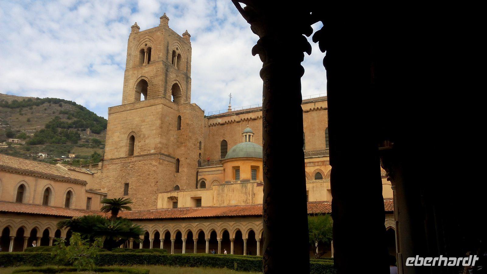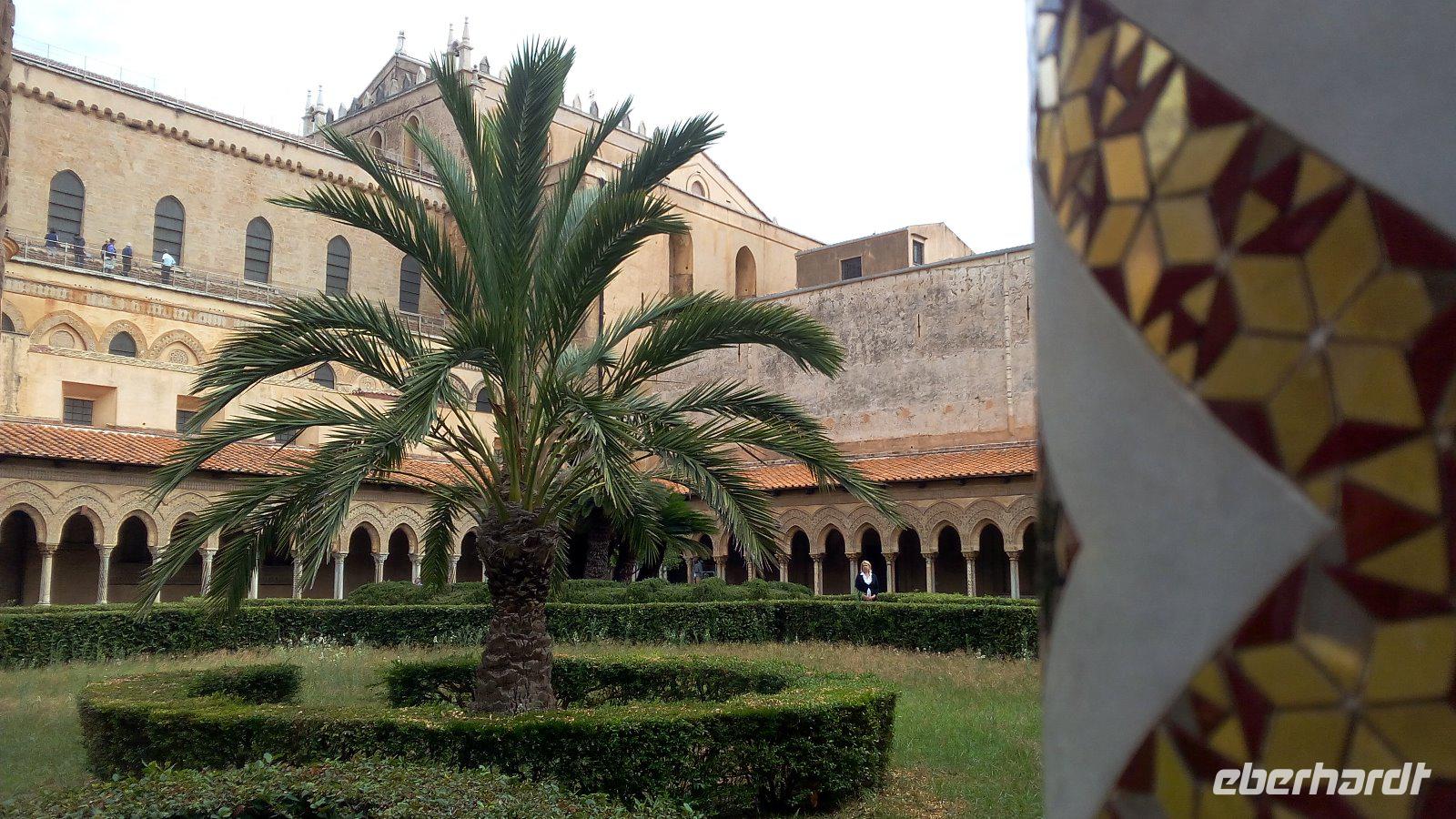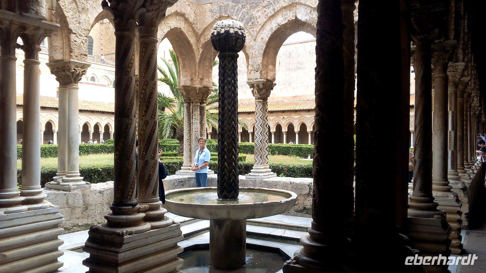 Das Hoch, das uns in den letzten Tagen das schöne Wetter bescherte, hält an und trotzdem möchte keiner den Tag am Meer verbringen, sondern die Hauptstadt der Insel erleben. Wir beginnen die Führung in Monreale und besuchen das bedeutendste Denkmal der Normannenkunst auf Sizilien. Nach den 90 Stufen, die wir gehen oder aber mit einem Taxi fahren, stehen wir vor dem prächtigen Dom. Im Inneren sind wir von den kostbaren Mosaiken überwältigt. Was Künstler hier im 12. Jd. geschaffen haben, ist einmalig. Im Anschluss gehen wir durch den berühmten Kreuzgang der einstigen Benediktinerabtei mit den Doppelsäulen mit Doppelkapitellen.