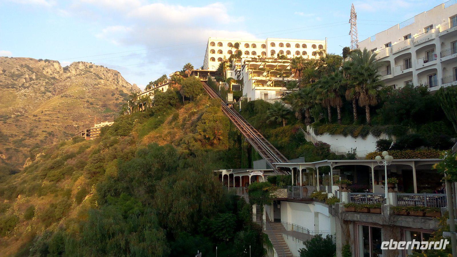 Gegen Mittag treffen wir uns wieder an der Talstation und setzen unsere Fahrt an der Ostküste fort. Wir haben einen weiteren Programmpunkt auf unserer Tagesordnung. Wir fahren nach Taormina. Es soll die schönste Stadt der Insel sein. Hoch über uns liegt sie. Wir fahren mit einem Shuttlebus in die Stadt und besuchen als Erstes das griechische Theater. Es beinhaltet aber auch alle Merkmale eines spezifisch römischen Theaters. Begründet ist es darin, dass das Theater im 3.Jh.v.Christus unter Hieron II. von Syrakus angelegt wurde. In der römischen Zeit wurde es rundum erneuert und deshalb sehen wir auch ein römisches Theater. Simon wird nicht müde uns dieses Wissen zu vermitteln und alle hören gespannt zu. Weiter geht unser Rundgang durch die Stadt und wir sehen noch die Villa Comunale und den Stadtpark.