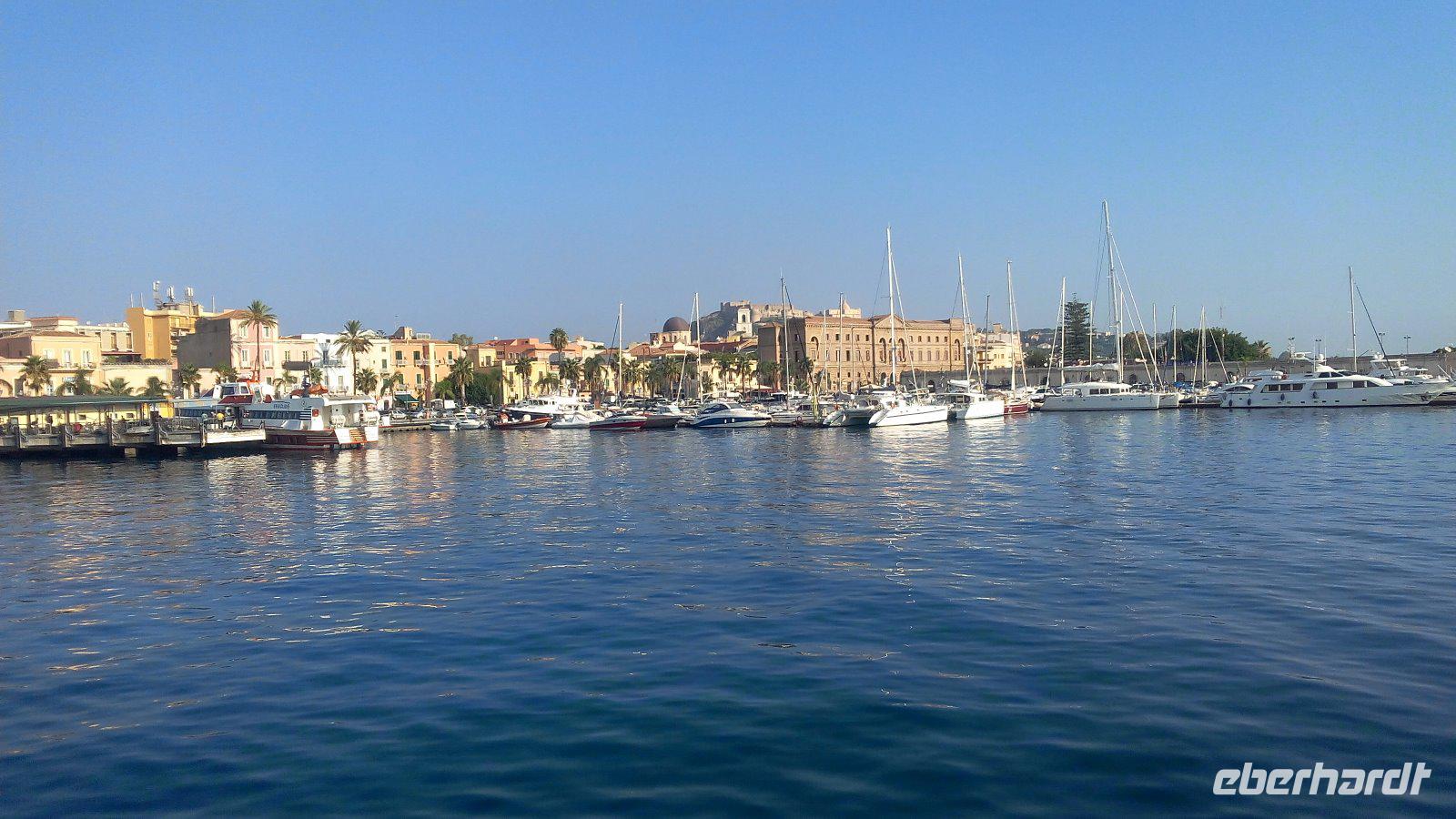 Bei der Fahrt in die Stadt sehen wir die Straße von Messina, deren engste Stelle 3 km breit ist.