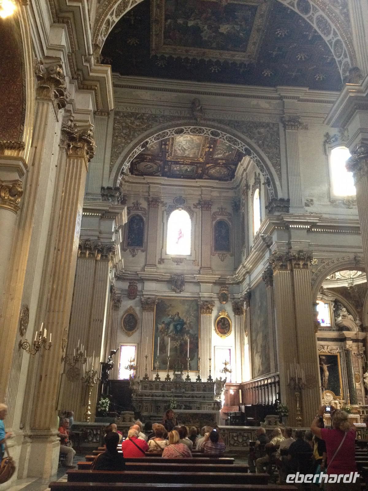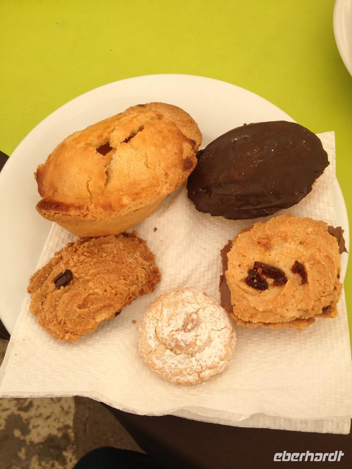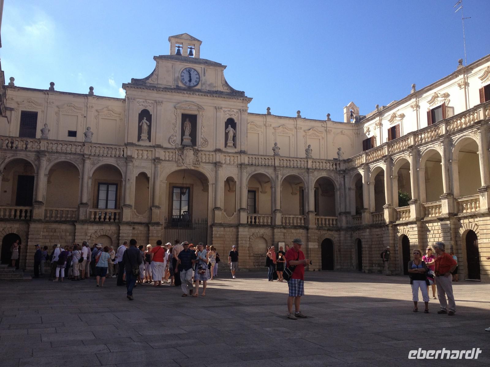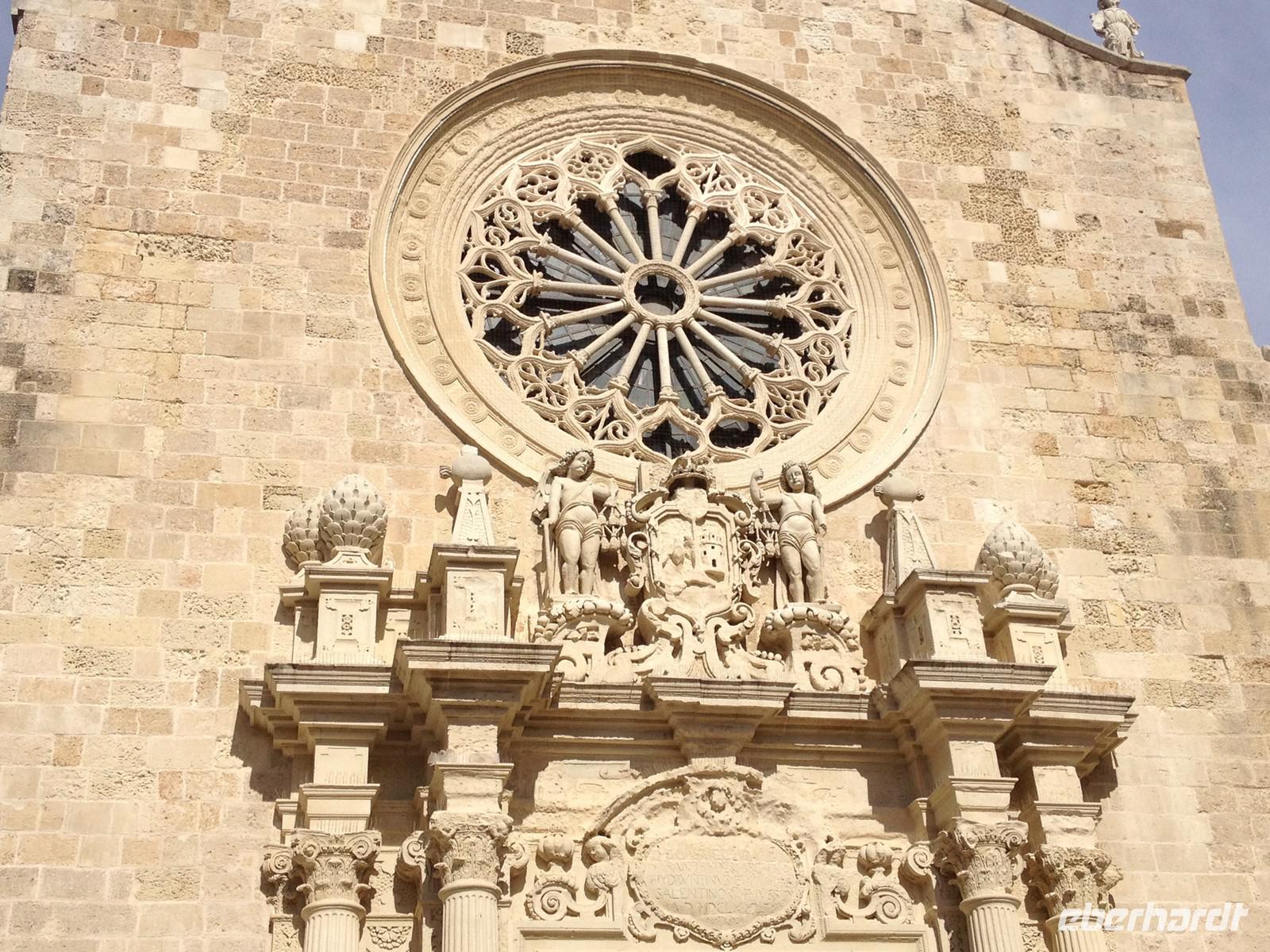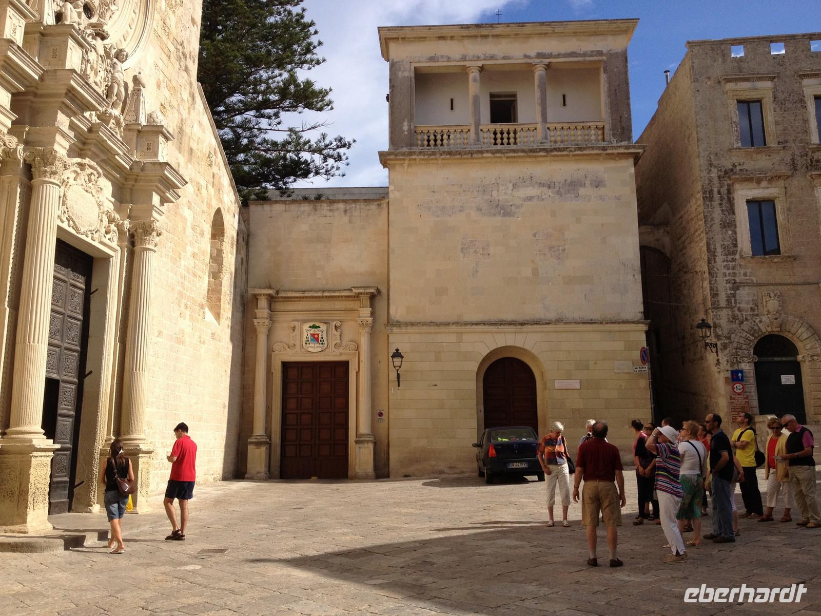 1,5 Stunden Fahrt hieß es heute Morgen, denn auch der Süden der Region will doch auf dieser Reise erkundet werden. So fuhren wir von Fasano aus gen Süden und erreichten zunächst Lecce, wo wir am Stadttor den Bus verließen und die Altstadt zu Fuß unsicher machten. Wir besichtigten die bekannte Kirche Santa Croce und auch das Amphitheater. Dann gab es eine weitere Überraschung zum Mittag, denn wir stoppten an einem bekannten Café der Stadt, nahmen draußen Platz und jeder bekam einen Teller mit allerlei leckeren Gebäck der Region serviert. Dazu einen italienischen Cappuccino - so kann man es sich gut gehen lassen! Sehr köstlich und typisch von der Region Apulien: das Gebäck aus Mandeln! Danach hatten wir ein wenig Zeit zum shoppen. Der ein oder andere hat auch etwas gefunden J. Von Lecce aus starteten wir um 13 Uhr nach Otranto. Wir bummelten zunächst ein Stück am Hafen entlang und bogen dann durch die gewaltige Festungsmauer in die Altstadt ab und gingen ein wenig bergauf bis zur Kirche mit den tollen Bodenmosaiken und der Krypta mit den 800 aufbewahrten Schädeln. Auch hier blieb uns wieder ein wenig Zeit für individuelle Erkundungen und kurz vor 17 Uhr begannen wir die Rückreise mit musikalischer Untermalung, die gute zwei Stunden in Anspruch nahm.