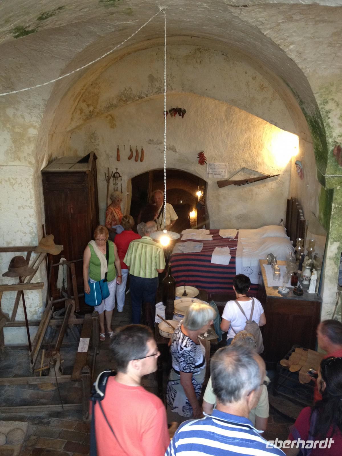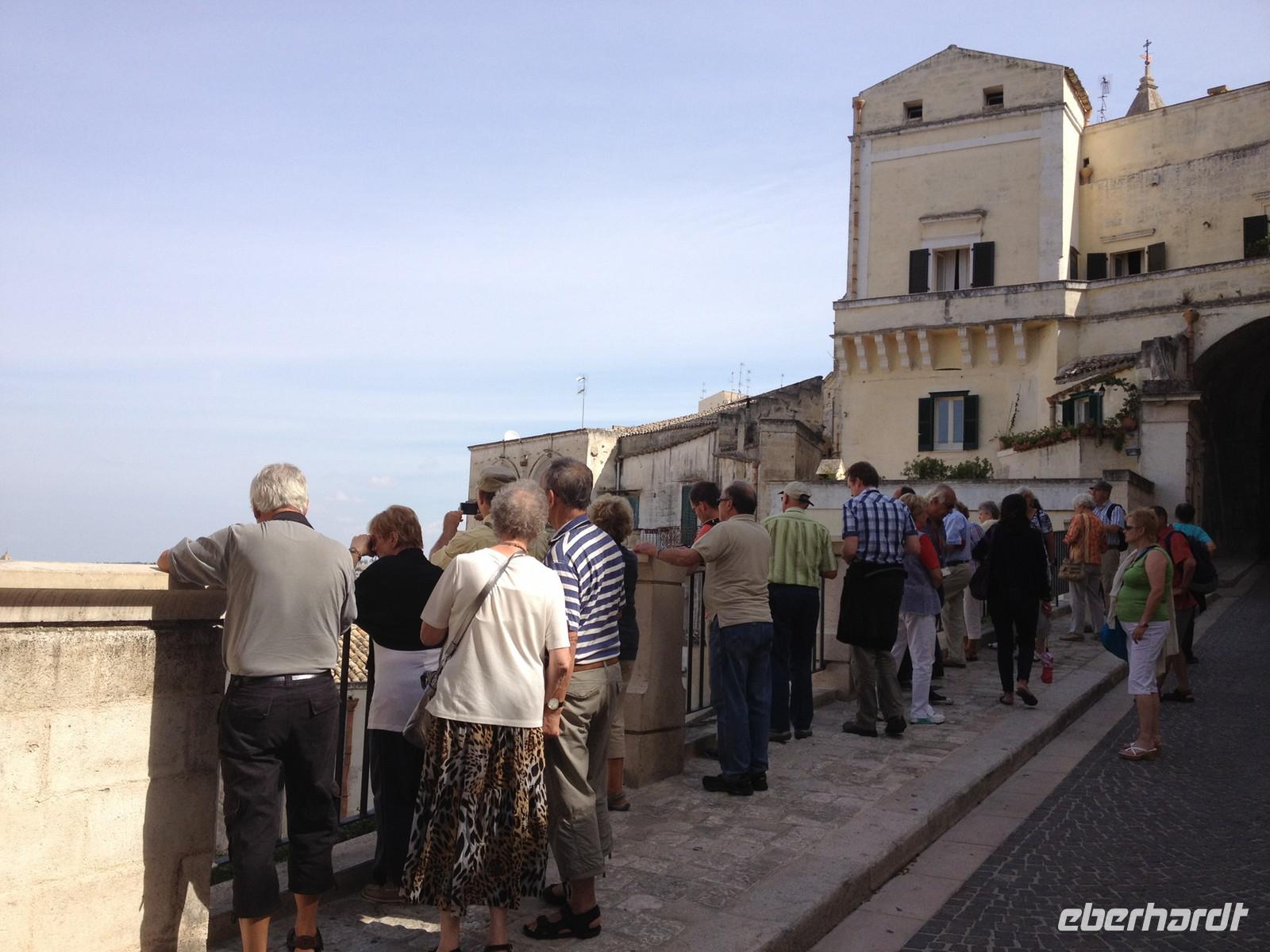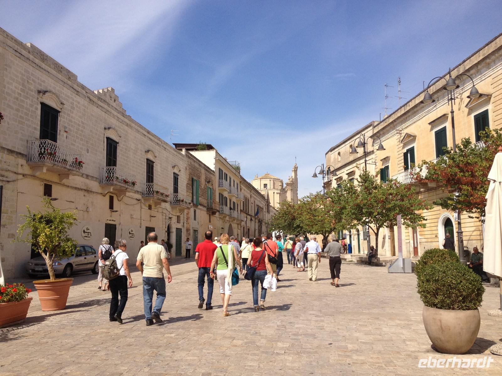 Unser heutiger Ausflug führte uns zunächst in die Stadt der Sassi - nach Matera. Wir verließen die Region Apulien und erreichten die Basilikata. Matera ist seit 2002 in Deutschland bekannt geworden, da diese Stadt Filmkulisse zum Mel Gibson Film „Die Passion Christi" war. Salvatore entließ uns aus dem Bus und wir marschierten frohen Mutes in die Stadt hinein. Dann ging es immer wieder Treppen hinauf und Treppen hinab. Dabei besahen wir die zahlreichen Höhlenbehausungen, die teils restauriert aber auch teils verlassen vorhanden sind. Wir schauten uns solch eine Höhlenwohnung an und auch eine Kirche in der Höhle. Unglaublich, wie man hier zu damaliger Zeit hauste. Nach drei Stunden Stadtspaziergang legten wir eine Mittagspause ein und anschließend gingen wir gemeinsam wieder zum Bus. Weiter fuhren wir mit Salvatore nach Altamura. Hier gibt es eine besondere Spezialität und Eberhardt TRAVEL hat wieder eine Überraschung für uns parat: wir besichtigen eine Bäckerei und dürfen zahlreiche Brotsorten kosten. Dazu gab es Wasser und Saft und auch kleine Mozzarella-Kügelchen. Lecker! Anschließend spazierten wir noch kurz in die Altstadt von Altamura, wo man gerade dabei, zahlreiche Lichterkränze und Dekorationen von den Häuserfassaden zu entfernen. Sicher wurde hier vor ein paar Tagen ein Patronenfest gefeiert. Kurz vor 17 Uhr brachte uns der Bus wieder zurück nach Selva di Fasano, wo wir 18:15 Uhr wieder ankamen und uns auf das letzte gemeinsame Abendessen vorbereiteten.