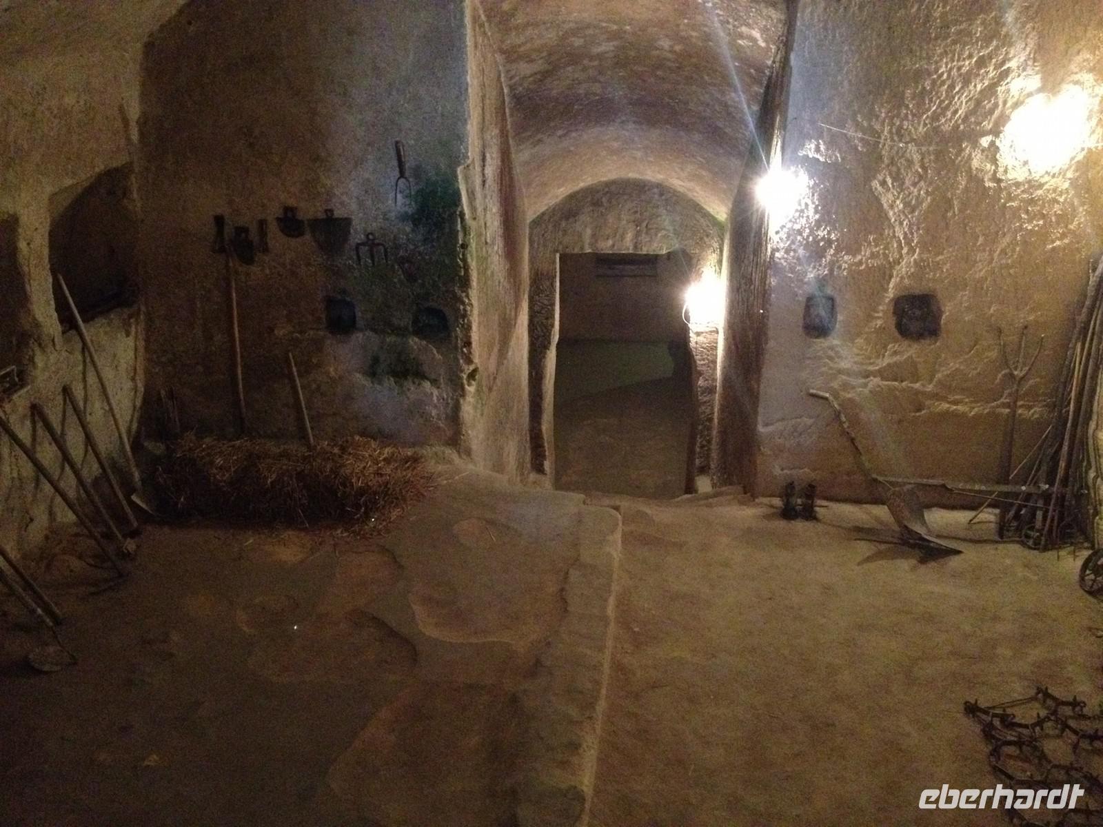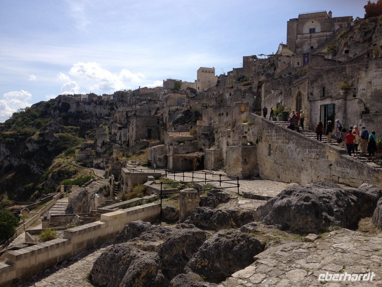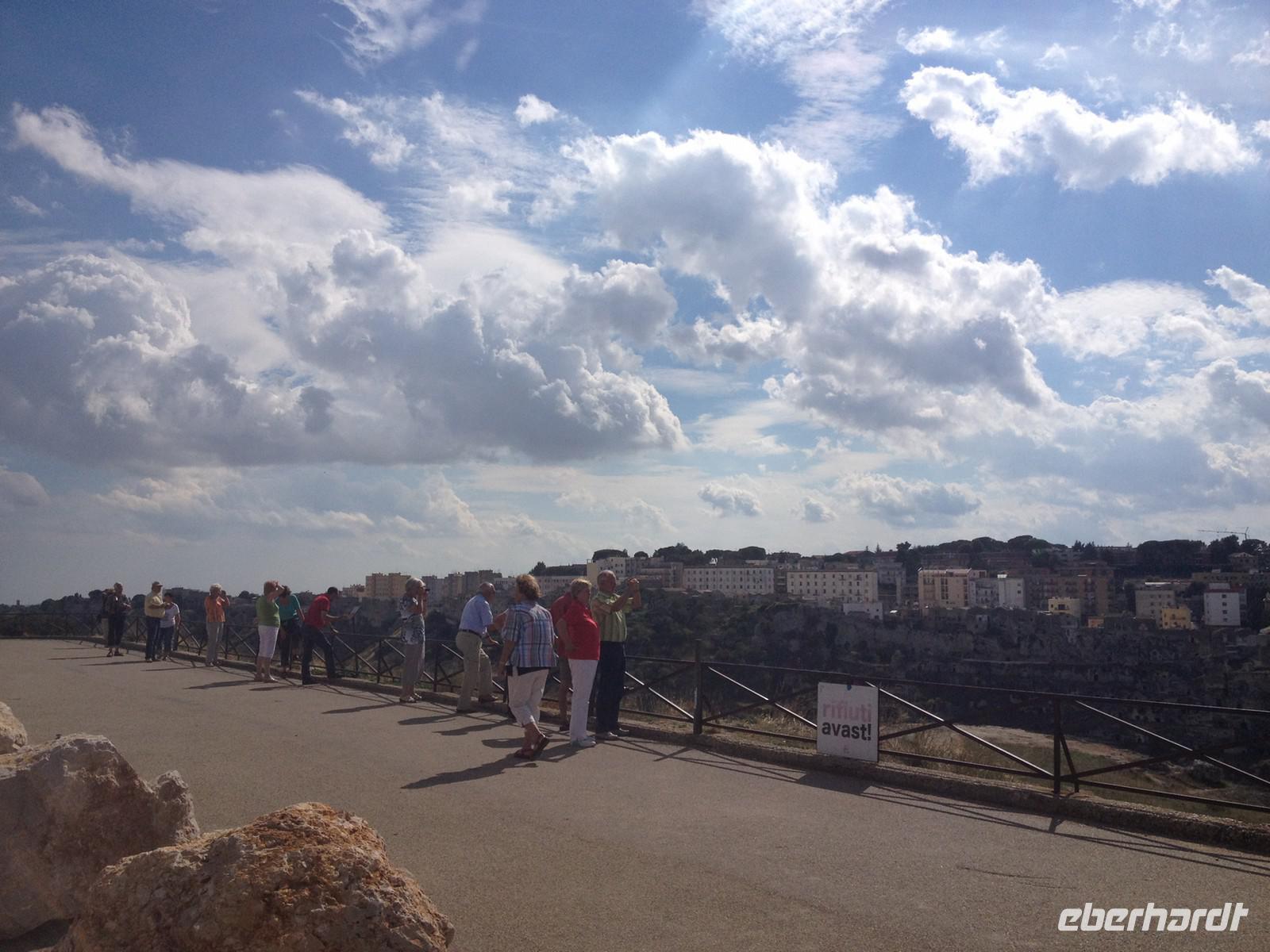 Unser heutiger Ausflug führte uns zunächst in die Stadt der Sassi - nach Matera. Wir verließen die Region Apulien und erreichten die Basilikata. Matera ist seit 2002 in Deutschland bekannt geworden, da diese Stadt Filmkulisse zum Mel Gibson Film „Die Passion Christi" war. Salvatore entließ uns aus dem Bus und wir marschierten frohen Mutes in die Stadt hinein. Dann ging es immer wieder Treppen hinauf und Treppen hinab. Dabei besahen wir die zahlreichen Höhlenbehausungen, die teils restauriert aber auch teils verlassen vorhanden sind. Wir schauten uns solch eine Höhlenwohnung an und auch eine Kirche in der Höhle. Unglaublich, wie man hier zu damaliger Zeit hauste. Nach drei Stunden Stadtspaziergang legten wir eine Mittagspause ein und anschließend gingen wir gemeinsam wieder zum Bus. Weiter fuhren wir mit Salvatore nach Altamura. Hier gibt es eine besondere Spezialität und Eberhardt TRAVEL hat wieder eine Überraschung für uns parat: wir besichtigen eine Bäckerei und dürfen zahlreiche Brotsorten kosten. Dazu gab es Wasser und Saft und auch kleine Mozzarella-Kügelchen. Lecker! Anschließend spazierten wir noch kurz in die Altstadt von Altamura, wo man gerade dabei, zahlreiche Lichterkränze und Dekorationen von den Häuserfassaden zu entfernen. Sicher wurde hier vor ein paar Tagen ein Patronenfest gefeiert. Kurz vor 17 Uhr brachte uns der Bus wieder zurück nach Selva di Fasano, wo wir 18:15 Uhr wieder ankamen und uns auf das letzte gemeinsame Abendessen vorbereiteten.