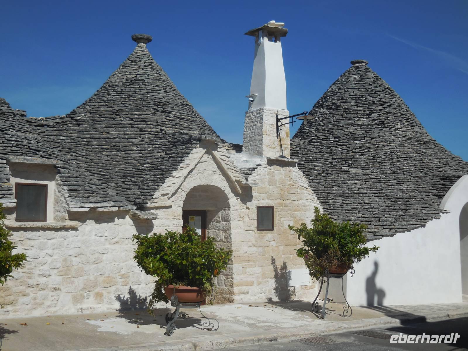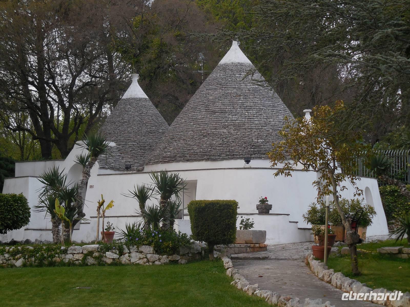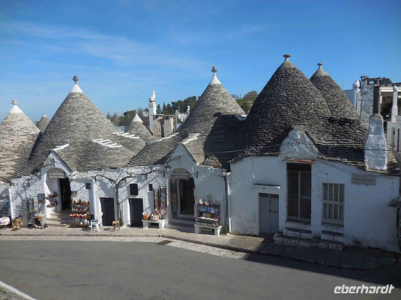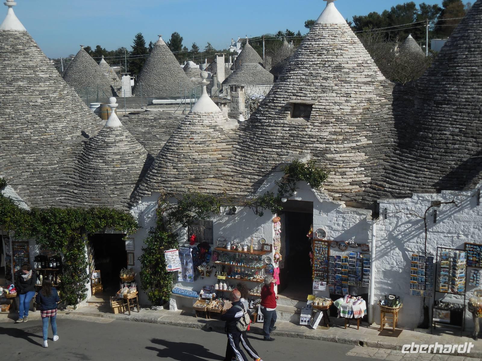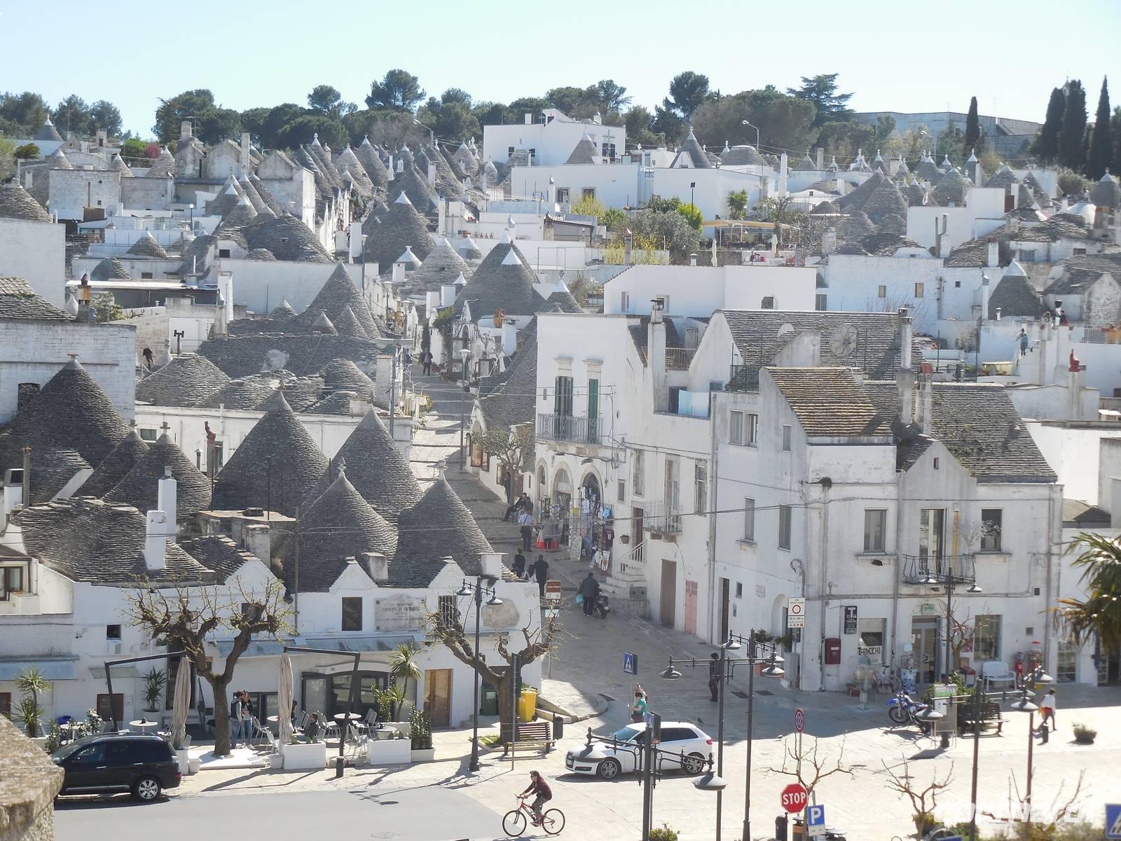 9:30 Uhr fahren wir ab entlang des Valle D'itria (wo es noch bis zu 10.000 Trullis geben soll) zu den Castellana-Grotten, die im Jahr 1938 entdeckt worden sind. Hier steigen wir etwa 100 Stufen hinab und befinden uns in einem riesigen Höhlenkomplex, dem wir nun 1,5 Kilometer pro Strecke folgen. Unendlich viele Stalagmiten und Stalagtiten beeindrucken uns mit ihren Formen und unterschiedlichen Größen. Gute zwei Stunden später erspähen wir wieder Tageslicht und vor allem froh, den knapp gewordenen Sauerstoff einzuatmen. Zurück im Bus fahren wir ins etwa 10 Kilometer entfernte Alberobello, wo wir zunächst unsere wohlverdiente Mittagspause einnehmen. Anschließend führt uns Mirella in die alte Stadt aus dem 14. Jahrhundert und danach in die neue Stadt aus dem 16. Jahrhundert. Bis hinauf zur Kirche laufen wir gemeinsam und genießen danach noch eine Stunde Freizeit im puren Sonnenschein und zwischen 1.400 Trullis. Nun kehren wir mit den ersten tollen Eindrücken zurück zum Hotel.