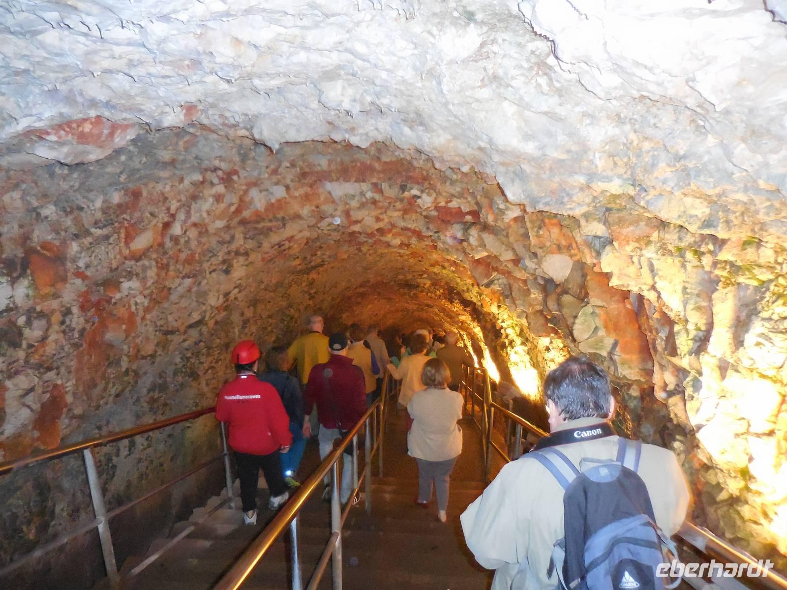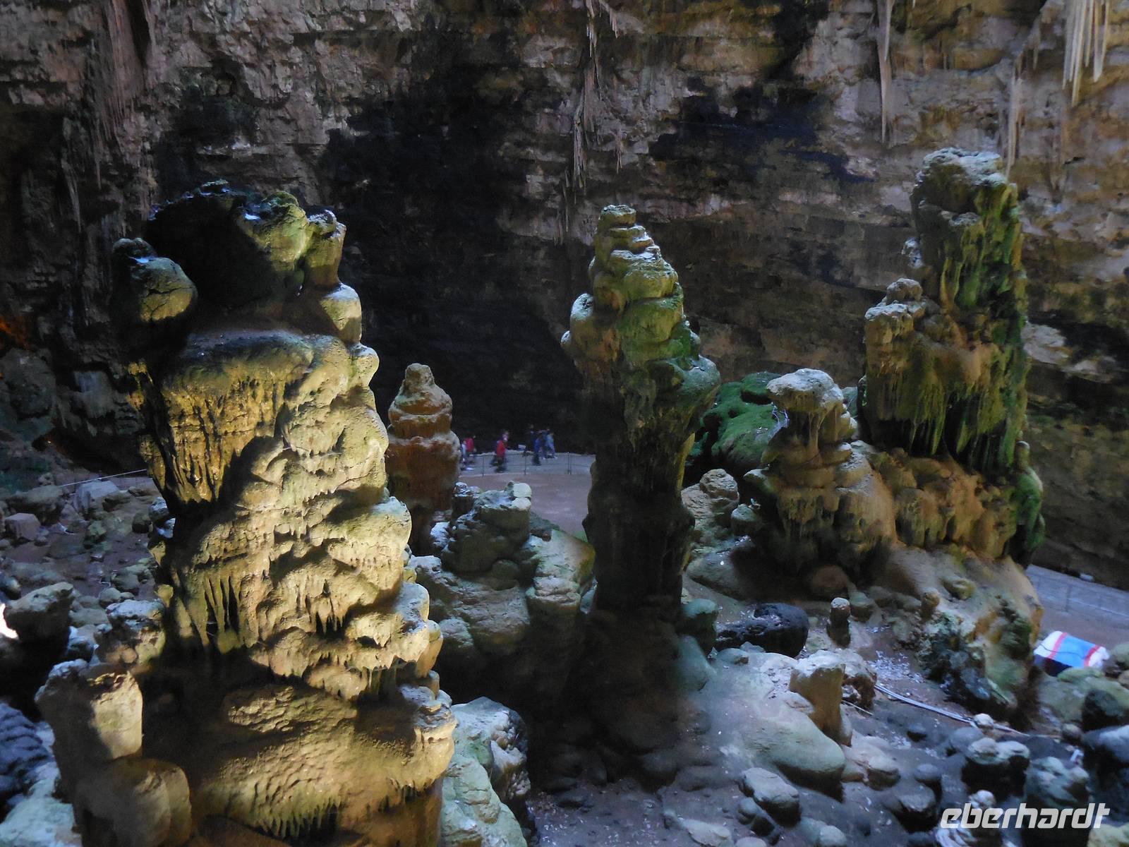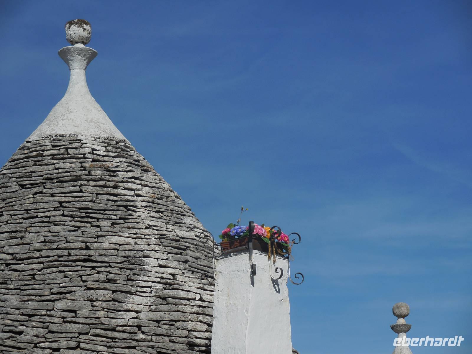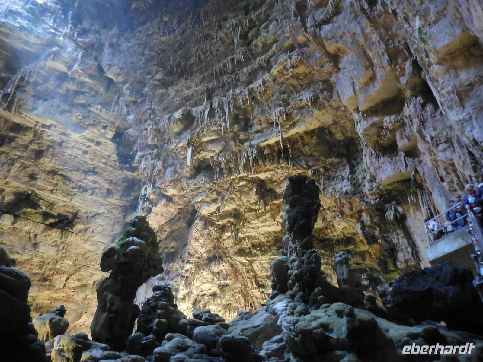 9:30 Uhr fahren wir ab entlang des Valle D'itria (wo es noch bis zu 10.000 Trullis geben soll) zu den Castellana-Grotten, die im Jahr 1938 entdeckt worden sind. Hier steigen wir etwa 100 Stufen hinab und befinden uns in einem riesigen Höhlenkomplex, dem wir nun 1,5 Kilometer pro Strecke folgen. Unendlich viele Stalagmiten und Stalagtiten beeindrucken uns mit ihren Formen und unterschiedlichen Größen. Gute zwei Stunden später erspähen wir wieder Tageslicht und vor allem froh, den knapp gewordenen Sauerstoff einzuatmen. Zurück im Bus fahren wir ins etwa 10 Kilometer entfernte Alberobello, wo wir zunächst unsere wohlverdiente Mittagspause einnehmen. Anschließend führt uns Mirella in die alte Stadt aus dem 14. Jahrhundert und danach in die neue Stadt aus dem 16. Jahrhundert. Bis hinauf zur Kirche laufen wir gemeinsam und genießen danach noch eine Stunde Freizeit im puren Sonnenschein und zwischen 1.400 Trullis. Nun kehren wir mit den ersten tollen Eindrücken zurück zum Hotel.