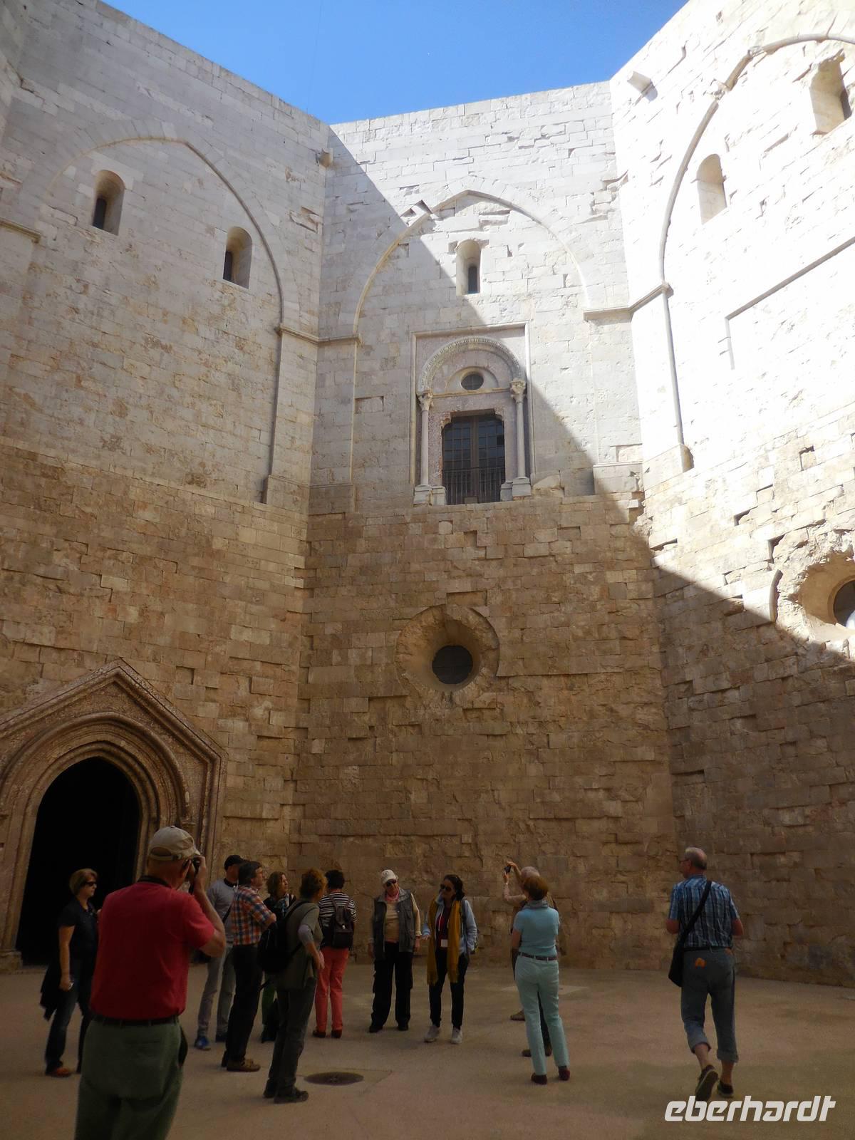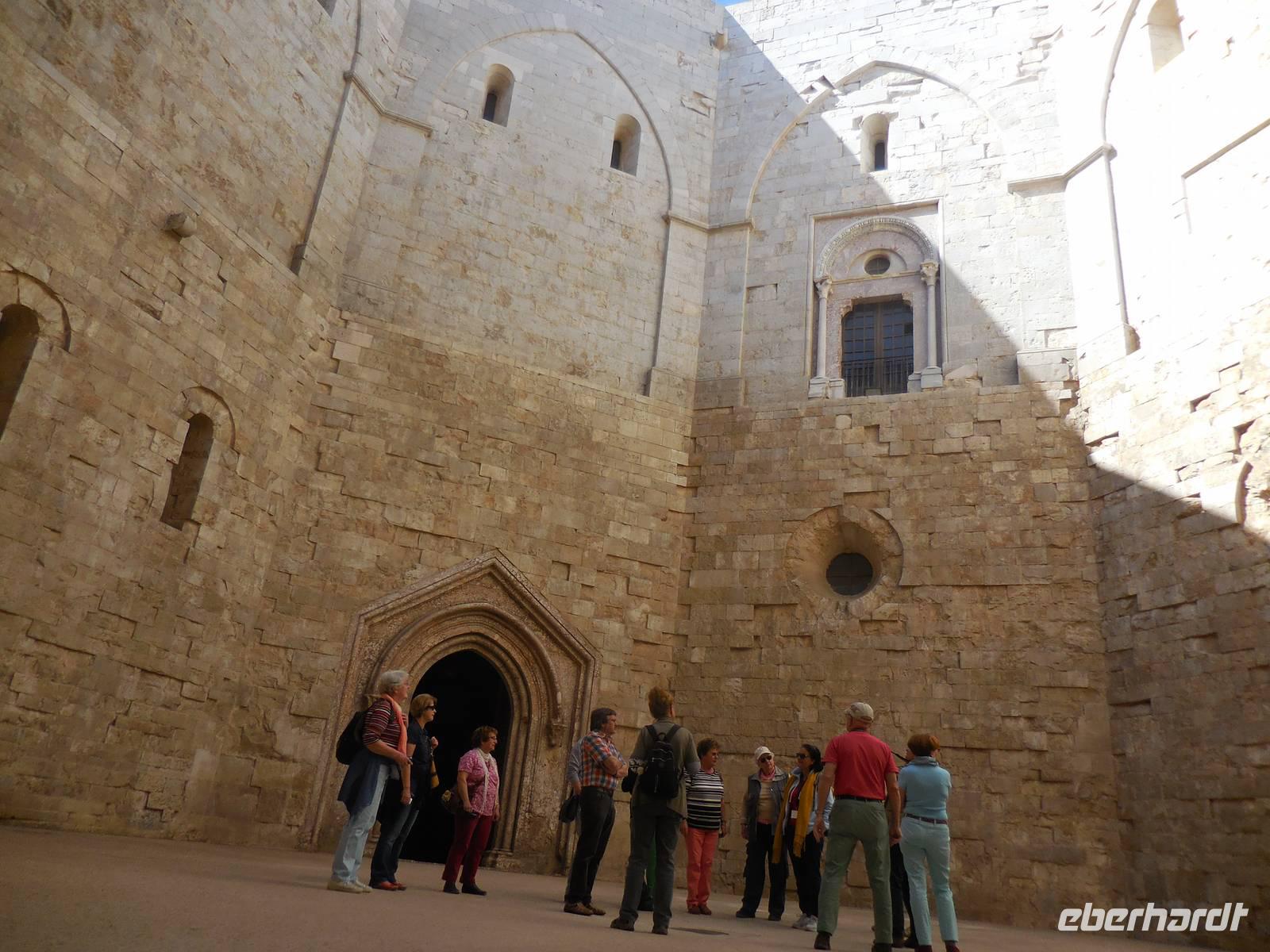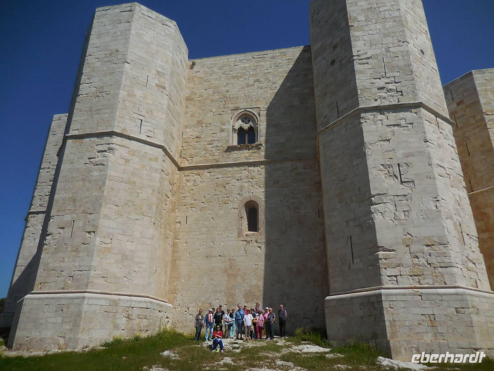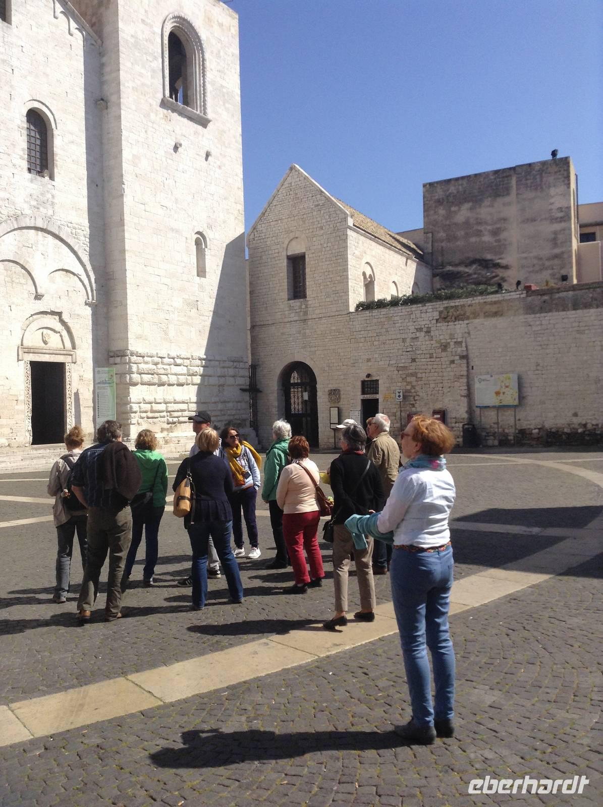 Die morgendliche Abfahrt führt uns zunächst zur Krone von Apulien - dem Stauferschloss Castel del Monte, etwa zwei Fahrtstunden vom Hotel entfernt. Mit dem Busshuttle fahren wir vom Parkplatz hinauf und Staunen nicht schlecht. Ein beeindruckendes Bauwerk aus Stein! Mirella führt uns durch die gesamte Anlage und wir machen immer wieder Fotos und sind begeistert. Wir Runden den Besuch mit einer Umrundung des Castells ab und unser schönes Gruppenfoto entsteht. Zu Fuß laufen wir hinunter wo unser Gianni schon auf uns wartet und uns nun nach Trani bringt. Das nette Hafenstädtchen ist unter anderem bekannt für seinen Marmor, einen guten Schaumwein, viel Industrie, der jüdischen Gemeinschaft (mit 5 Synagogen) sowie den Fischfang. Wir verpassen leider um 15 Minuten die Schließung der Kathedrale, sodass wir erst eine Mittagspause am Hafen einlegen, dann einen gemeinsamen Bummel durch den Park und die Altstadt machen und letztendlich um 15:30 Uhr wieder an der Kathedrale sind. Nach dem akademischen Viertel öffnet man uns das Tor und wir bestaunen das Bauwerk von innen. Dann kommen wir zum Bus und staunen nicht schlecht: wir werden nicht wie gewohnt von Gianni erwartet. Er war verschwunden und wir suchen ihn - im Café, auf der Toilette - nirgends ist er zu finden. Etwa 10 Minuten später kommt er um die Ecke gerannt :). Nun fahren wir gemütlich zurück zum Hotel und vertagen den Besuch von Bari auf den letzten Tag. Aber einen kleinen Spaziergang unternehmen noch einige vor dem Abendessen zur Aussicht über Fasano.