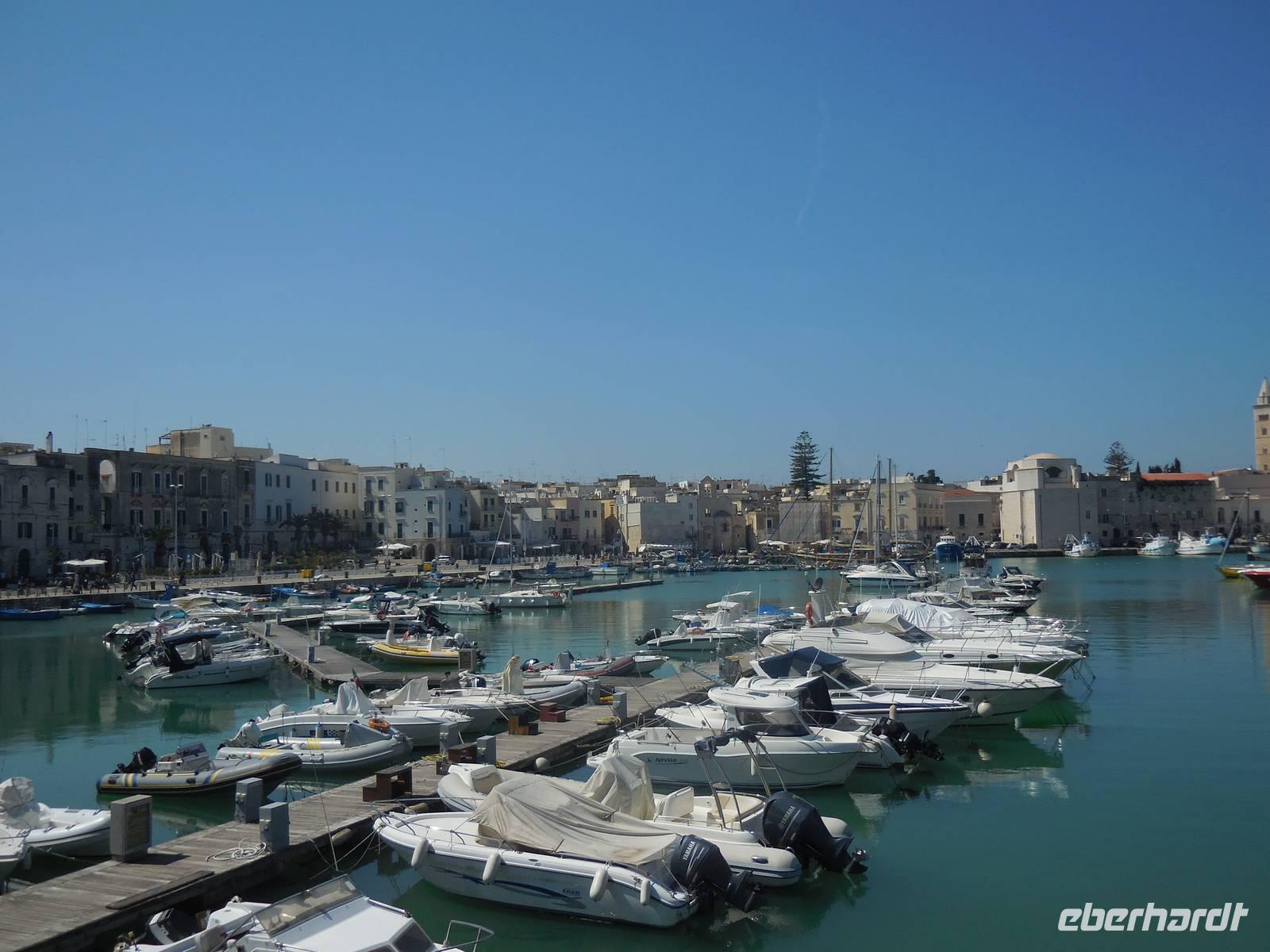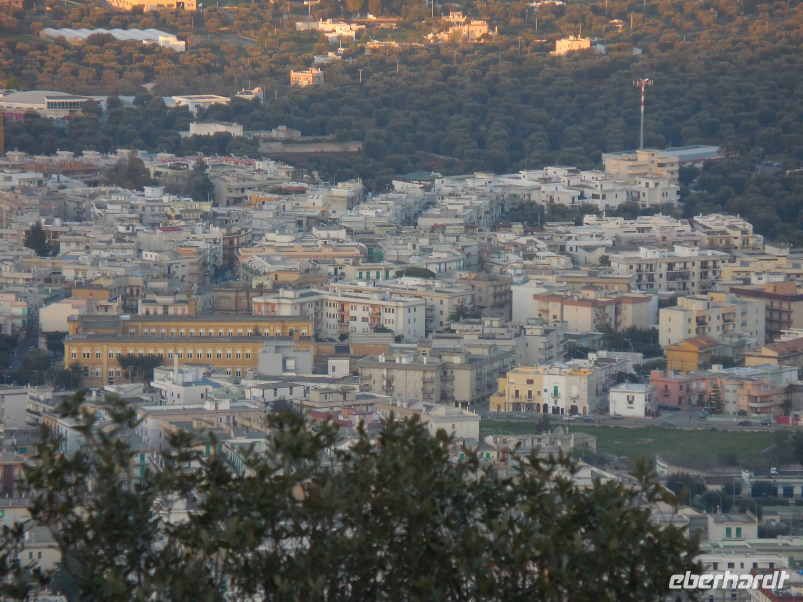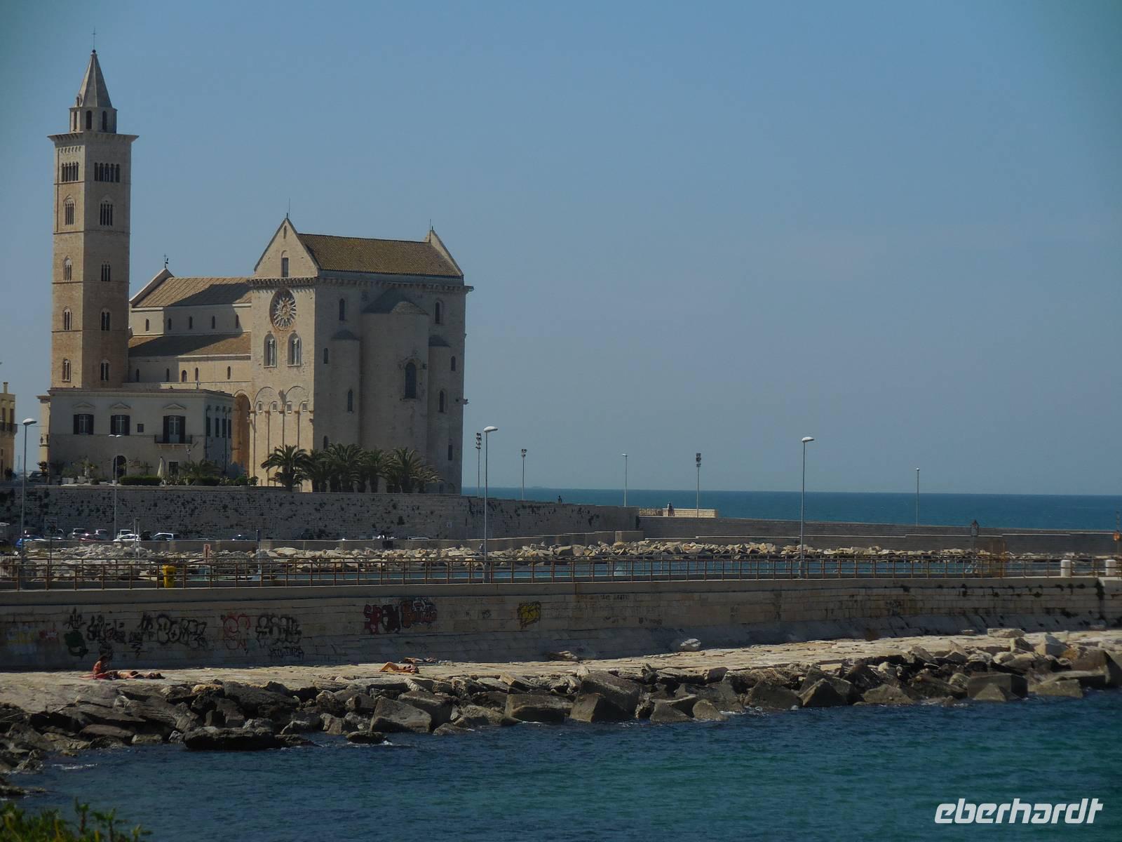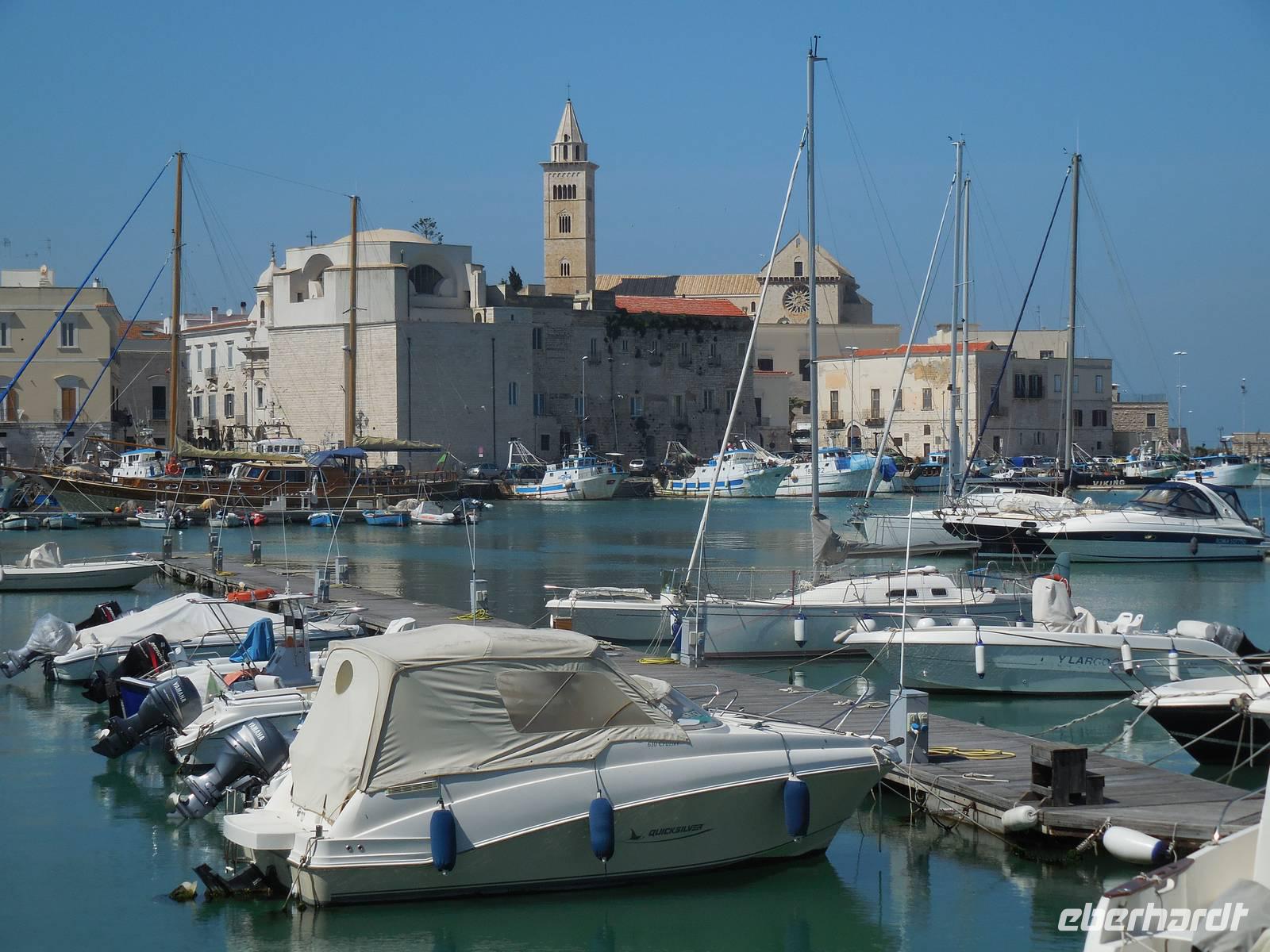 Die morgendliche Abfahrt führt uns zunächst zur Krone von Apulien - dem Stauferschloss Castel del Monte, etwa zwei Fahrtstunden vom Hotel entfernt. Mit dem Busshuttle fahren wir vom Parkplatz hinauf und Staunen nicht schlecht. Ein beeindruckendes Bauwerk aus Stein! Mirella führt uns durch die gesamte Anlage und wir machen immer wieder Fotos und sind begeistert. Wir Runden den Besuch mit einer Umrundung des Castells ab und unser schönes Gruppenfoto entsteht. Zu Fuß laufen wir hinunter wo unser Gianni schon auf uns wartet und uns nun nach Trani bringt. Das nette Hafenstädtchen ist unter anderem bekannt für seinen Marmor, einen guten Schaumwein, viel Industrie, der jüdischen Gemeinschaft (mit 5 Synagogen) sowie den Fischfang. Wir verpassen leider um 15 Minuten die Schließung der Kathedrale, sodass wir erst eine Mittagspause am Hafen einlegen, dann einen gemeinsamen Bummel durch den Park und die Altstadt machen und letztendlich um 15:30 Uhr wieder an der Kathedrale sind. Nach dem akademischen Viertel öffnet man uns das Tor und wir bestaunen das Bauwerk von innen. Dann kommen wir zum Bus und staunen nicht schlecht: wir werden nicht wie gewohnt von Gianni erwartet. Er war verschwunden und wir suchen ihn - im Café, auf der Toilette - nirgends ist er zu finden. Etwa 10 Minuten später kommt er um die Ecke gerannt :). Nun fahren wir gemütlich zurück zum Hotel und vertagen den Besuch von Bari auf den letzten Tag. Aber einen kleinen Spaziergang unternehmen noch einige vor dem Abendessen zur Aussicht über Fasano.