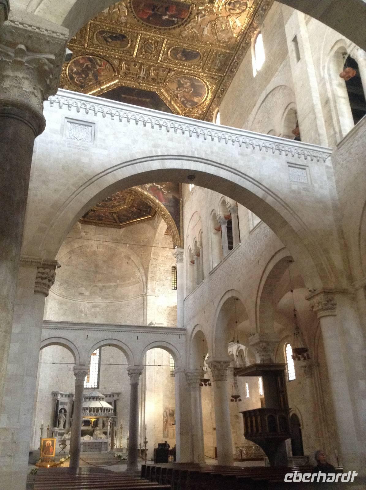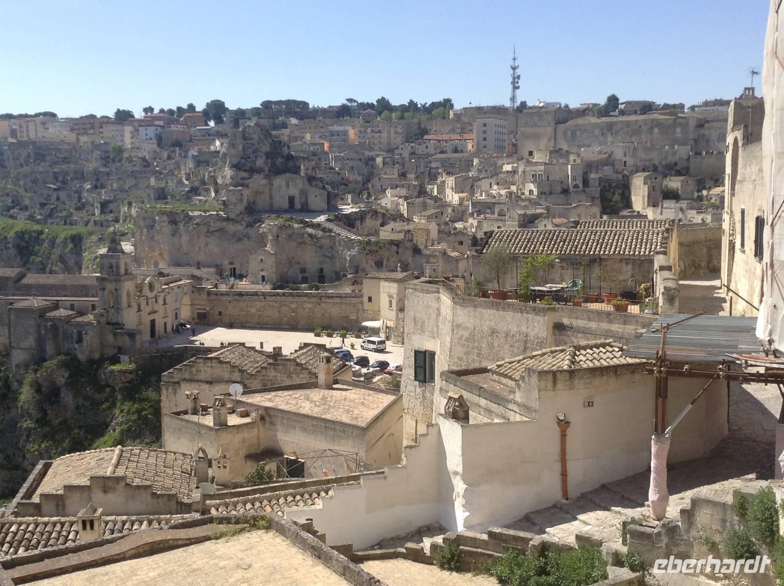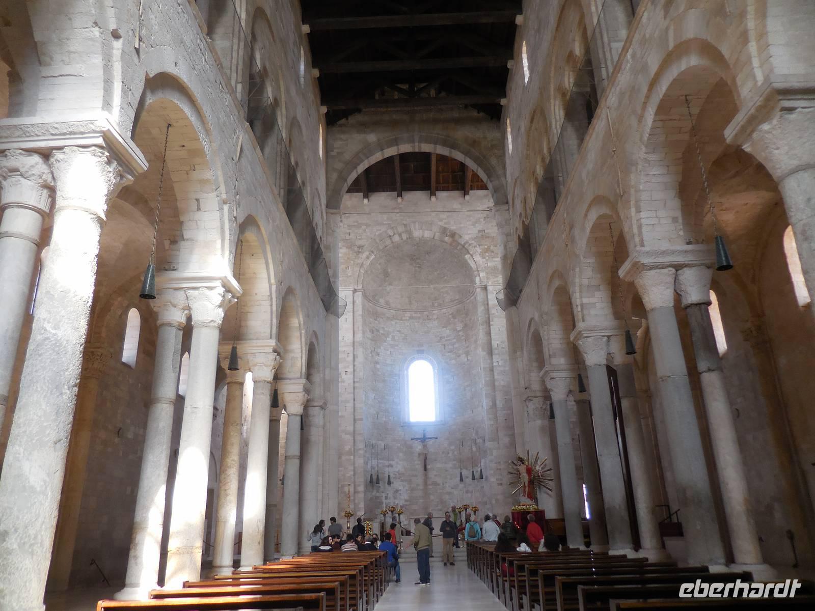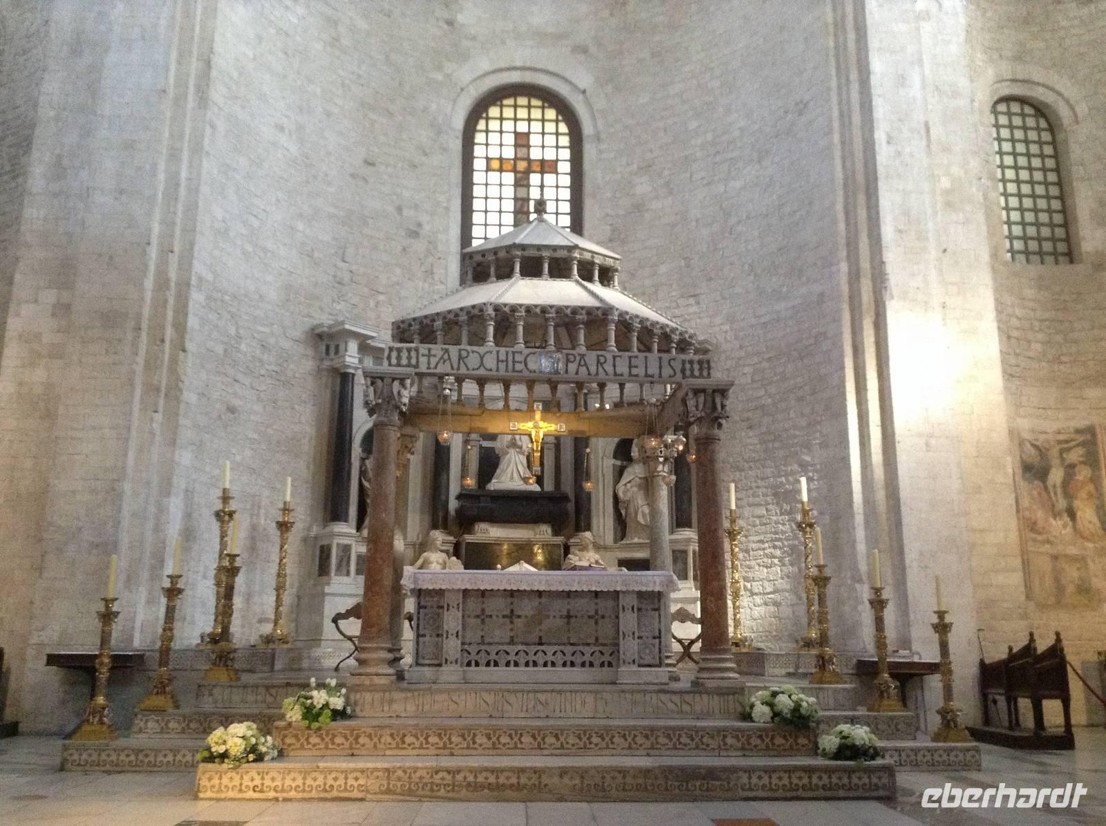Wir verlassen das Hotel um 8 Uhr morgens und machen uns auf in die Nachbarregion von Apulien - die Basilikata. Hier wohnen in der gesamten Region so viele Menschen wie allein in Bari. Etwa zwei Stunden Fahrt haben wir vor uns, ehe wir Matera erreichen. Die Provinzhauptstadt der Region ist Potenza und Mirella erzählt uns vieles zur Region. Unterwegs fahren wir auch durch Putignano. Dieses Städtchen ist bekannt für den ältesten Karneval von Italien, für die Brautmode und für eine weitere Grotte, die wohl mit der Grotte von Castellana verbunden ist, aber in 100 Meter Tiefe liegt. Wir erreichen zunächst einen Aussichtspunkt, von dem aus wir einen Überblick über das gesamte Stadtpanorama haben und sehr gut das Gefälle von arm nach reich erkennen. Wieder im Bus bringt uns Gianni ins Stadtzentrum, wo wir aussteigen und mit Mirella den Stadtrundgang beginnen. Auf den ersten Blick erkennen wir gar nicht, dass der alte Teil der Stadt aus Höhlen besteht. Wir steigen hinab auf etlichen Stufen und kommen zum Hauptplatz mit der Kirche. Ein Stückchen weiter kommen wir zu einer verlassenen Höhlenwohnung, die erst 1965 von seinen Bewohnern verlassen worden ist als die Zwangsumsiedelung war. Wir besichtigen die Wohnung und man erklärt uns per Tonband was wo zu sehen ist. Wir können uns alle nicht vorstellen, so gelebt zu haben, ohne Strom und fließend Wasser. Auch unsere heutige Mittagspause verbringen wir in Matera und einige der Gruppe fuhren mit dem Lift auf die Aussichtsterrasse mit Blick über die Stadt. Nachmittags fahren wir weiter nach Bari und wir sind gespannt was uns diese Stadt zu bieten hat. Die Kirche des Heiligen Nicolaus ist unsere erste Station und Mirella erzählt uns die Geschichte ausführlich, die so gar nichts mit dem deutschen Brauch am 6.12. zu tun hat. Dann bummeln wir durch die Gassen der Altstadt, schauen auf der Nudelgasse vorbei und in die Küchen hinein, wo wir die alten Damen sehen, wie sie die Nudeln formen. Zum Schluss unserer Runde schauen wir noch in der Kathedrale vorbei und genießen nun noch eine Stunde Freizeit. Dann verabschieden wir uns mit einem weinenden Auge von unserer Mirella und fahren zurück zum Hotel. In voller Erwartung auf das letzte Abendessen unserer gemeinsamen Reise.