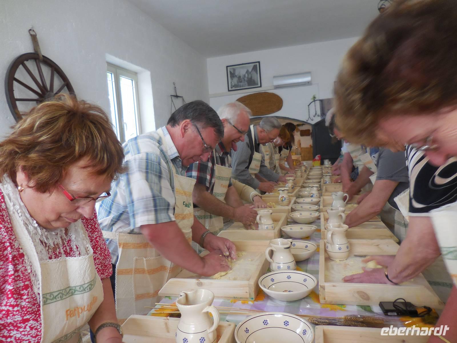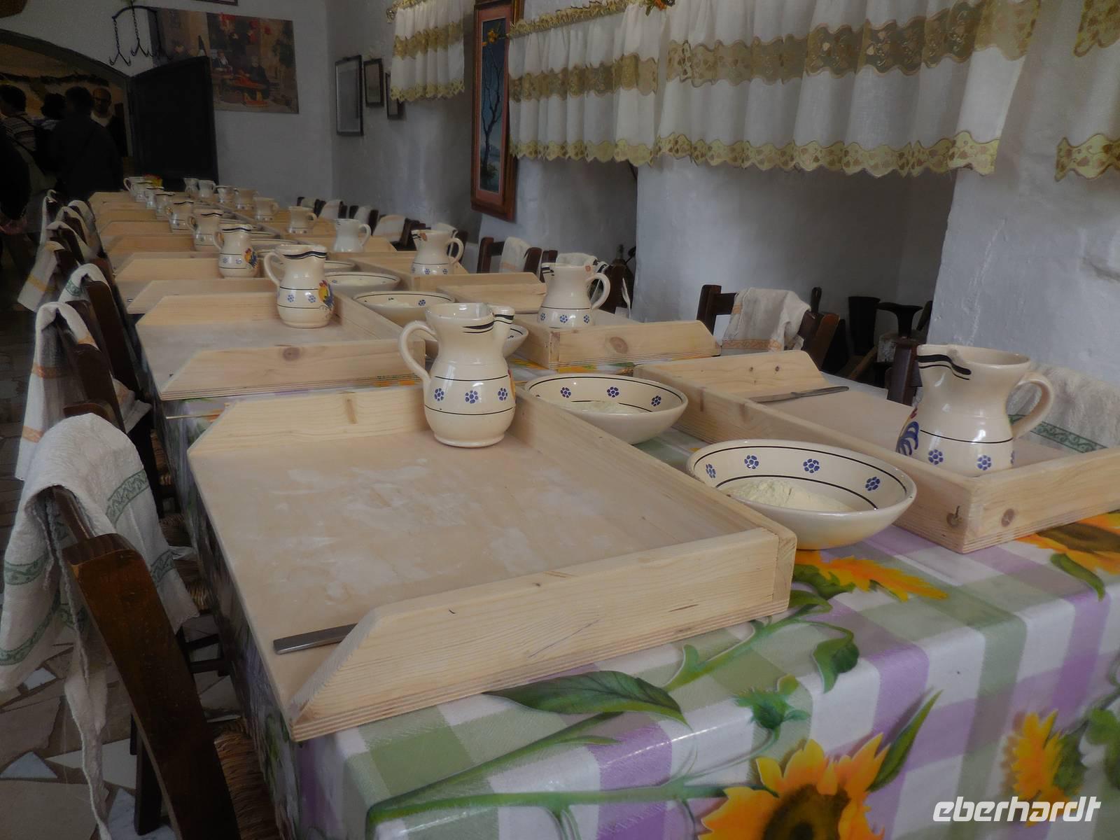 Heute heißt es wieder ausschlafen, denn wir starten gemütlich um 9:30 Uhr vom Hotel nach Pezze di Greco. Hier erreichen wir den Gutshof, wo man uns bereits mit Kochschürzen erwartet. Wir schauen uns aber erst einmal in dem Kirchlein und dem Garten um, ehe wir uns der anstehenden Arbeit widmen. Dann binden sich alle die Schürze um und es kann losgehen. Wir bekommen gezeigt wie man die Öhrchennudeln macht und probieren diese nun selbst zu formen. Ist gar nicht so einfach, aber wir haben alle Spaß bei der Arbeit. Anschließend zeigt man uns das Füllen der Roulade und der Klößchen mit altem Brot und Käse. Dina zeigt uns nun die Herstellung von Mozzarella mit ganz verschiedenen Formen. Und alle Formen haben ihre eigenen Namen. Auch verschiedene Olivenölsorten probieren wir, ehe wir uns zu Tisch begeben. Alle möglichen Sorten von Gemüse bekommen wir der Reihe nach serviert. So köstlich und viel haben wir lange nicht gegessen und sind auch mehr als satt, als wir das köstliche Obst zum Schluss verspeist haben. Nur der Limoncello und Mandellikör geht dennoch rein :-). Weiter fahren wir gegen 14 Uhr in das Städtchen Locorotondo. Bei der Anfahrt stoppen wir kurz für ein Foto und Unternehmen nun einen gemütlichen Spaziergang zur Kathedrale und zum Café am Hauptplatz. Nach der kleinen Pause gehen wir in den Park und dann zurück zum Bus, der uns zum Hotel zurück fährt. Auch heute machen wir wieder einen abendlichen Spaziergang, bevor wir zum Abendessen gehen.