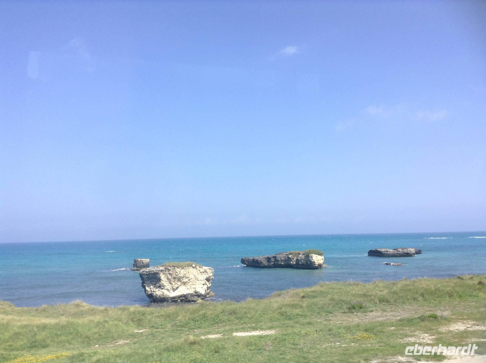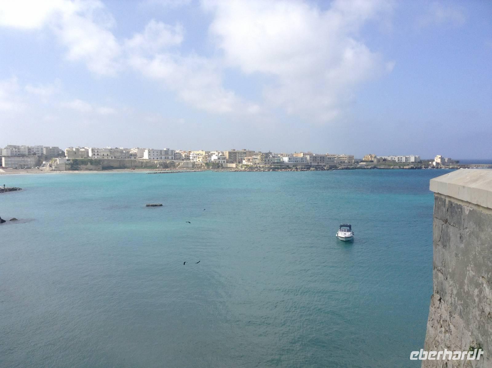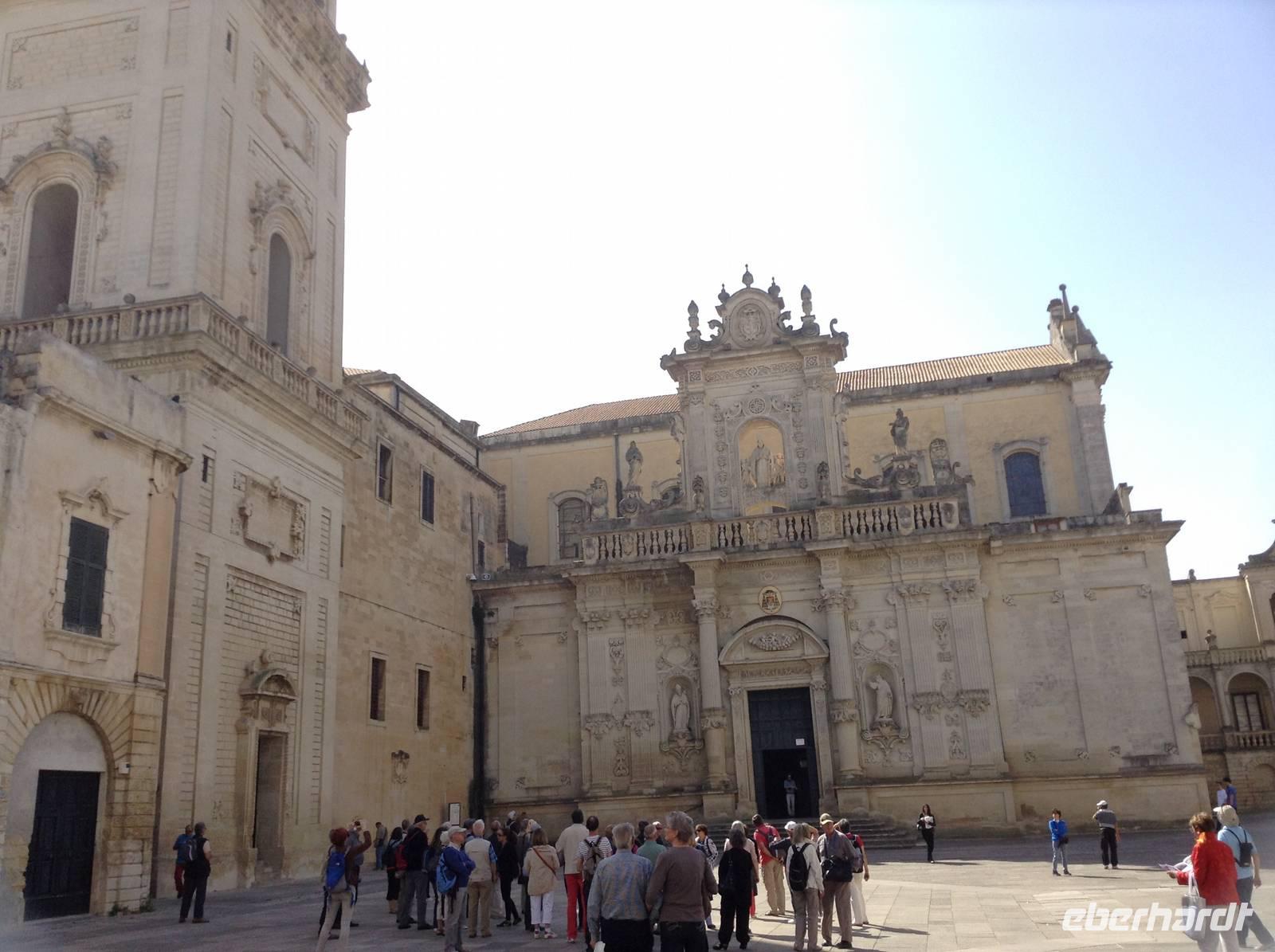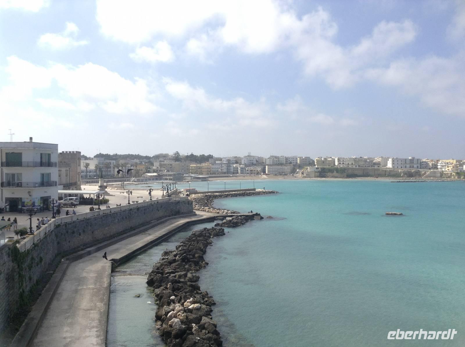 8:15 Uhr fahren wir vom Hotel ab nach Lecce, der Barockstadt Süditaliens schlechthin. Knappe zwei Stunden Fahrt dauert die Strecke und Gianni lässt uns am großen Torbogen aussteigen. Wir laufen gemütlich die engen Gassen hinein in die Altstadt und stehen plötzlich vor der Kathedrale an der umschlossenen Piazza. Nach der Innenbesichtigung laufen wir weiter und sind erfreut, dass es auch zum Samstag viele Schulklassen anzutreffen gibt :-). Nach unserer Erkundungstour zu Fuß haben wir eine gute Stunde Freizeit, die jeder mit einem Café oder einem Einkaufsbummel verbringt. Gianni empfängt uns wieder am Bus und wir fahren weiter nach San Cataldo, einer früheren römischen Hafenstadt. Am Lago Alimini und gegenüber das azurblaue Meer machen wir Stopp und es gibt ein tolles Picknick als Überraschung. Dann fahren wir weiter nach Otranto, wo wir Griechenland bis auf 60 Kilometer Luftlinie nahe kommen. In der Stadt unternehmen wir mit Mirella einen Rundgang und sehen zum Beispiel die Kathedrale, die zu früherer Zeit ein Tempel der Göttin Minerva gewesen ist. Wir haben einen unglaublich tollen Blick auf den Hafen und der Adria. Nach unserem Spaziergang durch Otranto haben wir etwas Freizeit zum shoppen, Eis essen und genießen. Um 17 Uhr fahren wir zurück nach Selva di Fasano und können das Abendessen kaum erwarten.