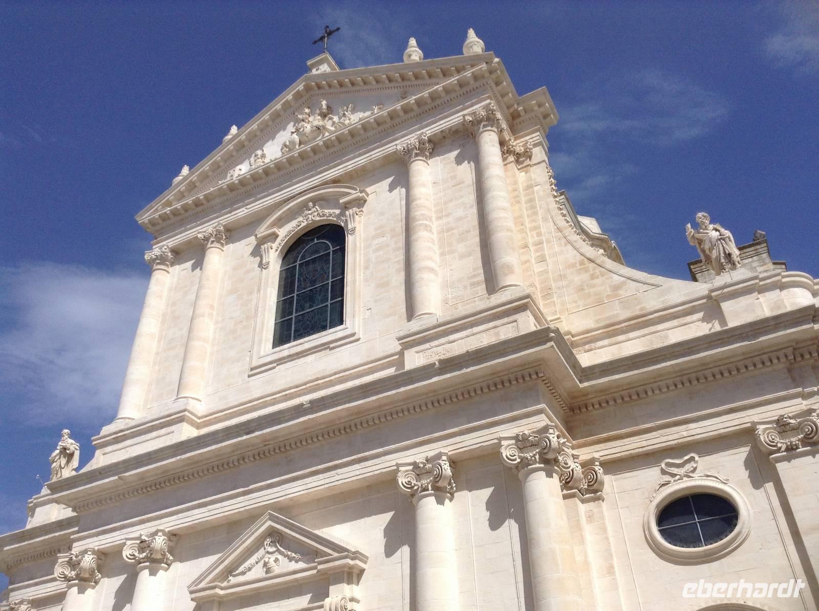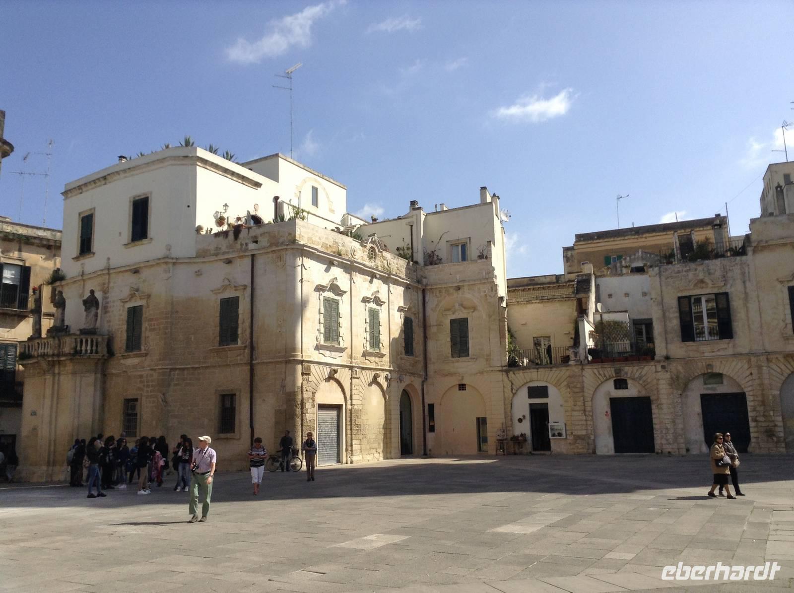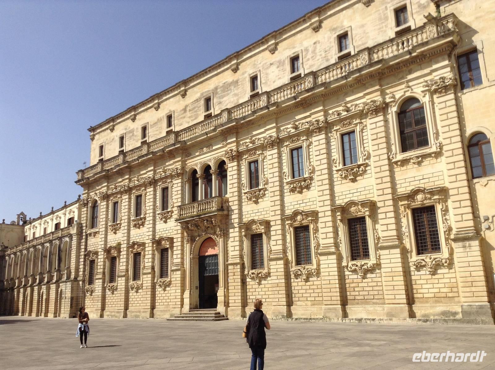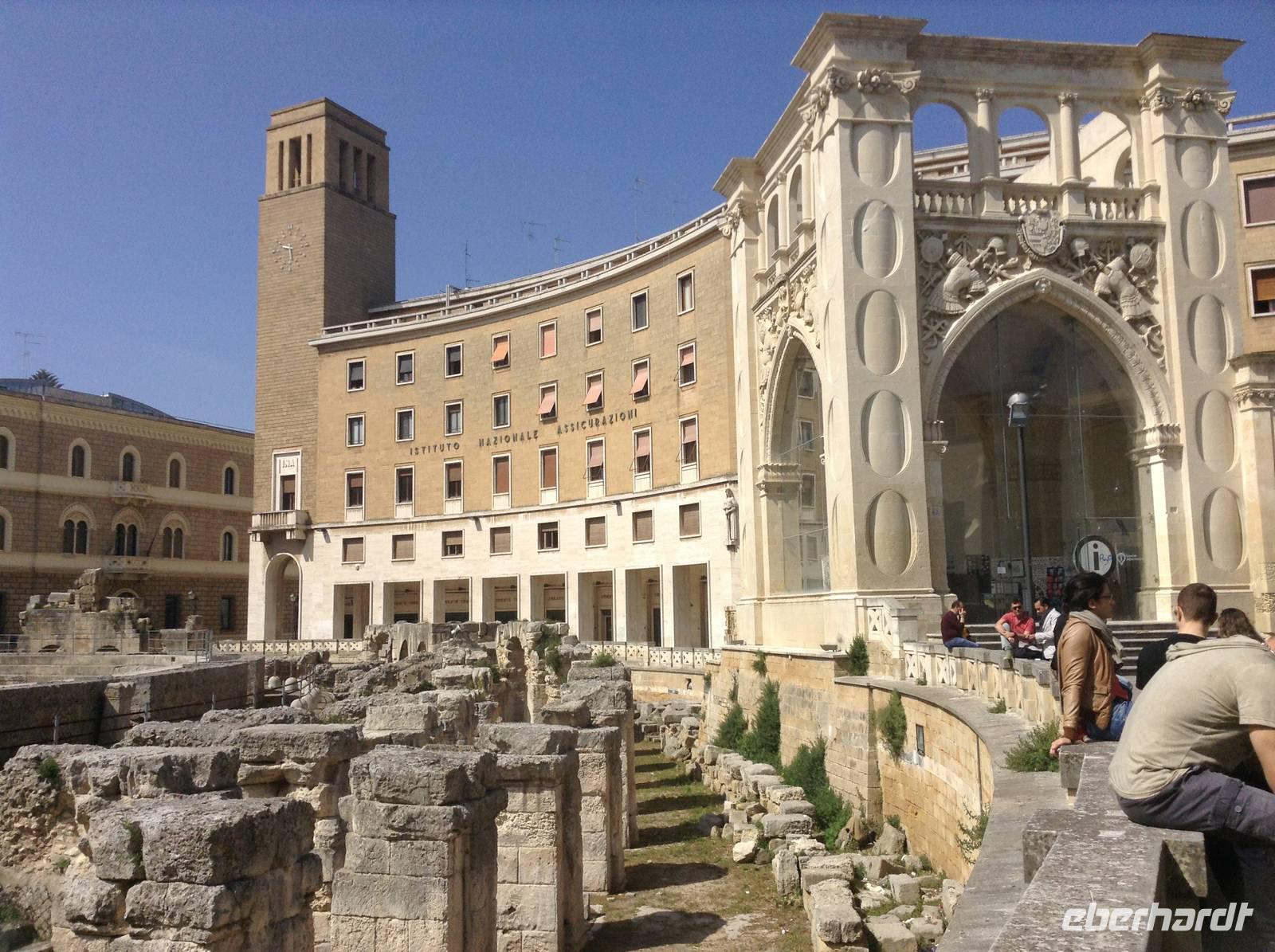 8:15 Uhr fahren wir vom Hotel ab nach Lecce, der Barockstadt Süditaliens schlechthin. Knappe zwei Stunden Fahrt dauert die Strecke und Gianni lässt uns am großen Torbogen aussteigen. Wir laufen gemütlich die engen Gassen hinein in die Altstadt und stehen plötzlich vor der Kathedrale an der umschlossenen Piazza. Nach der Innenbesichtigung laufen wir weiter und sind erfreut, dass es auch zum Samstag viele Schulklassen anzutreffen gibt :-). Nach unserer Erkundungstour zu Fuß haben wir eine gute Stunde Freizeit, die jeder mit einem Café oder einem Einkaufsbummel verbringt. Gianni empfängt uns wieder am Bus und wir fahren weiter nach San Cataldo, einer früheren römischen Hafenstadt. Am Lago Alimini und gegenüber das azurblaue Meer machen wir Stopp und es gibt ein tolles Picknick als Überraschung. Dann fahren wir weiter nach Otranto, wo wir Griechenland bis auf 60 Kilometer Luftlinie nahe kommen. In der Stadt unternehmen wir mit Mirella einen Rundgang und sehen zum Beispiel die Kathedrale, die zu früherer Zeit ein Tempel der Göttin Minerva gewesen ist. Wir haben einen unglaublich tollen Blick auf den Hafen und der Adria. Nach unserem Spaziergang durch Otranto haben wir etwas Freizeit zum shoppen, Eis essen und genießen. Um 17 Uhr fahren wir zurück nach Selva di Fasano und können das Abendessen kaum erwarten.