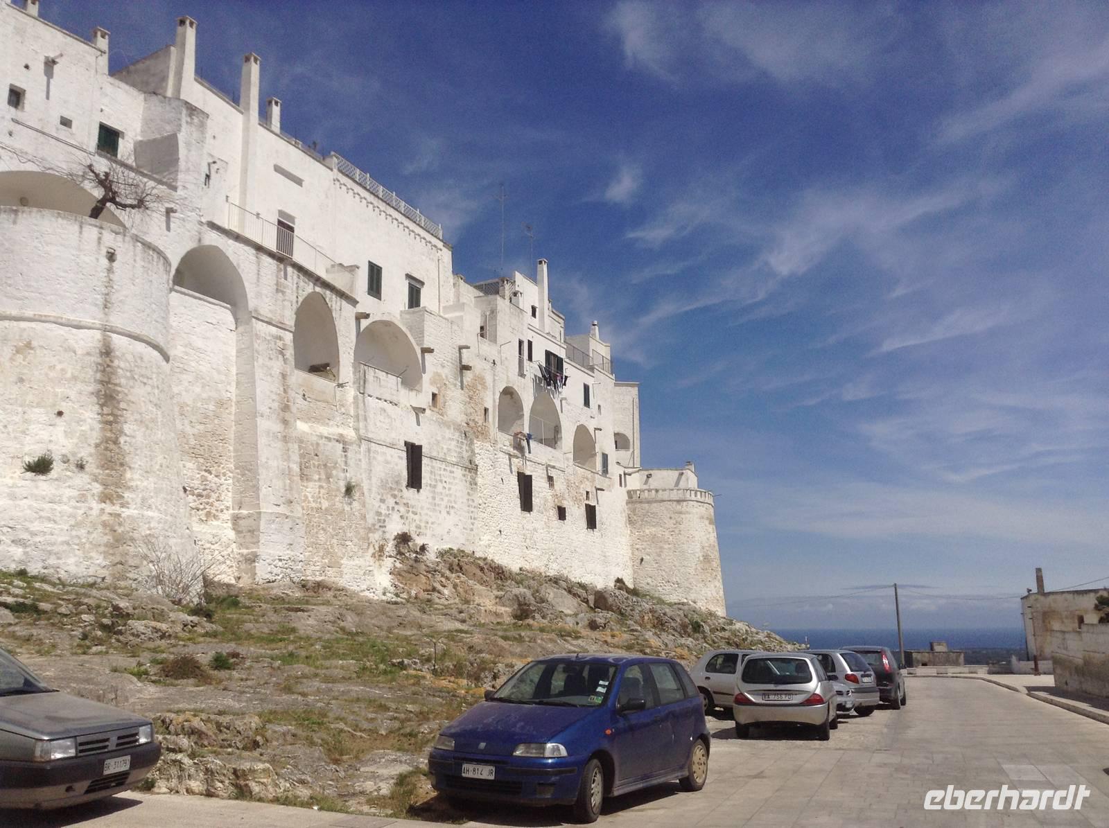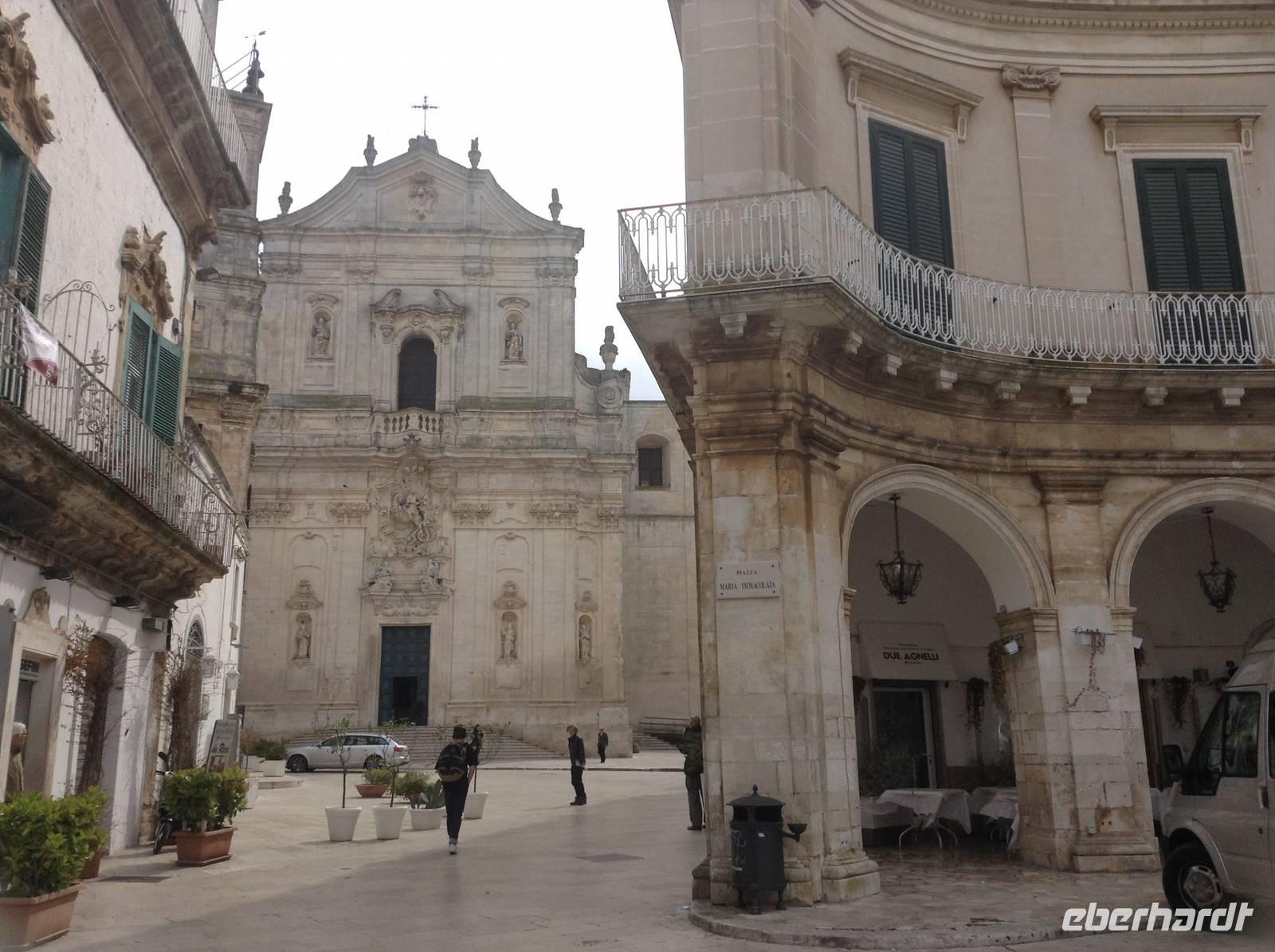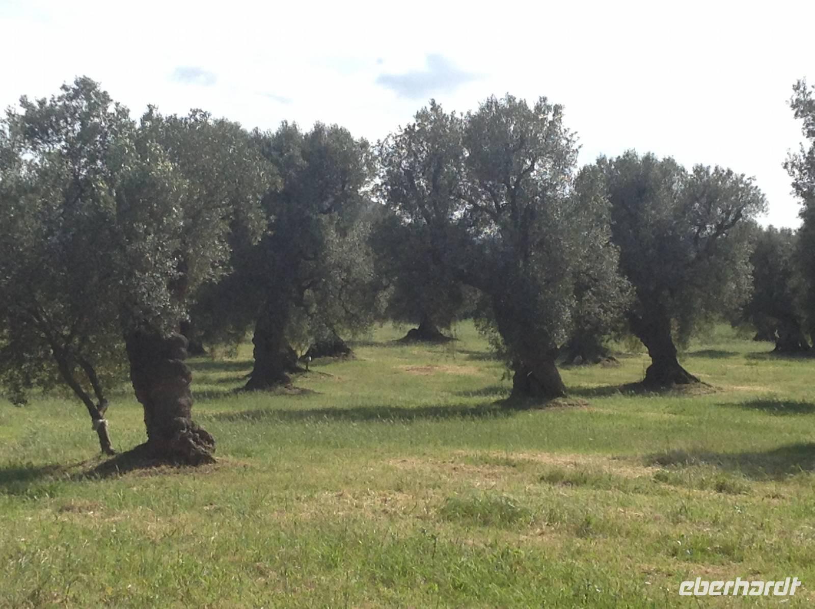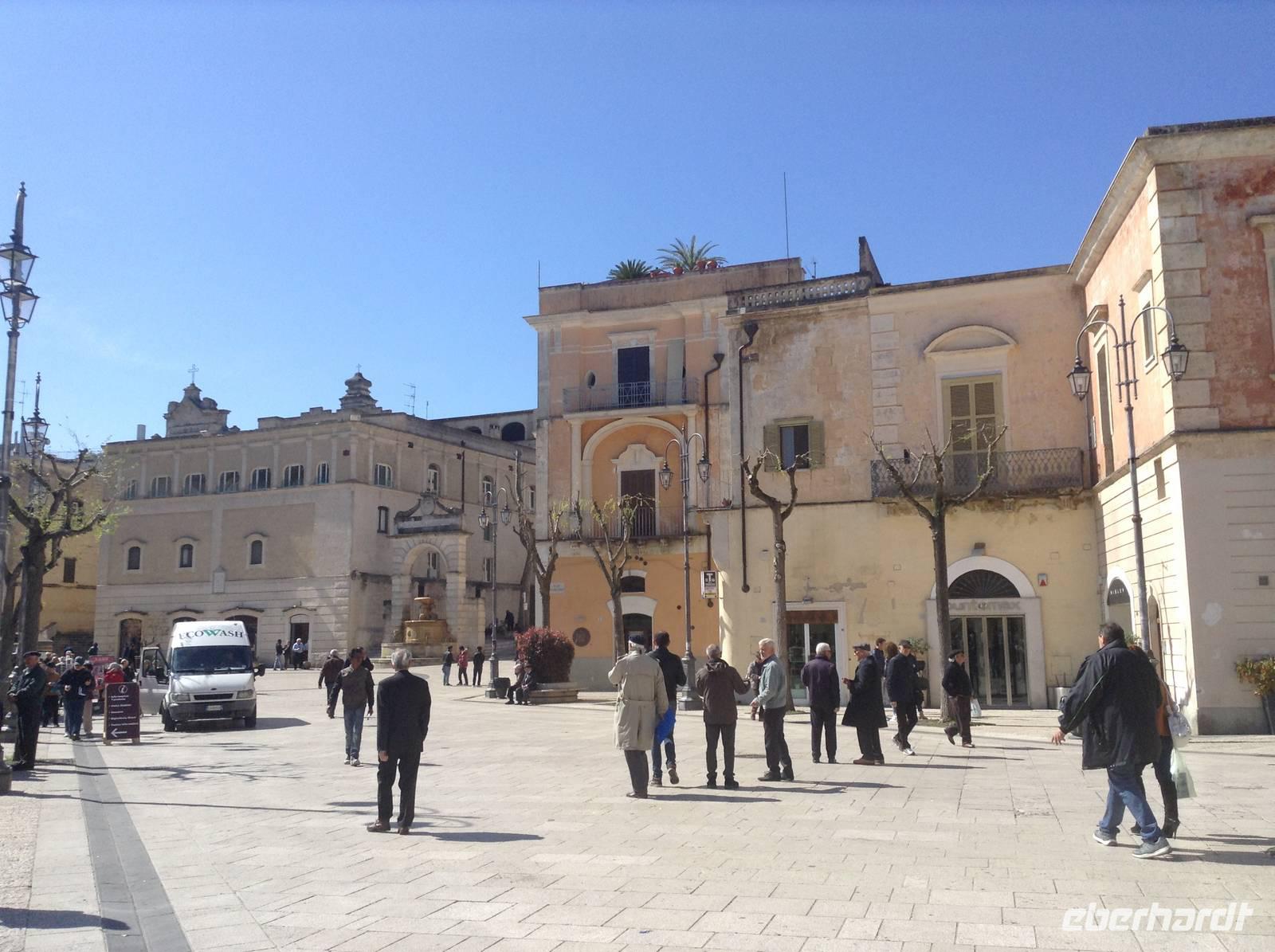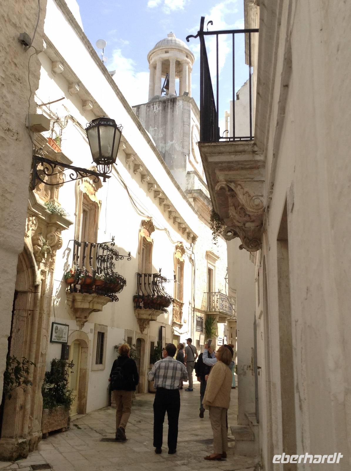 Pünktlich um 9 Uhr starten wir mit 88% unserer Gruppe nach Martina Franca. Dieses Städtchen ist unter anderem für seine Eselzucht bekannt und wir steigen bei heute nur etwa 13 Grad am Morgen zum Spaziergang aus. Mirella führt uns durch die kleinen Gassen zur Kathedrale, wo heut zum Sonntag Gottesdienst gehalten wird. Kurz vor elf sind wir wieder am Bus und fahren weiter nach Ostuni, der weißen Stadt. Die Sonne kommt langsam durch, aber es windet heut sehr, so dass wir die Jacken brauchen. Es geht immer bergauf, bis wir unser Ziel erreicht haben und einen tollen Blick über die Adria erhaschen. Wieder hinunter spaziert erreichen wir eine gute Stunde später wieder den Bus, der uns zur Masseria Refrigerio chauffiert. Wir werden bereits erwartet und essen wieder fantastisch zu Mittag. Nach einem abschließenden Café kehren wir zum Bus zurück und fahren zum Olivenbauern ganz in der Nähe. Wir erhalten Einblicke in die uralten Techniken und grausamen Bedingungen der Olivenernte und vor allem Verarbeitung zu damaliger Zeit. Dann setzen wir uns im Schuppen der Familie in eine Runde und verkosten verschiedene Sorten des Öles, welches wir dann auch kaufen. Glücklich, satt und zufrieden kehren wir am Abend zurück zum Hotel.