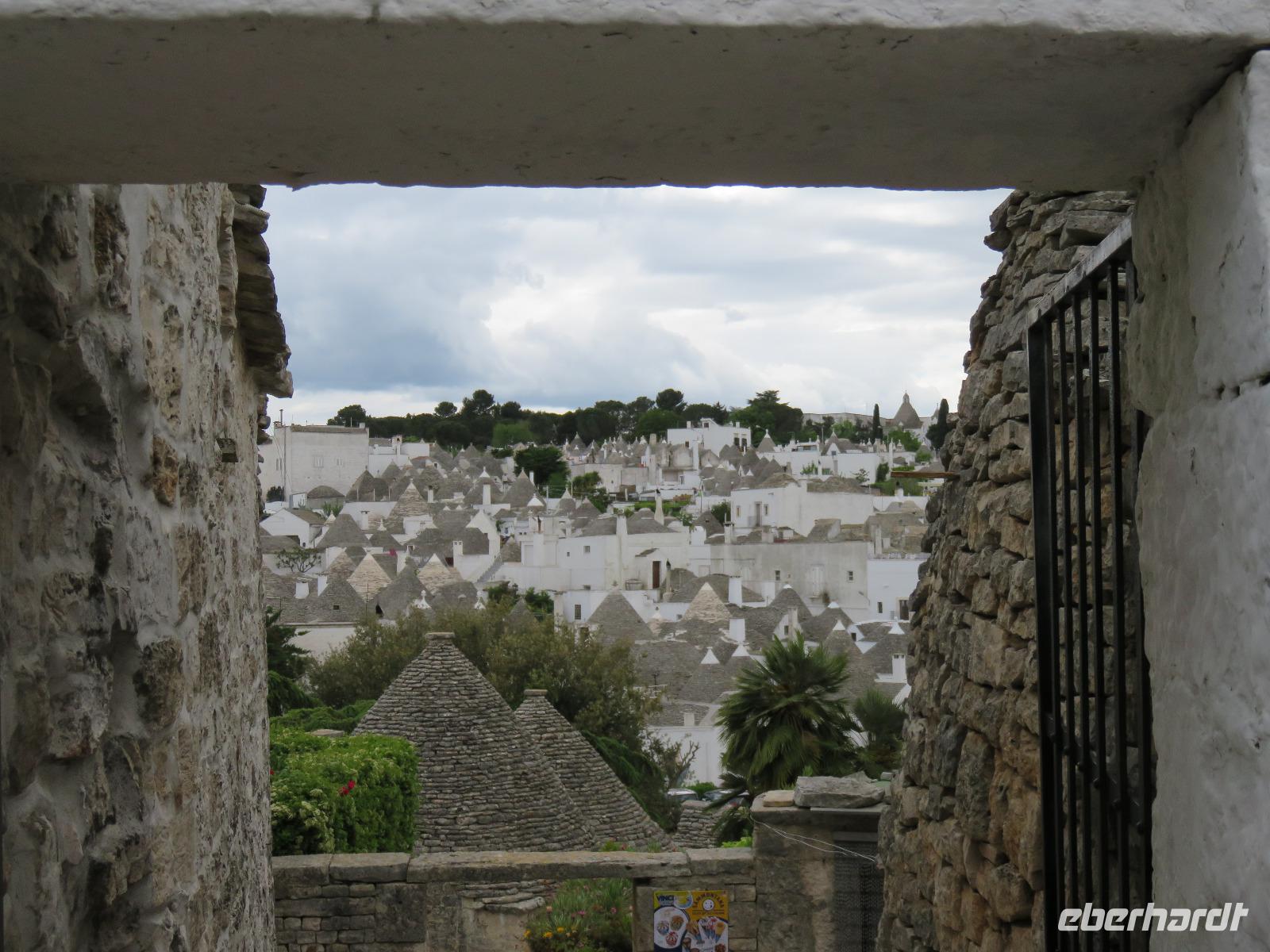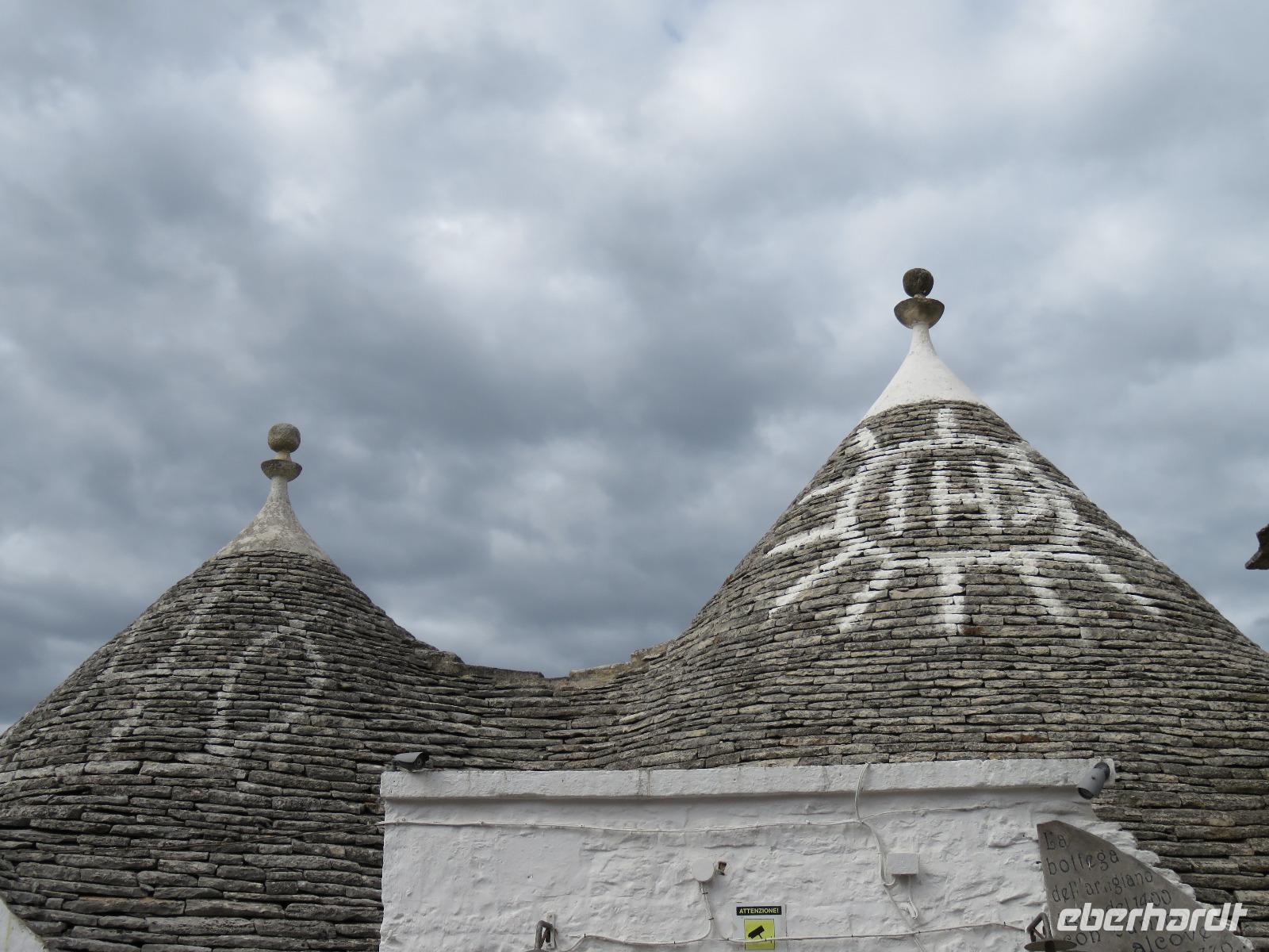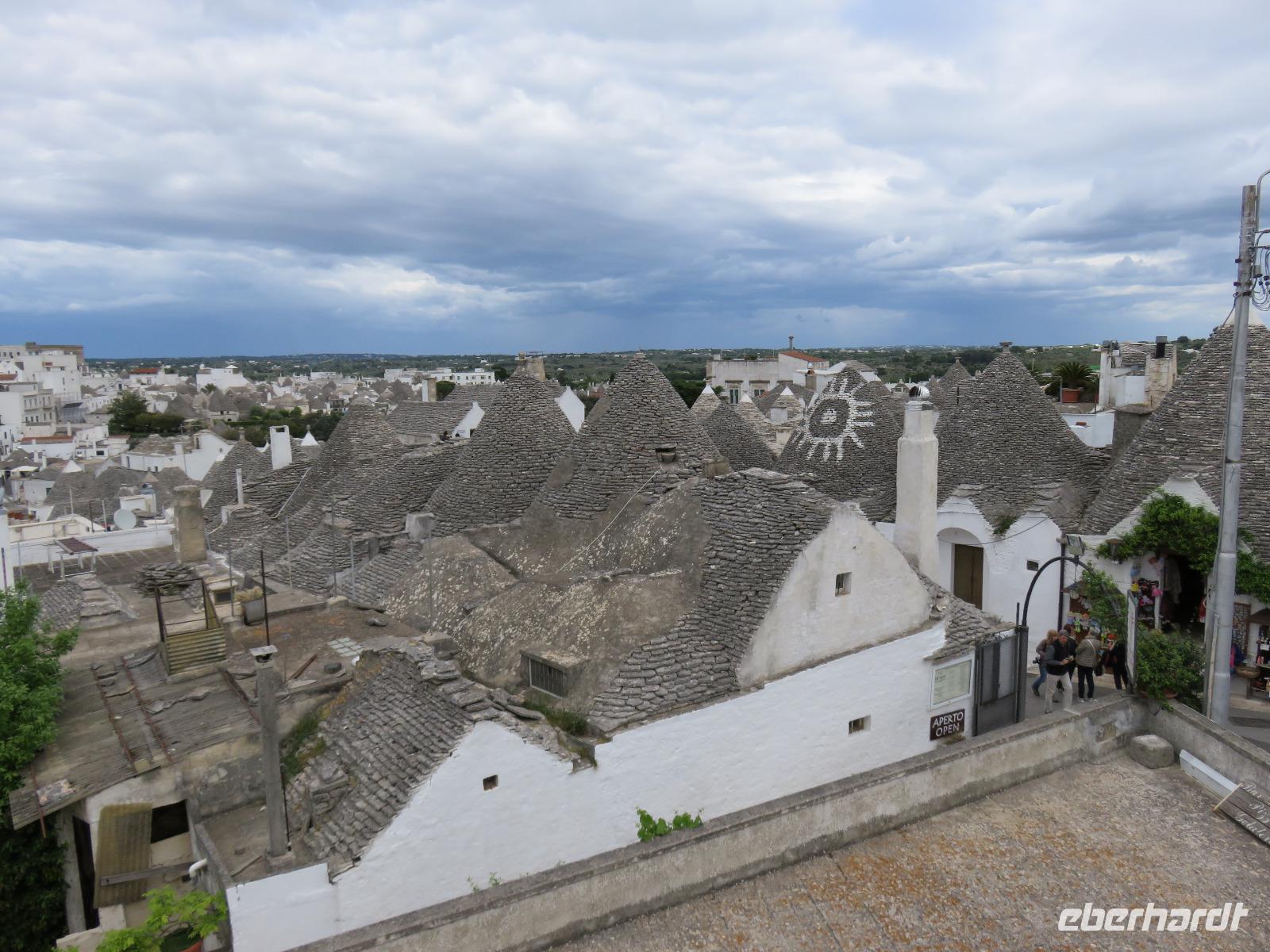 Zu Gast im Tal der Trullis wurde es nun Zeit, in die heimliche Hauptstadt der Region, Alberobello, zu reisen. Nach einem kurzen Spaziergang legten wir aber zunächst am Hauptplatz, der Piazza del Popolo, unsere Mittagspause ein. Gut gestärkt und etwas erholt spazierten wir mit Mirella zum ältesten Teil der Stadt mit 400 Trullis. Natürlich erhielten wir umfangreiche Erläuterungen zur Bauweise. Von der Aussichtsplattform an der Bar „Belvedere" eröffnete sich der Blick hinüber zur „Neustadt" mit 1.000 Trullis. Nun besichtigten wir einen Trullo von innen: Küche, Wohnzimmer, Schlafgemach, Dusche/WC - einfach und gemütlich. Für einen Urlaub durchaus denkbar, aber für uns vom Komfort verwöhnte Menschen des 20./21. Jahrhunderts auf Dauer nichts. Wir dankten für den Blick in das Innere mit einem kleinen freiwilligen Obolus. Obwohl in der Grundform gleich, bieten diese einfachen Häuser in Trockenbauweise eine ganze Reihe von unterschiedlichen Elementen, je nach der Nutzung, ob als Wohnhaus oder Stallung, die Formen der Pinnacolo als Kugel, Scheibe, Kegel oder Kreuz oder die Bemalung der Dächer mit kalkfarbigen magischen Zeichen. Wir liefen durch die geschäftige „Neustadt" hinauf zur Chiesa S. Antonio, einer Kirche mit Trullo-Dach. Von einer Aussichtsterrasse breitete sich vor uns das Panorama von Alberobello in der nachmittäglichen Sonne aus. Links und rechts luden kleine Souvenirgeschäfte zum Stöbern ein. Bei den Köchinnen unter uns erregten die Nudelhölzer mit Metallkanten größte Aufmerksamkeit. So müsste es doch schnell gelingen Nudeln in unterschiedlichen Breiten auszurollen und zu schneiden, in einem Arbeitsgang! Langsam bummelten wir zum Parkplatz. Gianni stand bereit und wir reisten zum Hotel zurück. Ein angenehmer Tag ging mit dem Abendessen zu Ende. Das Wetter hatte ausgehalten, nur es war etwas windiger geworden. Ganz gut, so hatte er uns die dicken Regen- und Gewitterwolken vertrieben. Hoffentlich auch für den nächsten Tag!