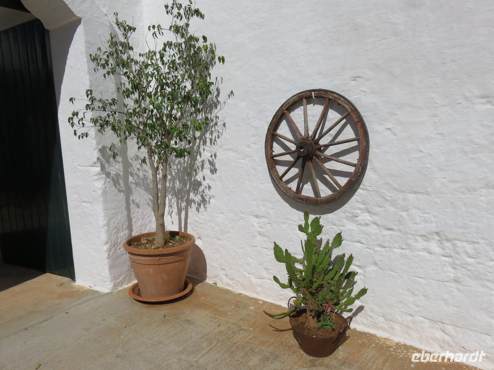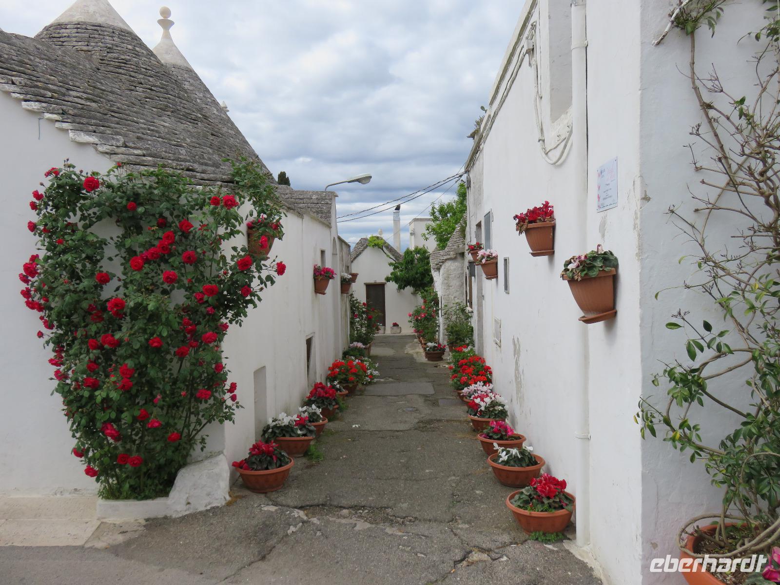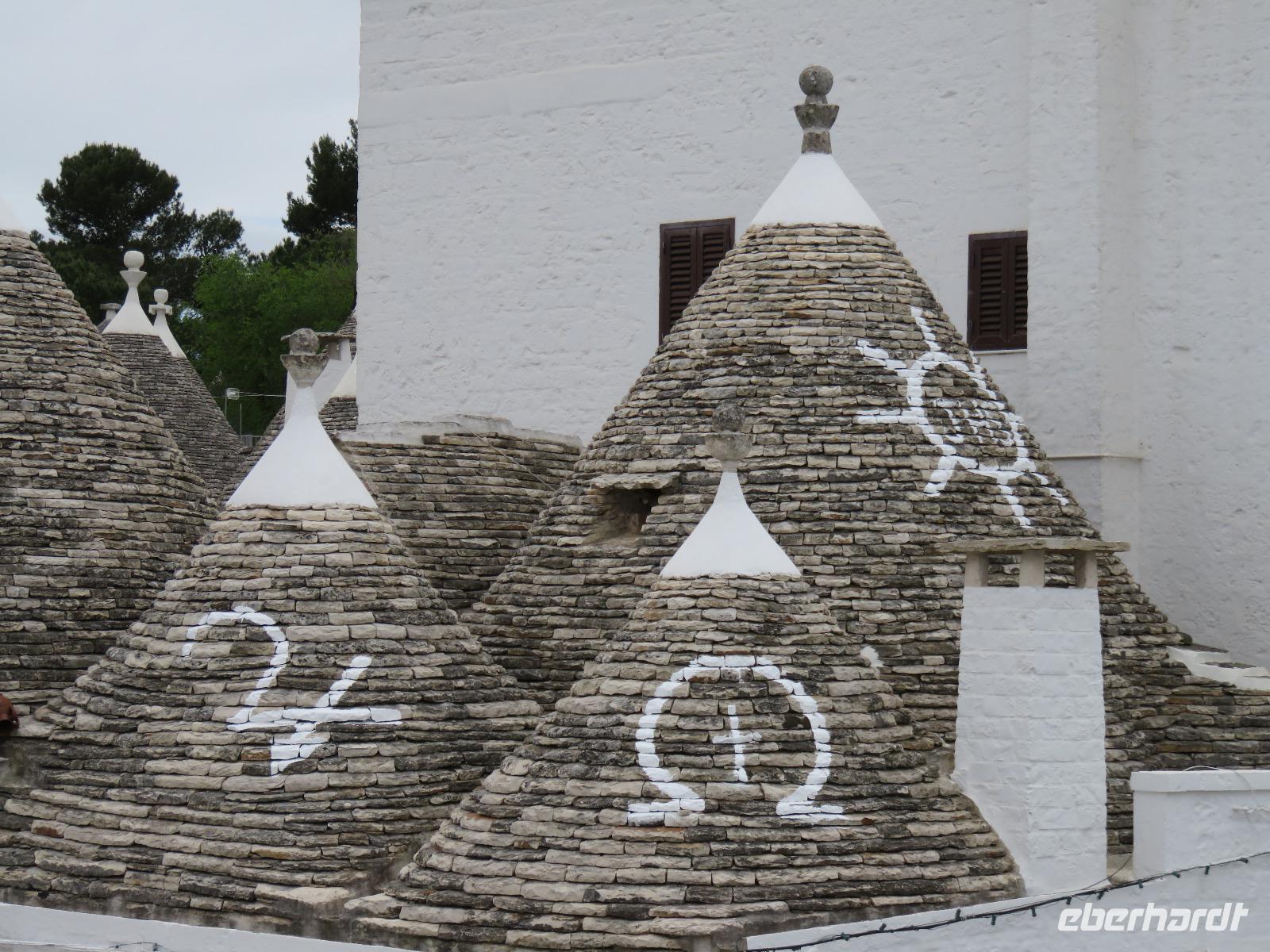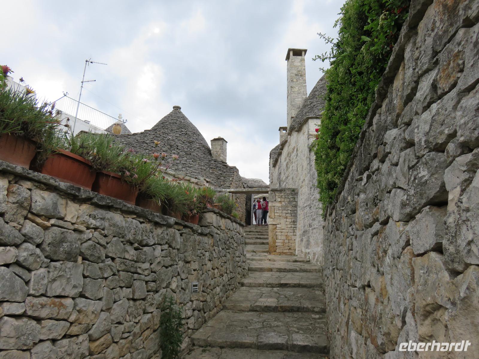 Zu Gast im Tal der Trullis wurde es nun Zeit, in die heimliche Hauptstadt der Region, Alberobello, zu reisen. Nach einem kurzen Spaziergang legten wir aber zunächst am Hauptplatz, der Piazza del Popolo, unsere Mittagspause ein. Gut gestärkt und etwas erholt spazierten wir mit Mirella zum ältesten Teil der Stadt mit 400 Trullis. Natürlich erhielten wir umfangreiche Erläuterungen zur Bauweise. Von der Aussichtsplattform an der Bar „Belvedere" eröffnete sich der Blick hinüber zur „Neustadt" mit 1.000 Trullis. Nun besichtigten wir einen Trullo von innen: Küche, Wohnzimmer, Schlafgemach, Dusche/WC - einfach und gemütlich. Für einen Urlaub durchaus denkbar, aber für uns vom Komfort verwöhnte Menschen des 20./21. Jahrhunderts auf Dauer nichts. Wir dankten für den Blick in das Innere mit einem kleinen freiwilligen Obolus. Obwohl in der Grundform gleich, bieten diese einfachen Häuser in Trockenbauweise eine ganze Reihe von unterschiedlichen Elementen, je nach der Nutzung, ob als Wohnhaus oder Stallung, die Formen der Pinnacolo als Kugel, Scheibe, Kegel oder Kreuz oder die Bemalung der Dächer mit kalkfarbigen magischen Zeichen. Wir liefen durch die geschäftige „Neustadt" hinauf zur Chiesa S. Antonio, einer Kirche mit Trullo-Dach. Von einer Aussichtsterrasse breitete sich vor uns das Panorama von Alberobello in der nachmittäglichen Sonne aus. Links und rechts luden kleine Souvenirgeschäfte zum Stöbern ein. Bei den Köchinnen unter uns erregten die Nudelhölzer mit Metallkanten größte Aufmerksamkeit. So müsste es doch schnell gelingen Nudeln in unterschiedlichen Breiten auszurollen und zu schneiden, in einem Arbeitsgang! Langsam bummelten wir zum Parkplatz. Gianni stand bereit und wir reisten zum Hotel zurück. Ein angenehmer Tag ging mit dem Abendessen zu Ende. Das Wetter hatte ausgehalten, nur es war etwas windiger geworden. Ganz gut, so hatte er uns die dicken Regen- und Gewitterwolken vertrieben. Hoffentlich auch für den nächsten Tag!
