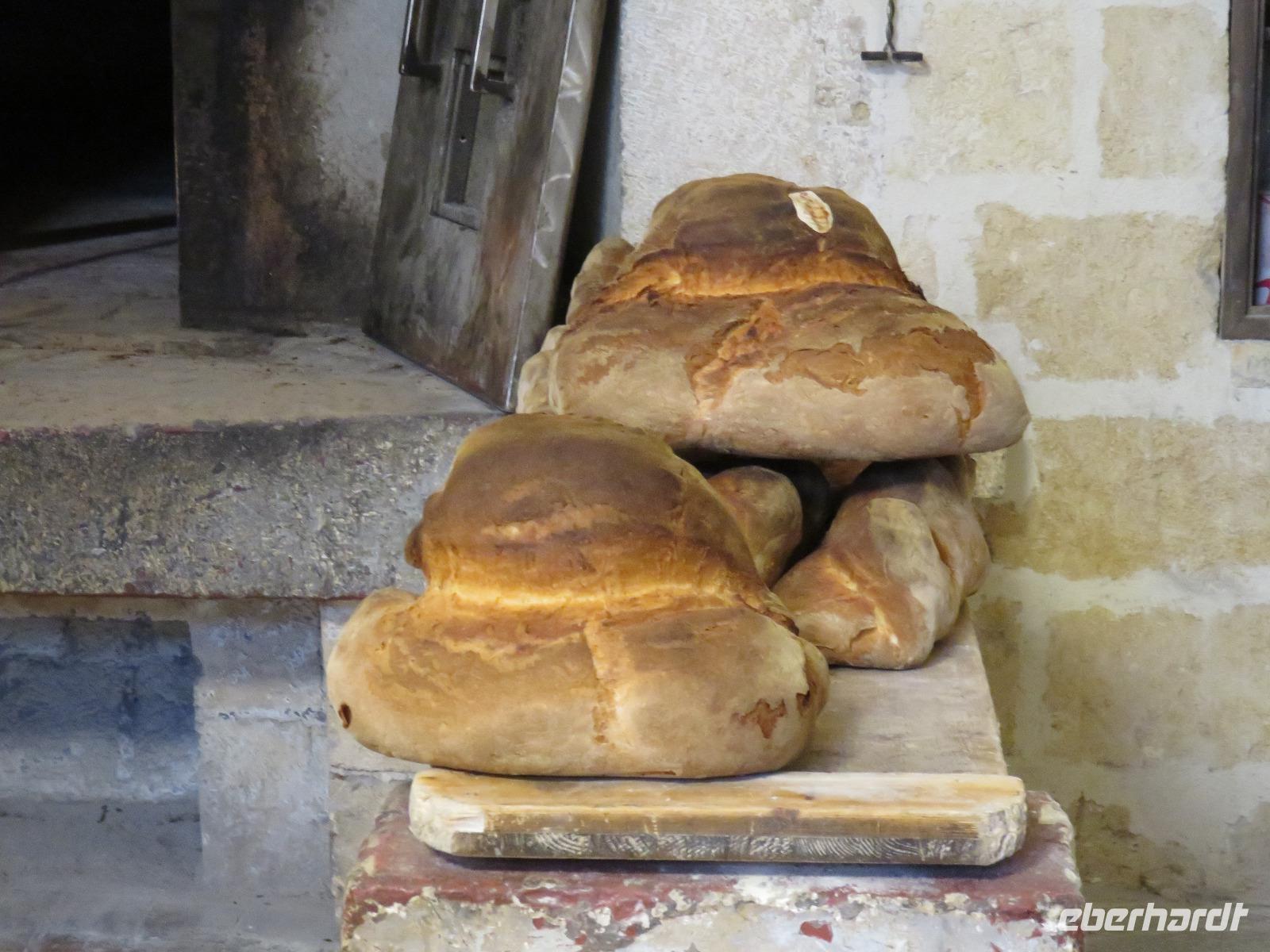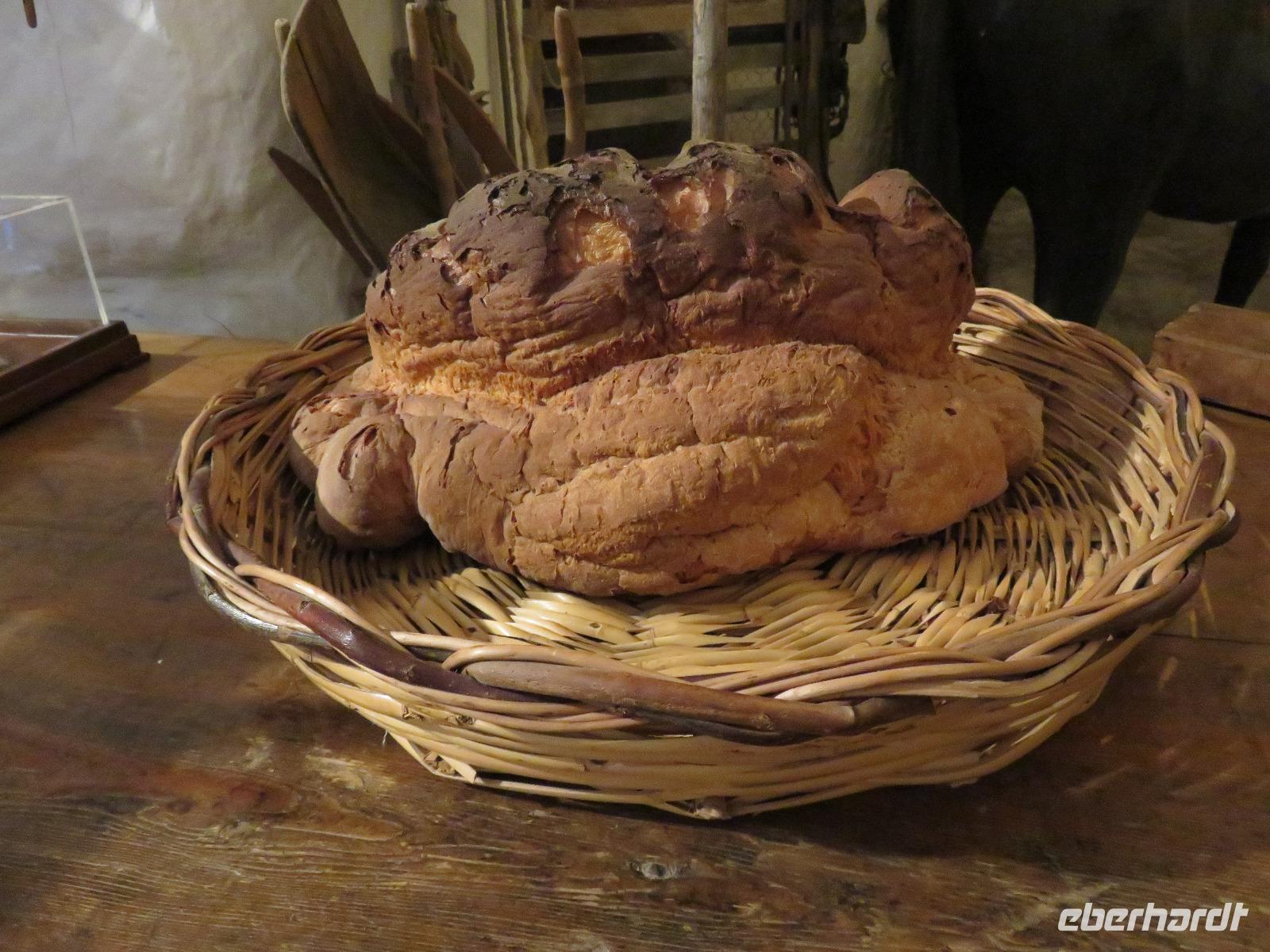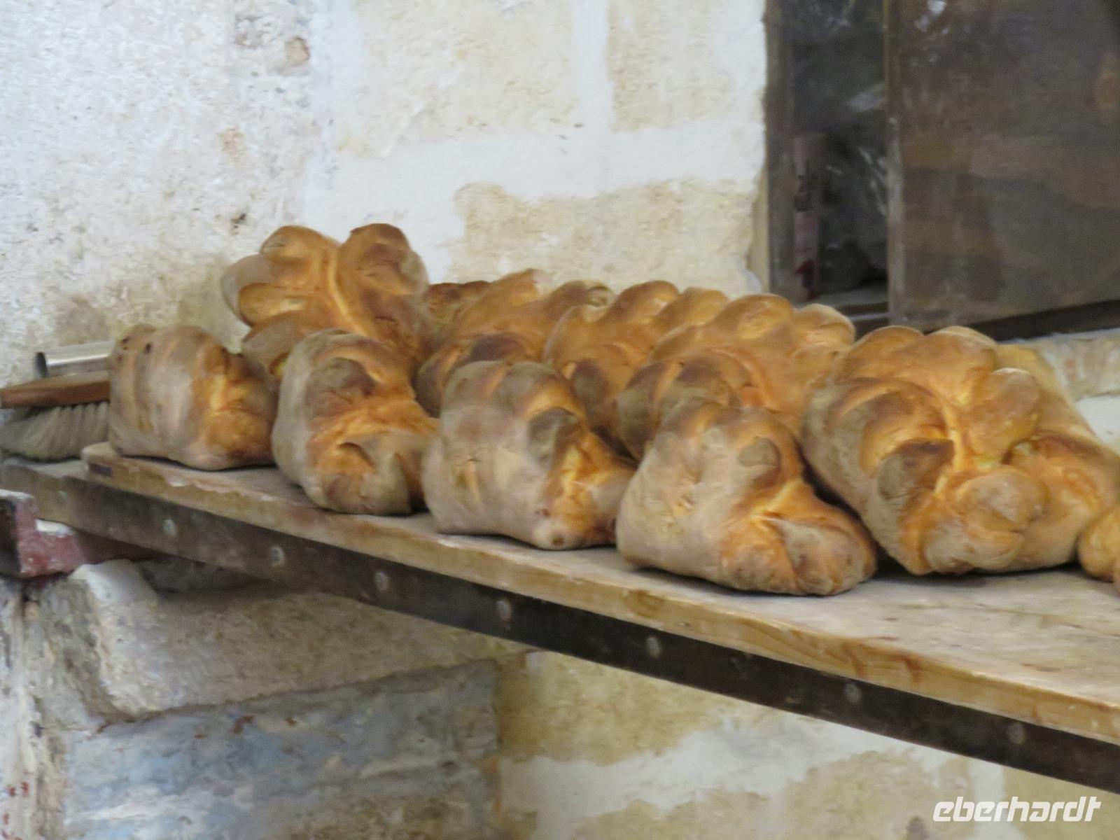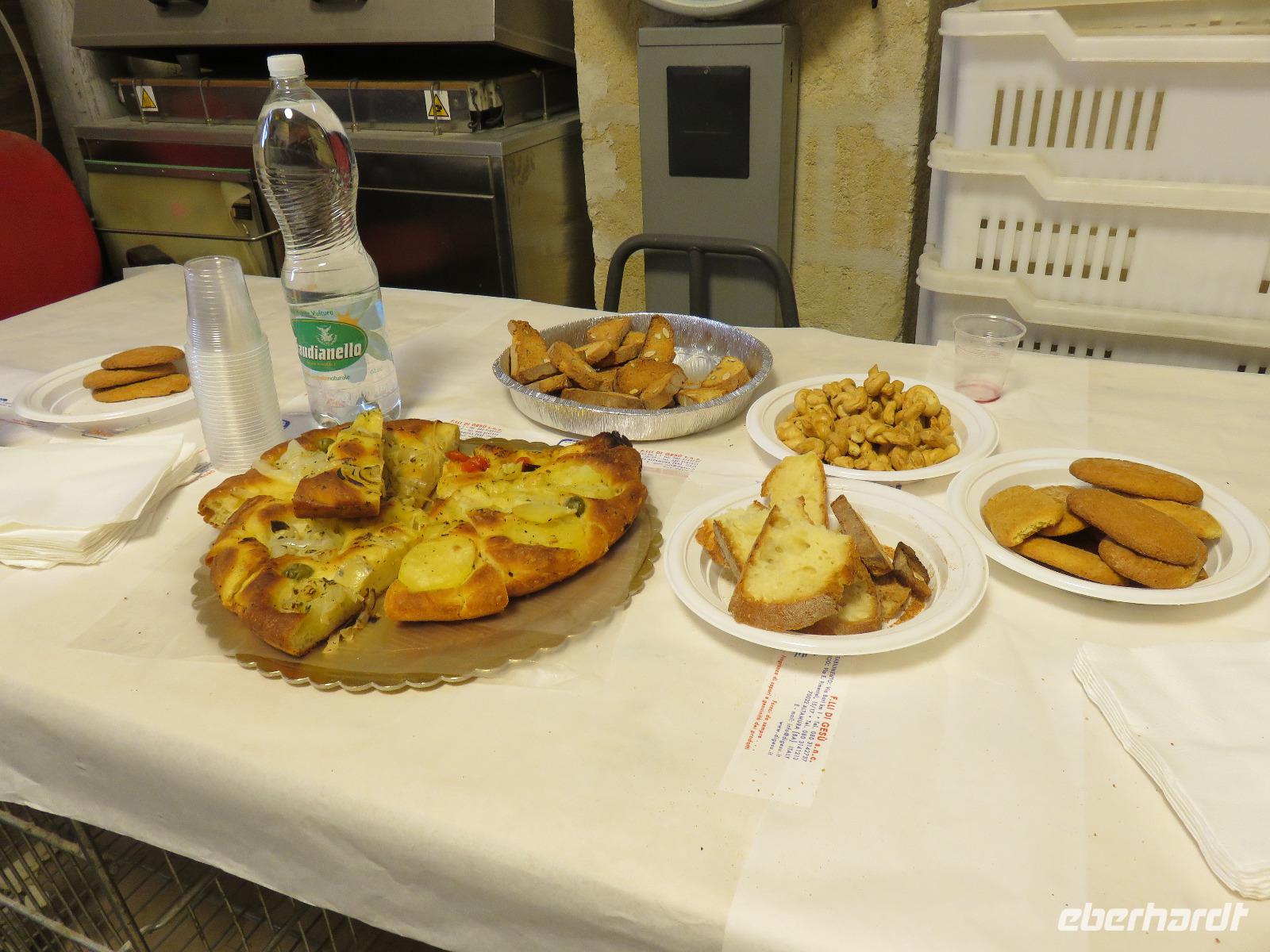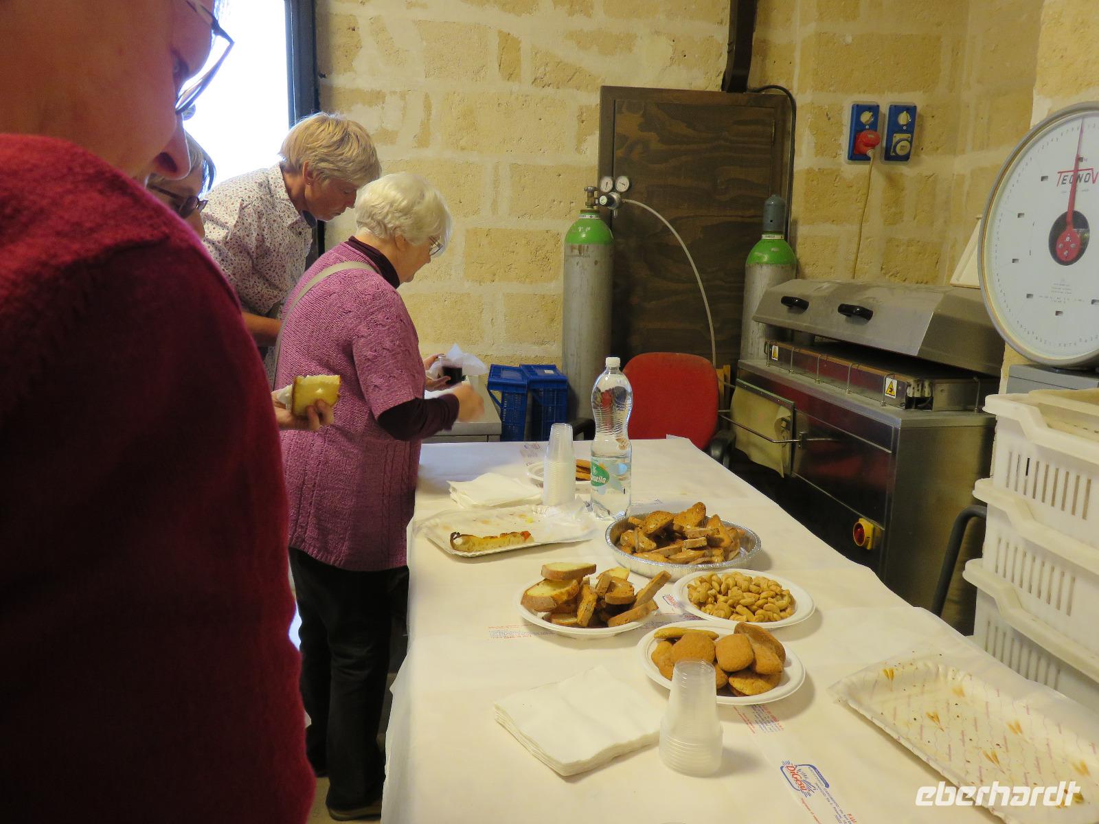 Was ist das? Heute hüllte sich die Umgebung des Hotels in dichtem Nebel. Mirella hatte in Altamura angerufen, dort scheint die Sonne. Also starteten wir wie immer früh zu unserem Tagesausflug. Bereits im Tal zeigte sich die Sonne und wir fuhren vorbei an der Stadt des Karnevals und der Hochzeitskleider-Designer Putignano nach Altamura, im Auftrag von Friedrich II. im 13. Jahrhundert gegründet. Wir betraten die Altstadt durch ein improvisiertes Stadttor und schlenderten durch die Gassen mit ihrem Blumenschmuck und den Claustri. Von diesen kleinen Höfen soll es noch 200 geben, die Mittelpunkt der Nachbarschaftsgemeinschaften sind. Unser Weg führte uns vorbei am Kloster zur Kathedrale S. Maria Assunta. Den Grundstein legte Friedrich II. 1232. Wir besichtigten die Rosette und das großartige Figurenportal mit der Szene des letzten Abendmahls und der Madonna mit dem Kind. Leider fand gerade die Messe statt. Deshalb konnten wir nur kurz in das Innere blicken. Wir nutzten den Weg entlang der Hauptstraße zum gegenüberliegenden Stadttor hinaus aus der Altstadt zur alten Bäckerei von Giovanni. Eigentlich gingen wir nun der Nase nach: das Aroma frischen Brotes! Wir betraten den Raum des Steinbackofens. In diesem Ofen werden bis zu 250 der Hartweizenbrote zur gleichen Zeit gebacken. Wir kamen genau zur rechten Zeit, als die Türen des Ofens geöffnet waren und ein Brot nach dem anderen den Backofen verließ. Ganz geschickt lenkten die Mitarbeiter die großen, langen Brotschieber in das tiefe, dunkle Ofeninnere und brachten die knusprig, frischen Brotlaibe heraus. Direkt am Backofen probierten wir Brot, Foccacia, Mandelgebäck, Zwieback mit Mandeln, Wasser und Wein. Giovanni gab uns umfangreiche Erläuterungen. Anschließend nutzten wir die Möglichkeit zum Einkauf im kleinen Geschäft der Bäckerei. Zurück führte uns unser Spaziergang zur Patisserie am Kloster. Wir liebten es nun, wie die Italiener, zwischendurch einen Espresso, einen Cappuccino oder einen Latte Macchiato zu trinken oder ein Gelati zu essen. Die Nonnen des Klosters verstanden es ebenfalls kleine, süße Köstlichkeiten anzufertigen.