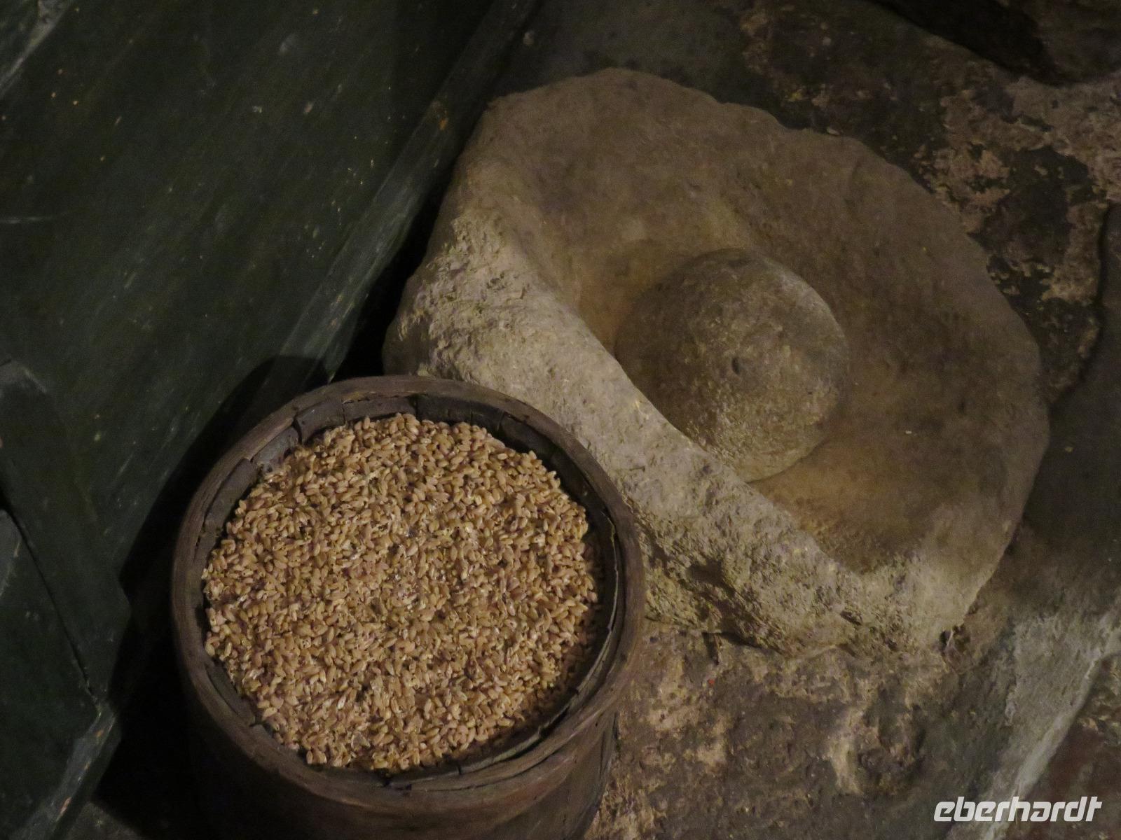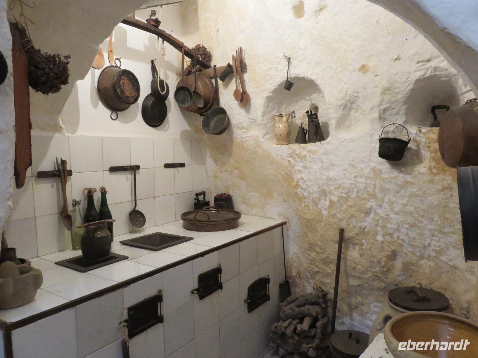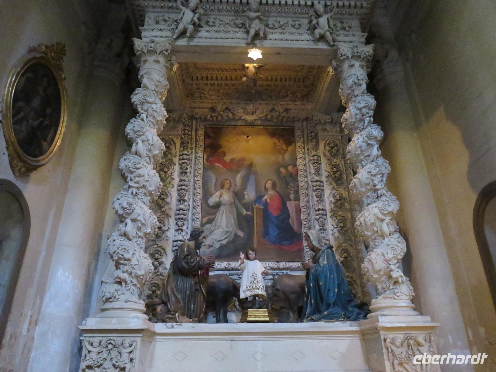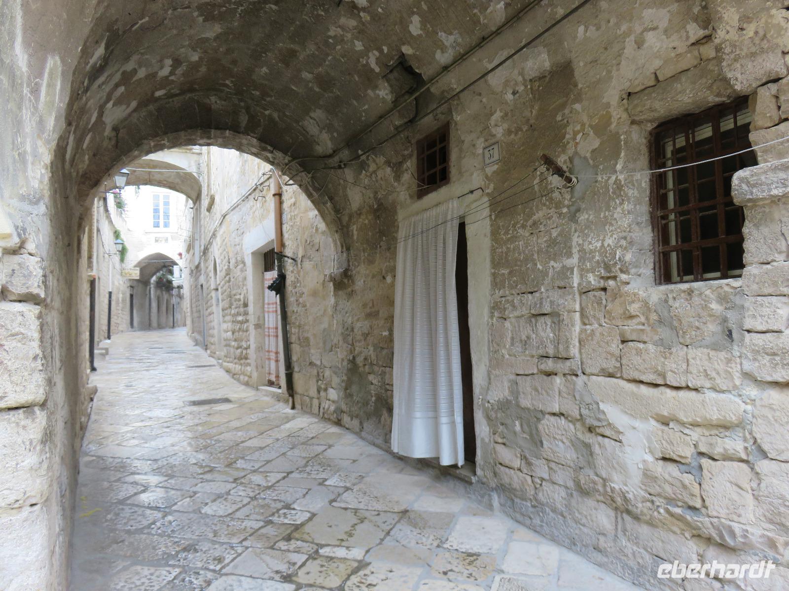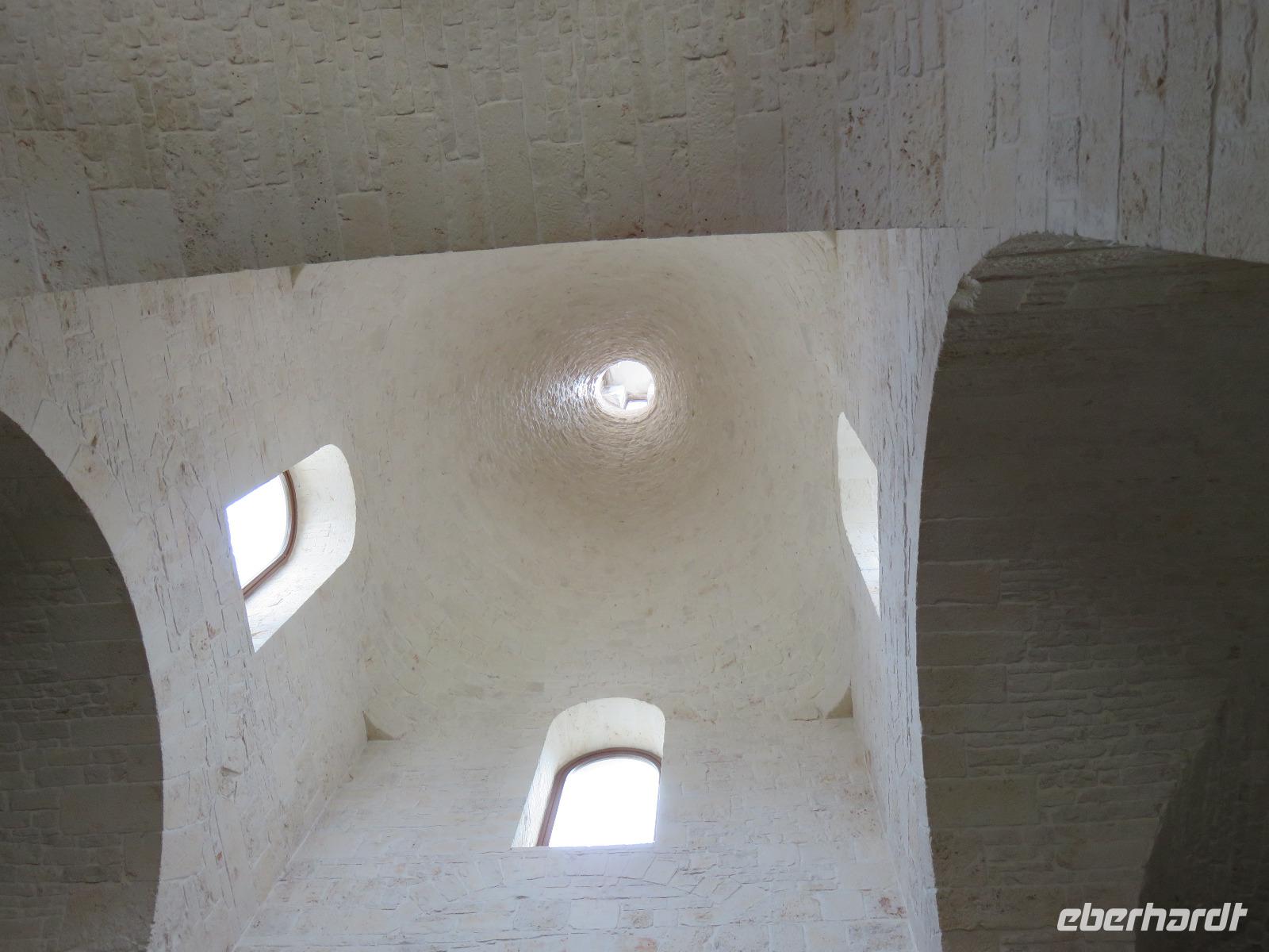 Was ist das? Heute hüllte sich die Umgebung des Hotels in dichtem Nebel. Mirella hatte in Altamura angerufen, dort scheint die Sonne. Also starteten wir wie immer früh zu unserem Tagesausflug. Bereits im Tal zeigte sich die Sonne und wir fuhren vorbei an der Stadt des Karnevals und der Hochzeitskleider-Designer Putignano nach Altamura, im Auftrag von Friedrich II. im 13. Jahrhundert gegründet. Wir betraten die Altstadt durch ein improvisiertes Stadttor und schlenderten durch die Gassen mit ihrem Blumenschmuck und den Claustri. Von diesen kleinen Höfen soll es noch 200 geben, die Mittelpunkt der Nachbarschaftsgemeinschaften sind. Unser Weg führte uns vorbei am Kloster zur Kathedrale S. Maria Assunta. Den Grundstein legte Friedrich II. 1232. Wir besichtigten die Rosette und das großartige Figurenportal mit der Szene des letzten Abendmahls und der Madonna mit dem Kind. Leider fand gerade die Messe statt. Deshalb konnten wir nur kurz in das Innere blicken. Wir nutzten den Weg entlang der Hauptstraße zum gegenüberliegenden Stadttor hinaus aus der Altstadt zur alten Bäckerei von Giovanni. Eigentlich gingen wir nun der Nase nach: das Aroma frischen Brotes! Wir betraten den Raum des Steinbackofens. In diesem Ofen werden bis zu 250 der Hartweizenbrote zur gleichen Zeit gebacken. Wir kamen genau zur rechten Zeit, als die Türen des Ofens geöffnet waren und ein Brot nach dem anderen den Backofen verließ. Ganz geschickt lenkten die Mitarbeiter die großen, langen Brotschieber in das tiefe, dunkle Ofeninnere und brachten die knusprig, frischen Brotlaibe heraus. Direkt am Backofen probierten wir Brot, Foccacia, Mandelgebäck, Zwieback mit Mandeln, Wasser und Wein. Giovanni gab uns umfangreiche Erläuterungen. Anschließend nutzten wir die Möglichkeit zum Einkauf im kleinen Geschäft der Bäckerei. Zurück führte uns unser Spaziergang zur Patisserie am Kloster. Wir liebten es nun, wie die Italiener, zwischendurch einen Espresso, einen Cappuccino oder einen Latte Macchiato zu trinken oder ein Gelati zu essen. Die Nonnen des Klosters verstanden es ebenfalls kleine, süße Köstlichkeiten anzufertigen.