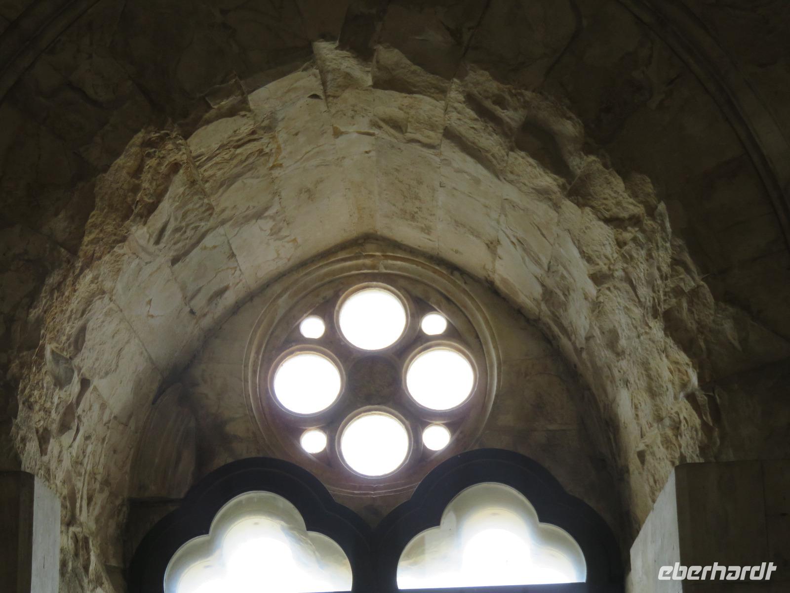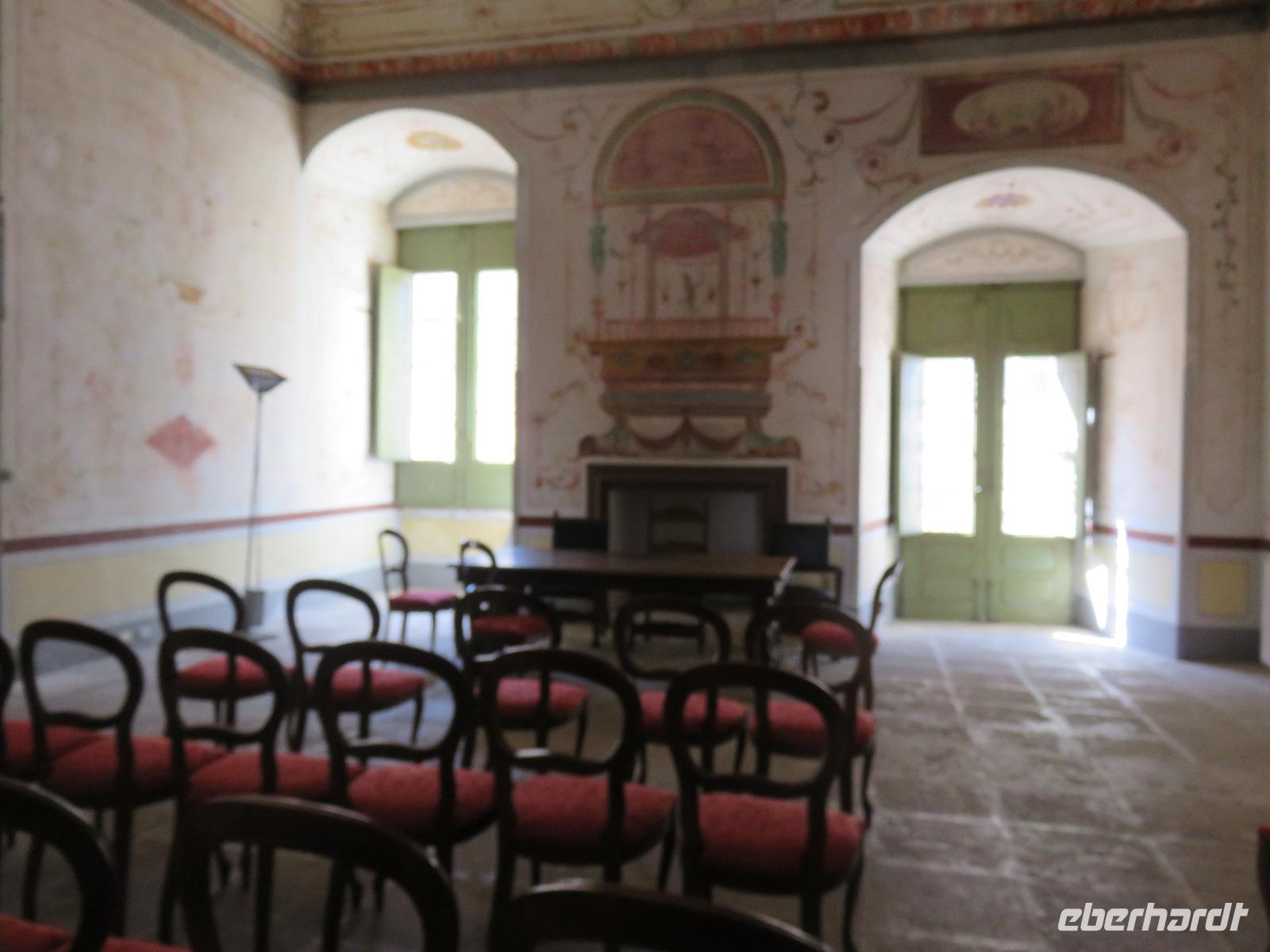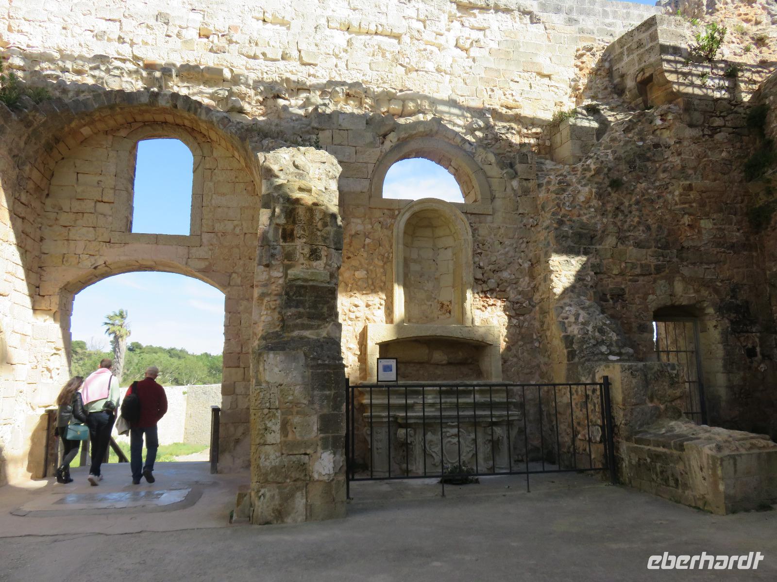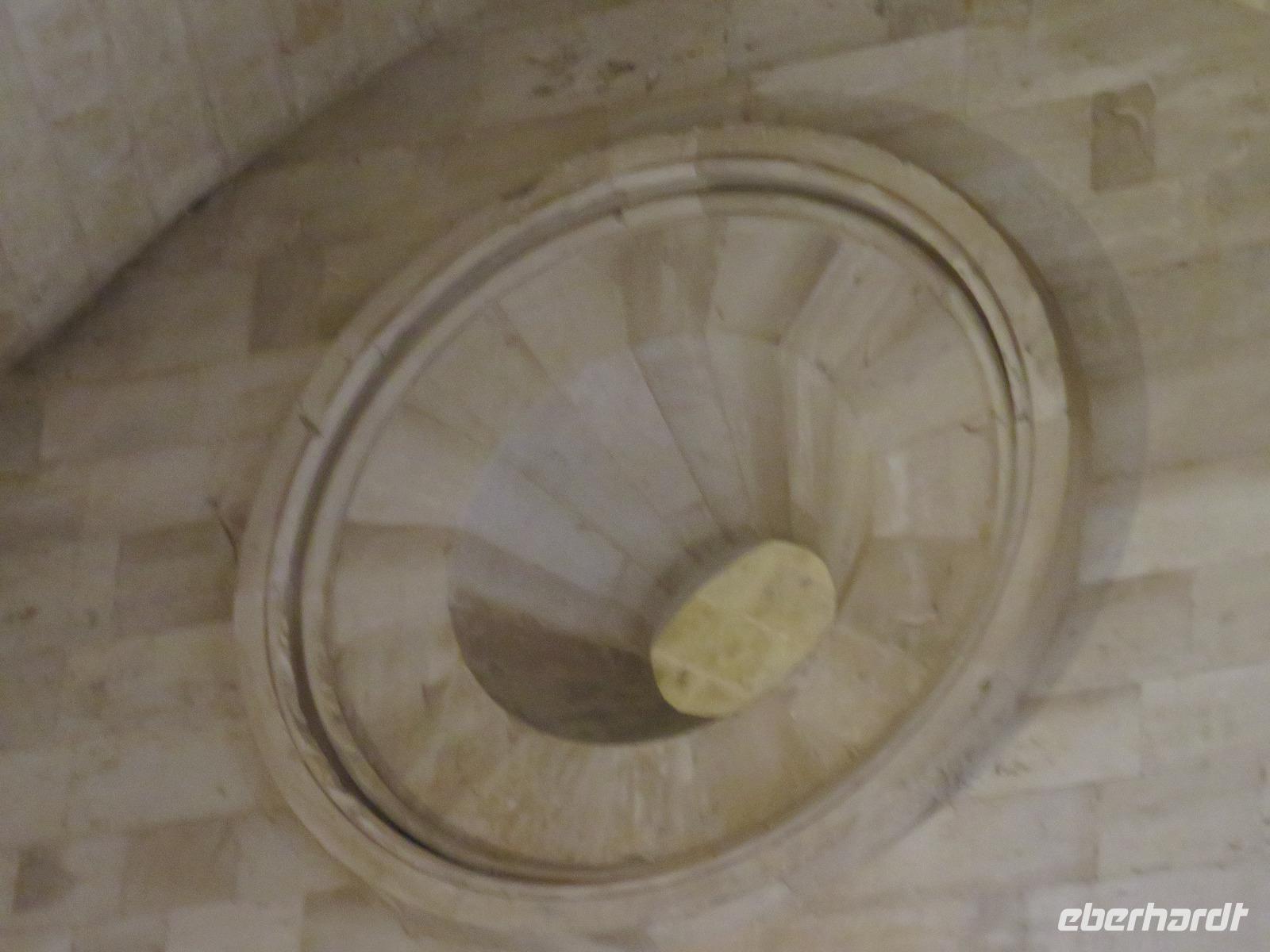 Das Schloss ist aus hellem Kalkstein errichtet, als Schmuck am Portal der Außenfassade leuchteten uns eingeschlossene Muscheln entgegen. Wir besichtigten kurz den achteckigen nach oben offenen Innenhof, begaben uns aber schnell in das Innere des Gebäudes. Mariella berichtet über Friedrich II. und die Kreuzzüge, über den Bau, die Nutzung und die Mystik des Schlosses aus dem 13. Jahrhundert - vieles Legende und Tatsachen; nicht alle Rätsel der Geschichte sind gelöst, sind noch Gegenstand von Forschungen ... Immer kehrt die Zahl Acht wieder. Wir stiegen die 42 Stufen in die zweite Etage hinauf und erblickten die Gewölbe, die beheizbaren Sitzbänke, die Kamine, das System der Belüftung, die Toiletten ... Gelehrte berichten, dass dieses Schloss in seinem Komfort für die damalige Zeit fast luxuriös gewesen sein soll. Natürlich gehört diese gewaltige Anlage heute zu den Nationalen Monumenten Italiens und seit 1996 zum UNESCO-Weltkulturerbe. Selbst auf dem 1-Cent-Stück ist das Castel verewigt. Unser Vorhaben das Castel zu Fuß zu umrunden und den Blick in die Ebene zu genießen, mussten wir leider aufgeben. Wind und Regen ermöglichten uns dies nicht. Und so gingen wir hinab bis zum Shuttle oder ganz zum Parkplatz. Schnell in den warmen Bus! Gianni hatte etwas geheizt, denn das Thermometer zeigt nur 5°C. Das hatten wir uns eigentlich ganz anders vorgestellt.