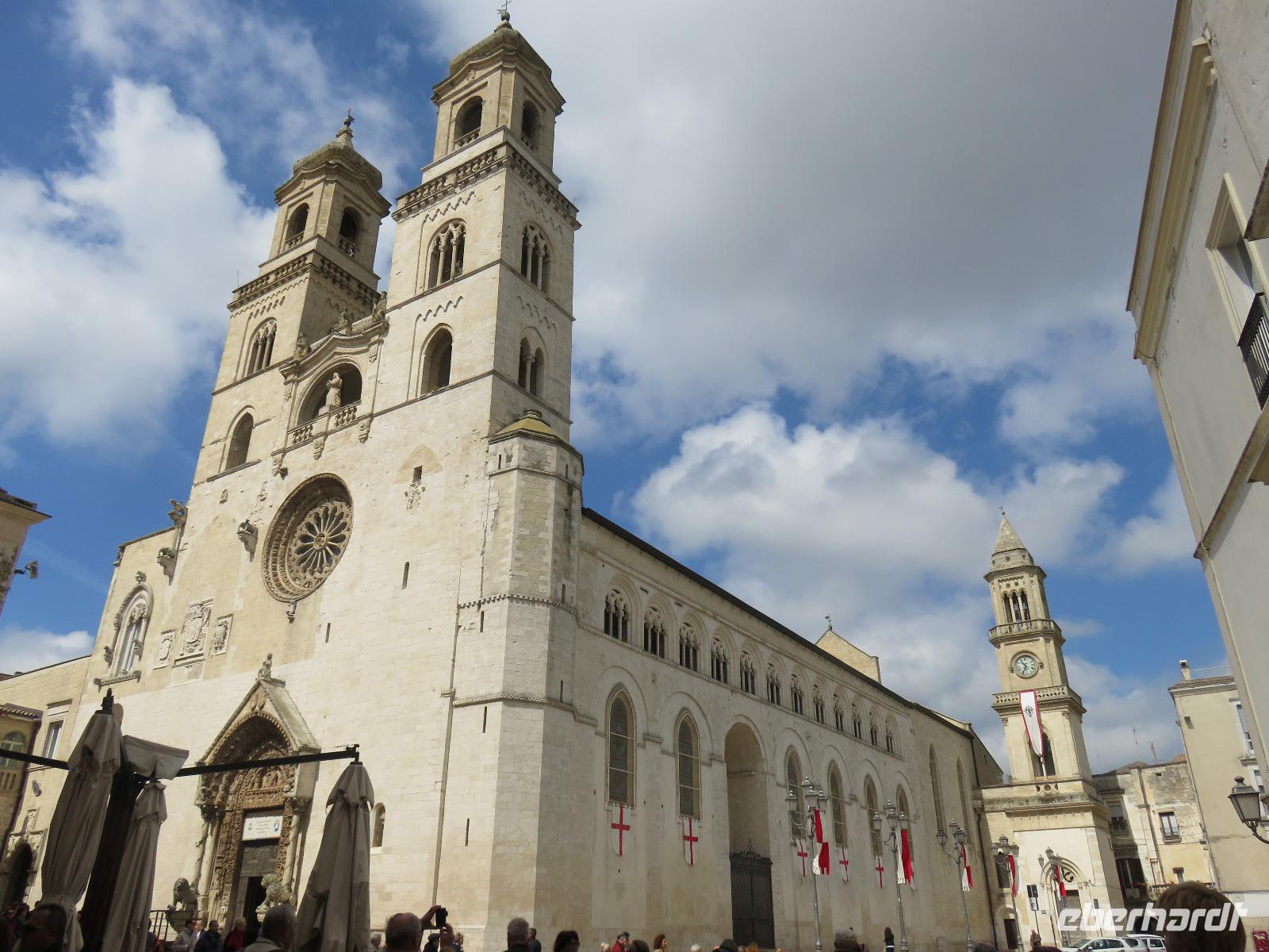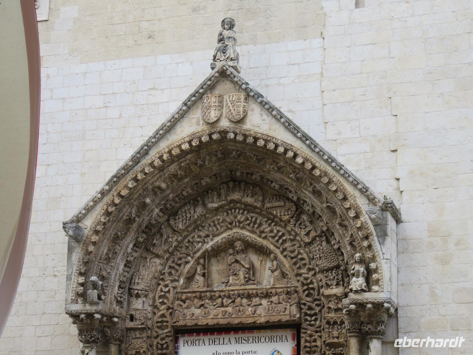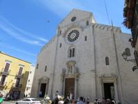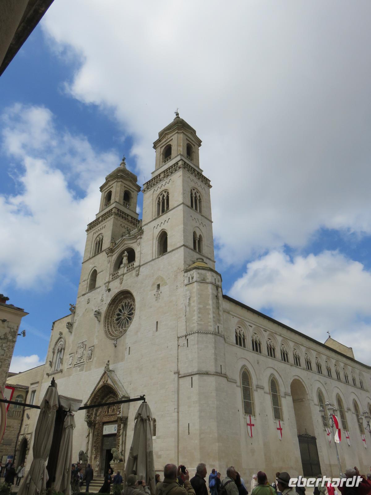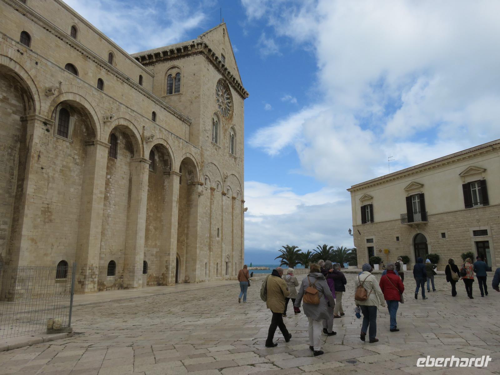 Auf dem Fahrweg zur Hafenstadt Trani an der Costa di Bari beruhigte sich das Wetter etwas und wir konnten trocken unseren Weg zur Promenade am Hafen antreten. Es war Zeit für unsere Mittagspause und wir wieder optimistisch, einen sonnigen Nachmittag zu erleben. Aber da heute Feiertag ist, gestaltete sich die Suche nach einem Plätzchen in den Restaurants nicht ganz so einfach und wegen des Regens hatten sich die Gaststätten auf Innenbetrieb eingestellt. Wir entschieden uns für ein Panini im Restaurant „Babalú". Was wurden wir freundlich vom Wirt begrüßt, er zeigte uns Fotos von seinem Opa Benno aus Bautzen. Er hatte mit seiner Frau aus Dresden erst vor kurzem das Restaurant übernommen. Seine Frau bedankte sich telefonisch, dass wir in ihrem Restaurant zu Gast sind. Manchmal ist die Welt ganz klein. Oder es gibt völlig unerwartete Überraschungen, hatte uns unser Plaudern auf sächsisch etwas verraten. Wir speisten schnell und gut. So konnten wir uns gestärkt mit Mirella auf Stadtbummel begeben. Wir gingen durch das Jüdisches Viertel weiter zum gewaltigen Stauferkastell, auch im Auftrag von Friedrich II. errichtet. Viele Informationen erhielten wir zur Familie von Friedrich II. und seinem Sohn Manfred, der im großen Festsaal seine Hochzeit mit Helena von Epiros gefeiert hat. Da es nun in großen Tropfen regnete und es zudem stürmte, zogen wir es vor, sofort die Kathedrale S. Nicola Pellegrino mit den beiden Unterkirchen zu besichtigen. Uns beeindruckten der gewaltige Innenraum der Kirche, die auf der Vorläuferkirche S. Maria della Scala errichtet ist, und die um 1180 angefertigte Bronzetür. Meister Barisanus von Trani hatte zum ersten Mal Figuren im Relief herausgearbeitet und nicht nur im Umriss. Das macht diese Tür kunsthistorisch so wertvoll. Die größte frühchristliche Kirche Apuliens (S. Maria della Scala) ist heute Unterkirche der Kathedrale. In der Hallenkrypta bestaunten wir die Reliquien des hl. Nikolaus des Pilgers. Nach dieser eindrucksvollen Besichtigung spazierten wir zur Piazza Chiarelli, wo uns Gianni zur Rückfahrt erwartete. Im Hotel zurückgekehrt, wärmten wir uns auf. Eigentlich heißt es doch, wenn Engel verreisen ... uns hatte offensichtlich die polare Kaltluft aus Deutschland erreicht.