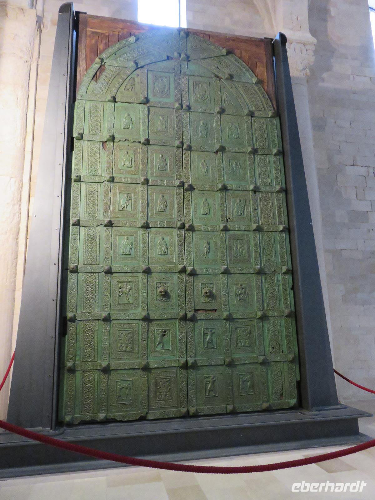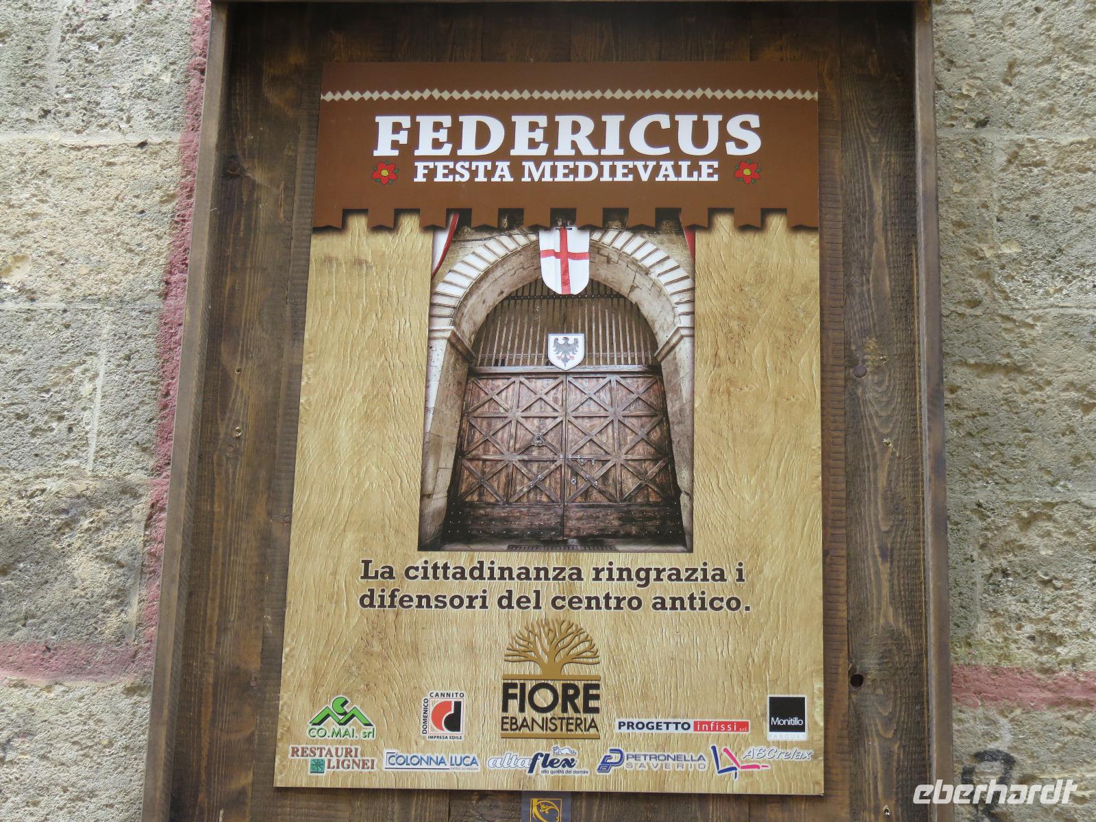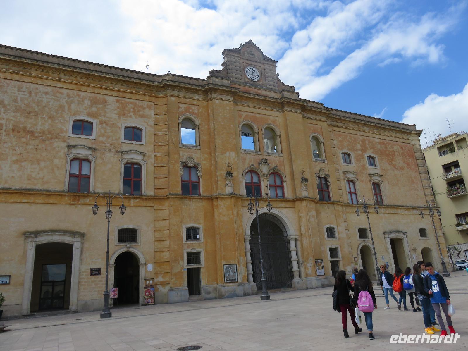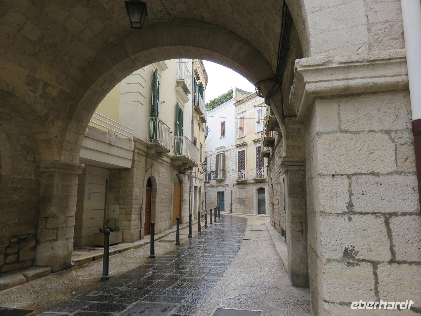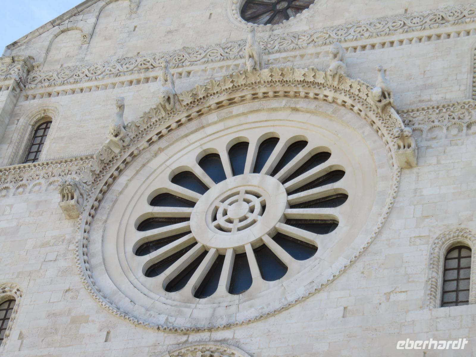 Auf dem Fahrweg zur Hafenstadt Trani an der Costa di Bari beruhigte sich das Wetter etwas und wir konnten trocken unseren Weg zur Promenade am Hafen antreten. Es war Zeit für unsere Mittagspause und wir wieder optimistisch, einen sonnigen Nachmittag zu erleben. Aber da heute Feiertag ist, gestaltete sich die Suche nach einem Plätzchen in den Restaurants nicht ganz so einfach und wegen des Regens hatten sich die Gaststätten auf Innenbetrieb eingestellt. Wir entschieden uns für ein Panini im Restaurant „Babalú". Was wurden wir freundlich vom Wirt begrüßt, er zeigte uns Fotos von seinem Opa Benno aus Bautzen. Er hatte mit seiner Frau aus Dresden erst vor kurzem das Restaurant übernommen. Seine Frau bedankte sich telefonisch, dass wir in ihrem Restaurant zu Gast sind. Manchmal ist die Welt ganz klein. Oder es gibt völlig unerwartete Überraschungen, hatte uns unser Plaudern auf sächsisch etwas verraten. Wir speisten schnell und gut. So konnten wir uns gestärkt mit Mirella auf Stadtbummel begeben. Wir gingen durch das Jüdisches Viertel weiter zum gewaltigen Stauferkastell, auch im Auftrag von Friedrich II. errichtet. Viele Informationen erhielten wir zur Familie von Friedrich II. und seinem Sohn Manfred, der im großen Festsaal seine Hochzeit mit Helena von Epiros gefeiert hat. Da es nun in großen Tropfen regnete und es zudem stürmte, zogen wir es vor, sofort die Kathedrale S. Nicola Pellegrino mit den beiden Unterkirchen zu besichtigen. Uns beeindruckten der gewaltige Innenraum der Kirche, die auf der Vorläuferkirche S. Maria della Scala errichtet ist, und die um 1180 angefertigte Bronzetür. Meister Barisanus von Trani hatte zum ersten Mal Figuren im Relief herausgearbeitet und nicht nur im Umriss. Das macht diese Tür kunsthistorisch so wertvoll. Die größte frühchristliche Kirche Apuliens (S. Maria della Scala) ist heute Unterkirche der Kathedrale. In der Hallenkrypta bestaunten wir die Reliquien des hl. Nikolaus des Pilgers. Nach dieser eindrucksvollen Besichtigung spazierten wir zur Piazza Chiarelli, wo uns Gianni zur Rückfahrt erwartete. Im Hotel zurückgekehrt, wärmten wir uns auf. Eigentlich heißt es doch, wenn Engel verreisen ... uns hatte offensichtlich die polare Kaltluft aus Deutschland erreicht.
