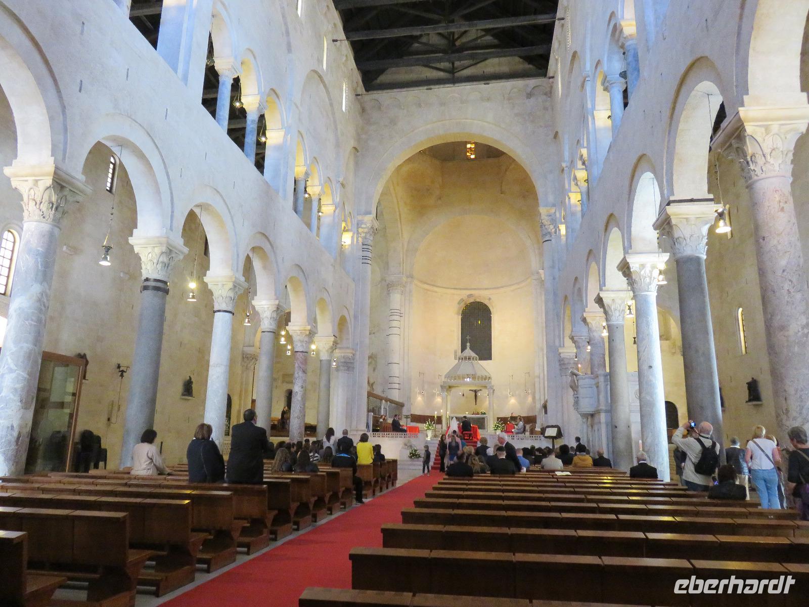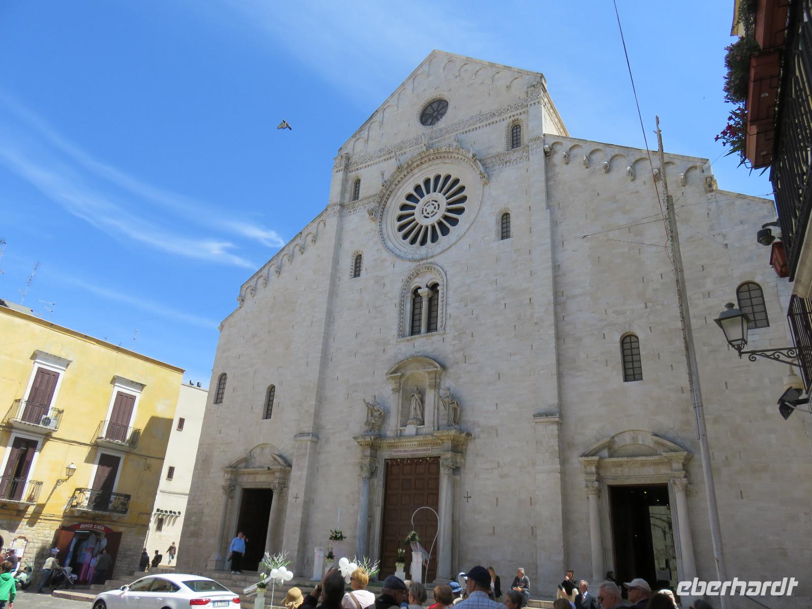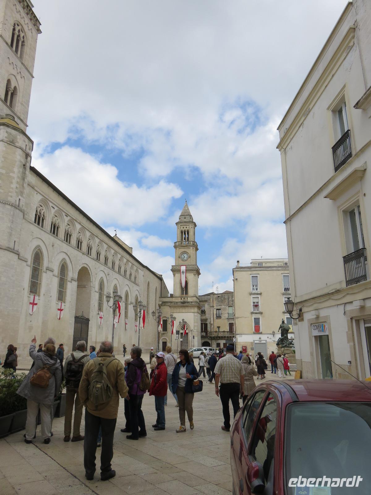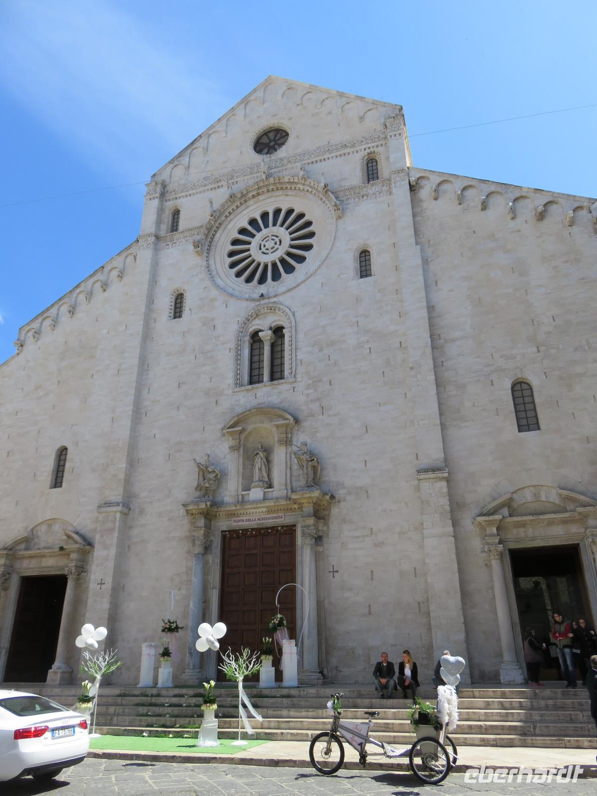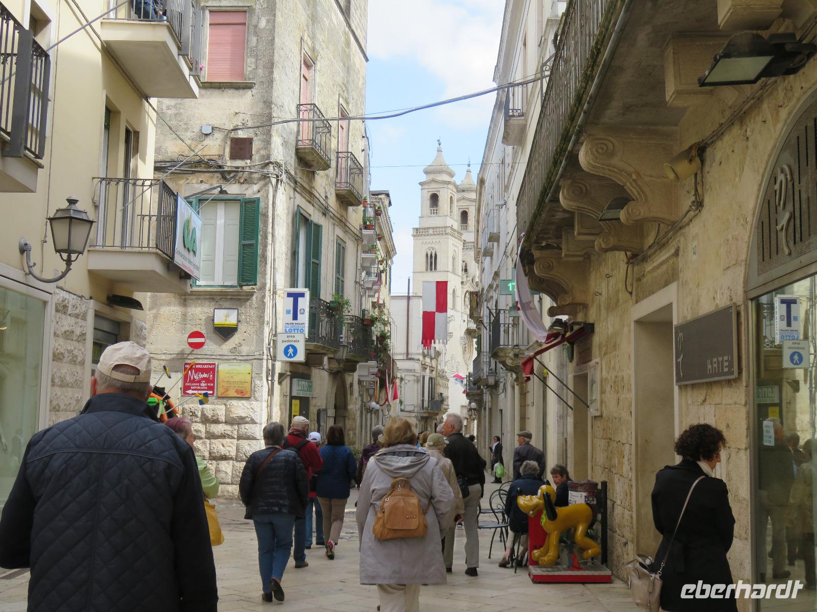 In der Kathedrale S. Sabino fand gerade eine Hochzeitsfeier statt. Wir konnten die Krypta besichtigen. Weiter führte uns unsere Besichtigungstour zur Basilika S. Nicola. Der Bau wurde in dem Jahr begonnen als die Reliquien des Heiligen Nikolaus nach Bari kamen. Am heutigen Samstag fand auch in dieser Kirche eine Hochzeit statt. Deshalb begaben wir uns in die Unterkirche, dort wo die Gebeine des Heiligen Nikolaus aufbewahrt werden. Mirella berichtete ausführlich zu Geschichte seiner Legende. Er gilt als Schutzpatron der Kaufleute und der Seefahrer, als Kinderfreund und Weihnachtsmann. Und so waren es auch 62 Seeleute aus Bari, die die Gebeine aus Kleinasien, aus Myra, dem heutigen Demre, raubten und nach Italien brachten. Alljährlich vom 7. bis 9. Mai findet in Bari ein großes Fest zu Ehren des Heiligen Nikolaus statt. Die Vorbereitungen waren gerade in vollem Gang.